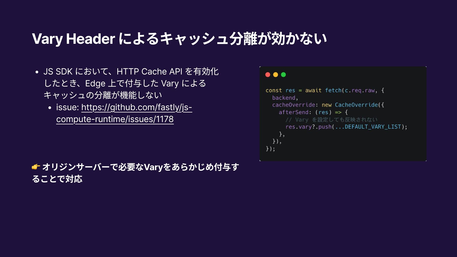 上で付与した Vary による キャッシュの分離が機能しない issue: https://github.com/fastly/js- compute-runtime/issues/1178 オリジンサーバーで必要なVaryをあらかじめ付与す ることで対応