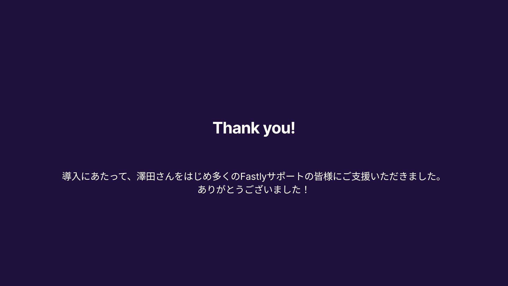 Thank you! 導入にあたって、澤田さんをはじめ多くのFastlyサポートの皆様にご支援いただきました。 ありがとうございました!