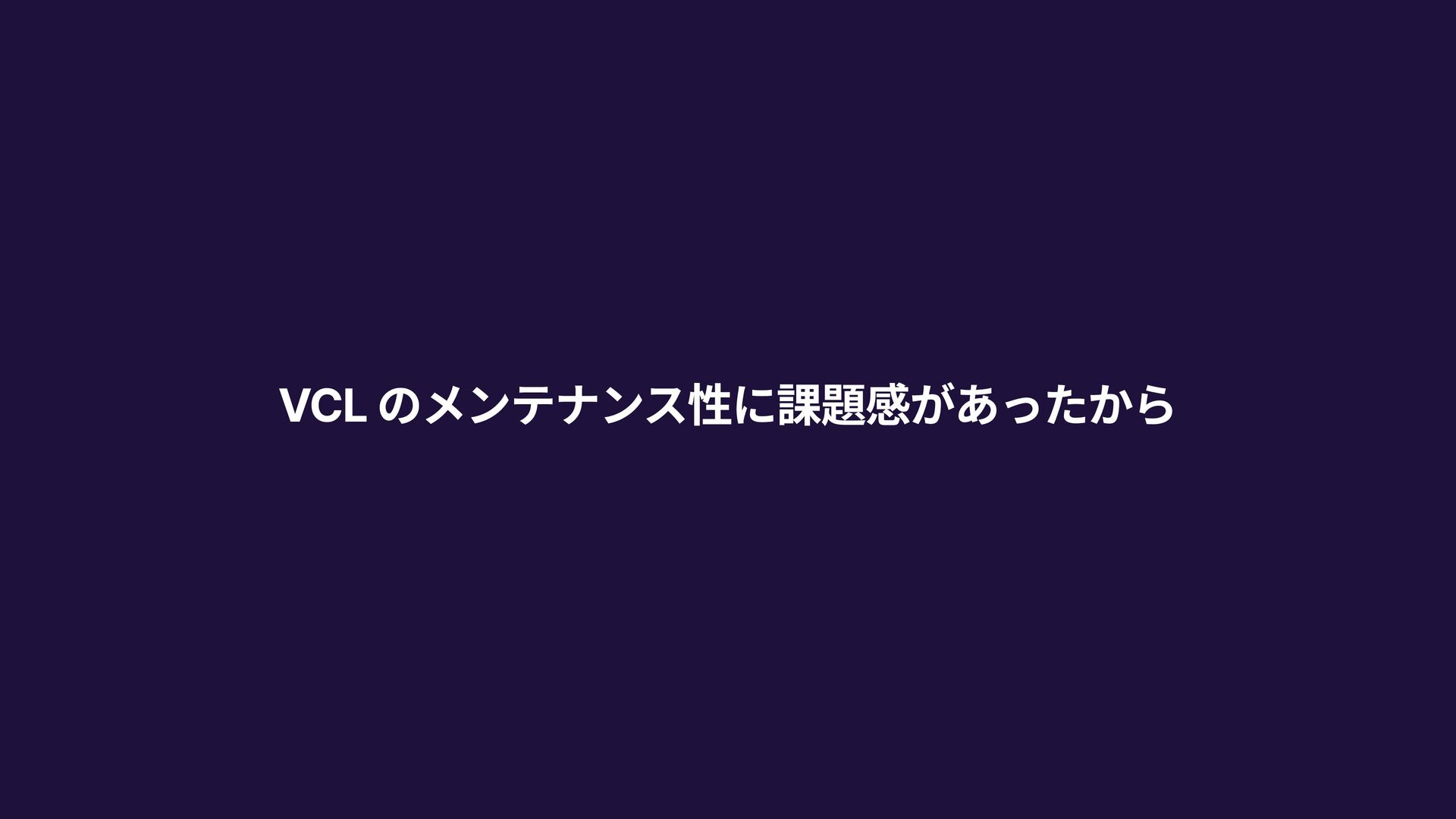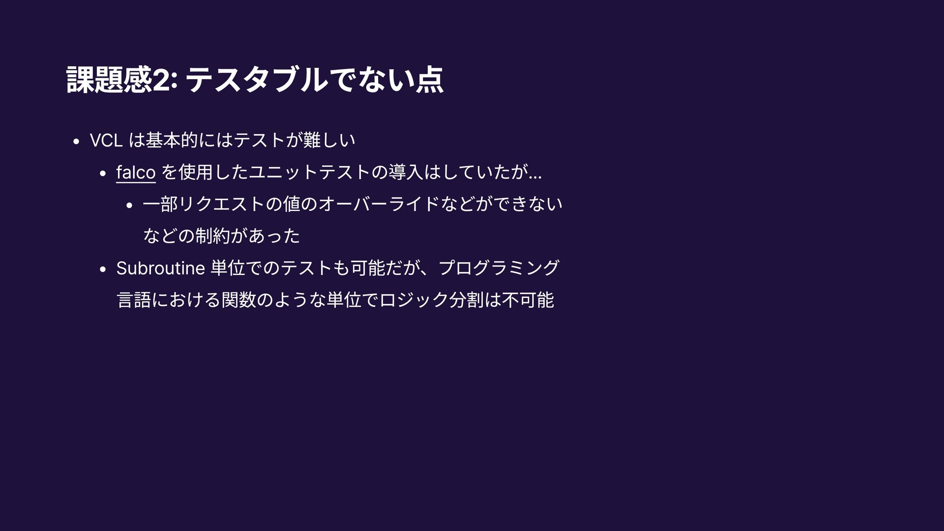 VCL は基本的にはテストが難しい falco を使用したユニットテストの導入はしていたが... 一部リクエストの値のオーバーライドなどができない などの制約があった Subroutine 単位でのテストも可能だが、プログラミング 言語における関数のような単位でロジック分割は不可能 課題感2: