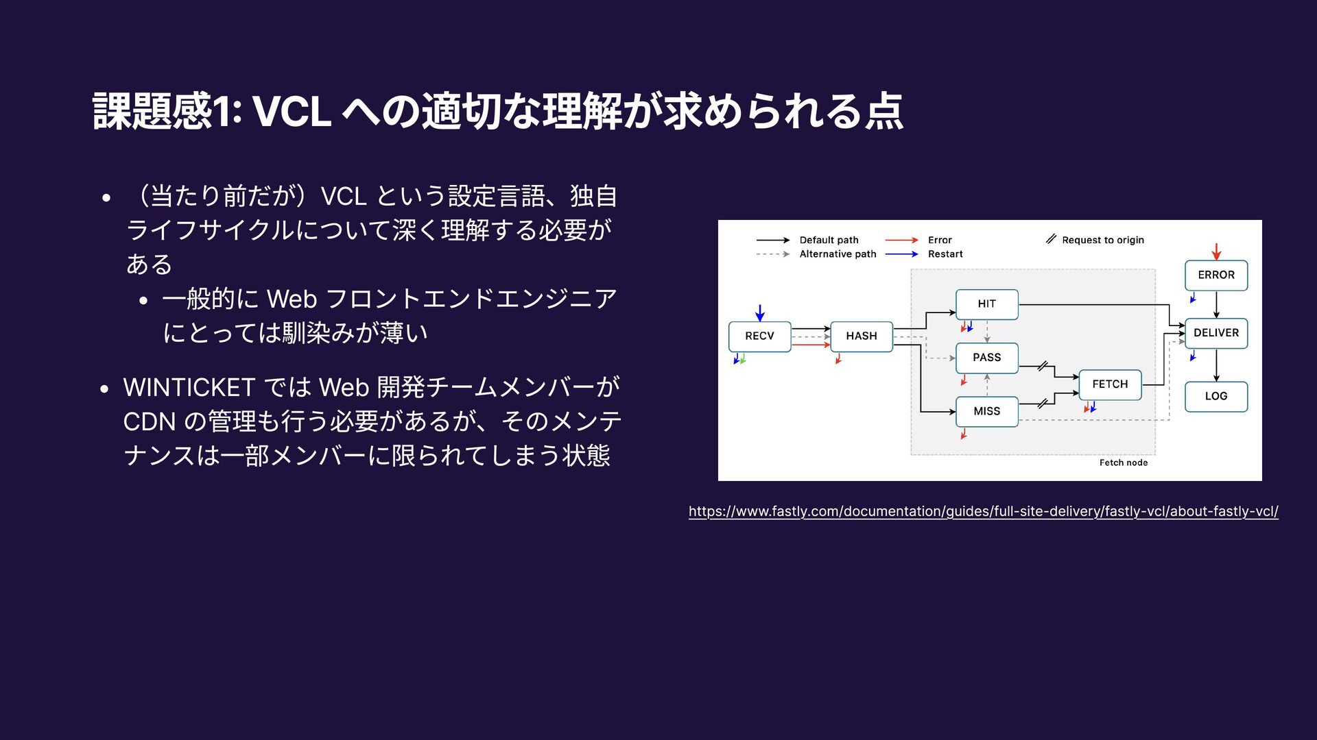 (当たり前だが)VCL という設定言語、独自 ライフサイクルについて深く理解する必要が ある 一般的に Web フロントエンドエンジニア にとっては馴染みが薄い WINTICKET では