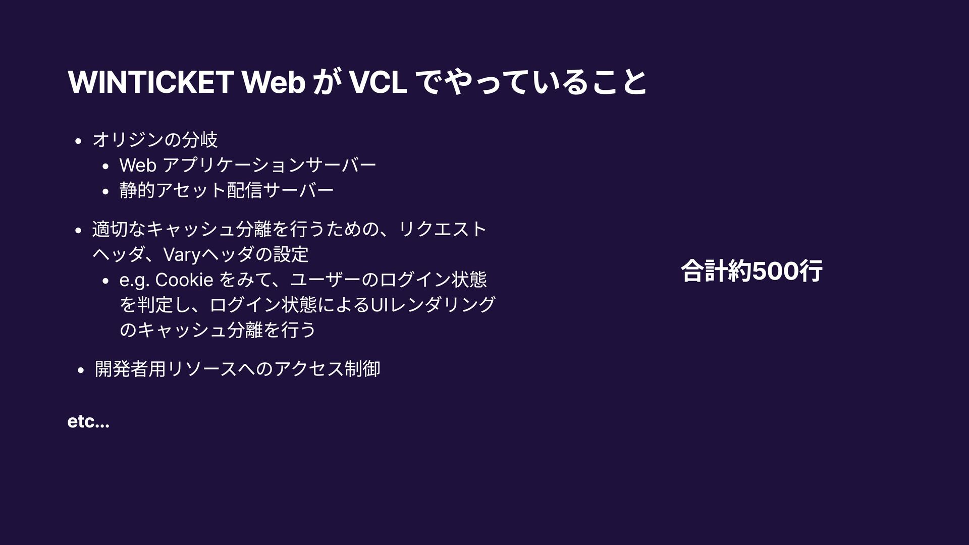 のキャッシュ分離を行う 開発者用リソースへのアクセス制御 etc... 合計約500行 WINTICKET Web が VCL でやっていること