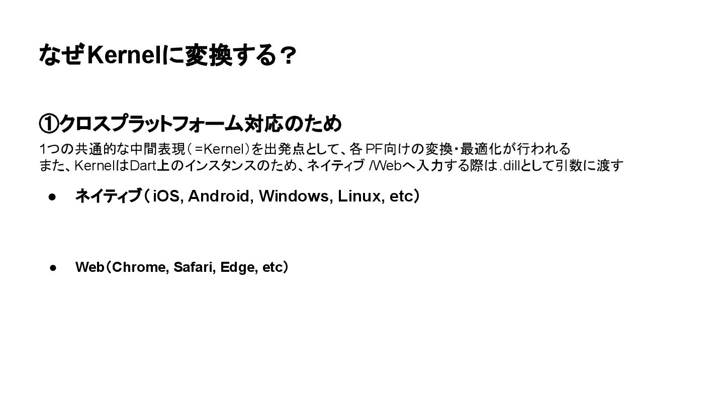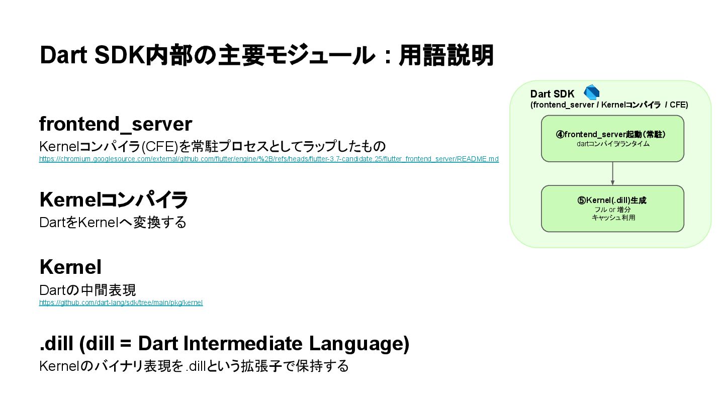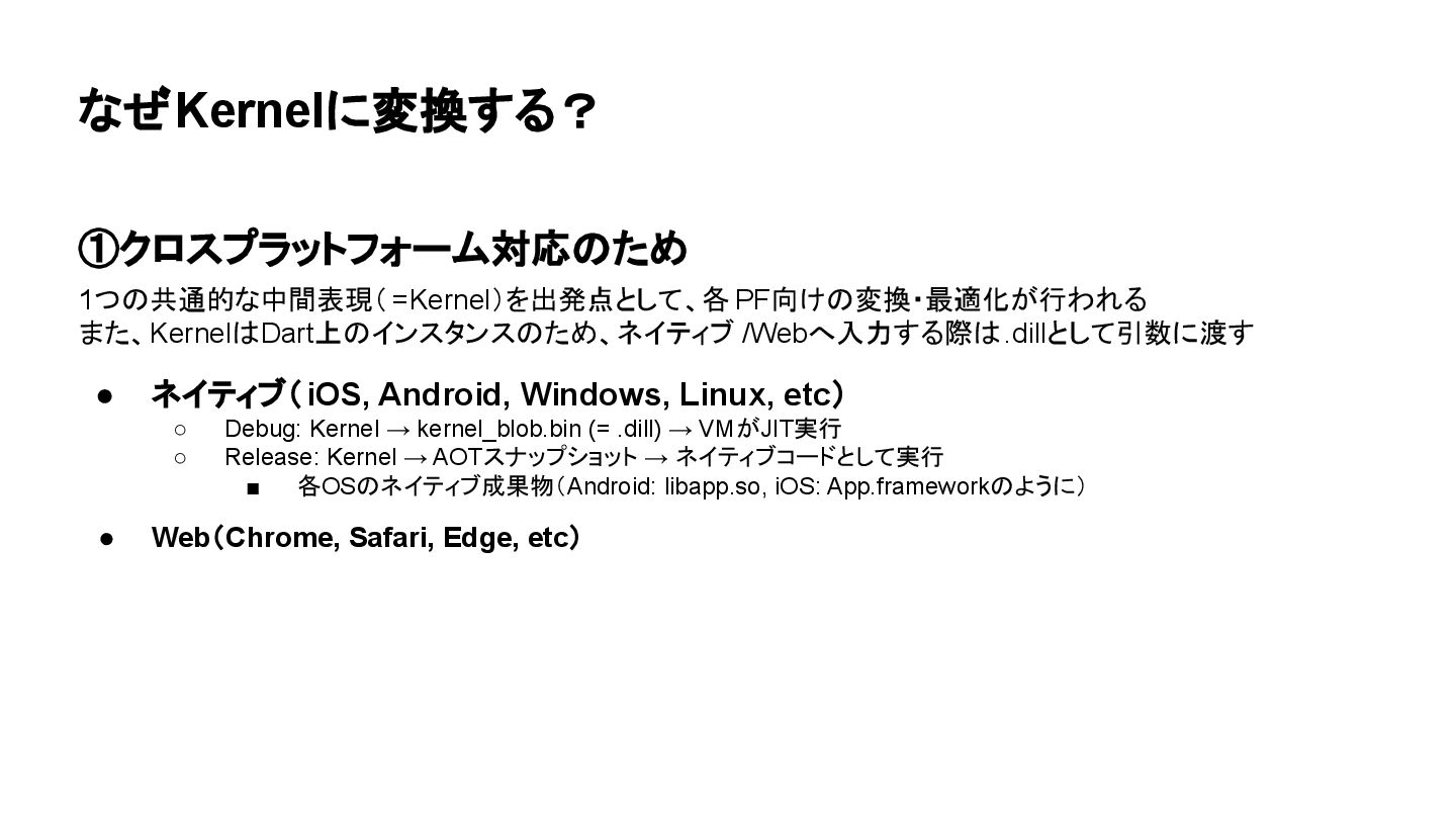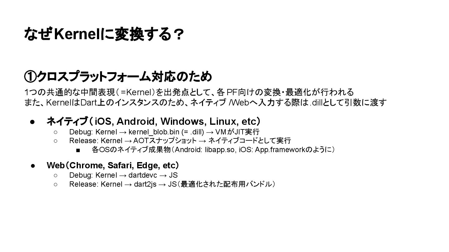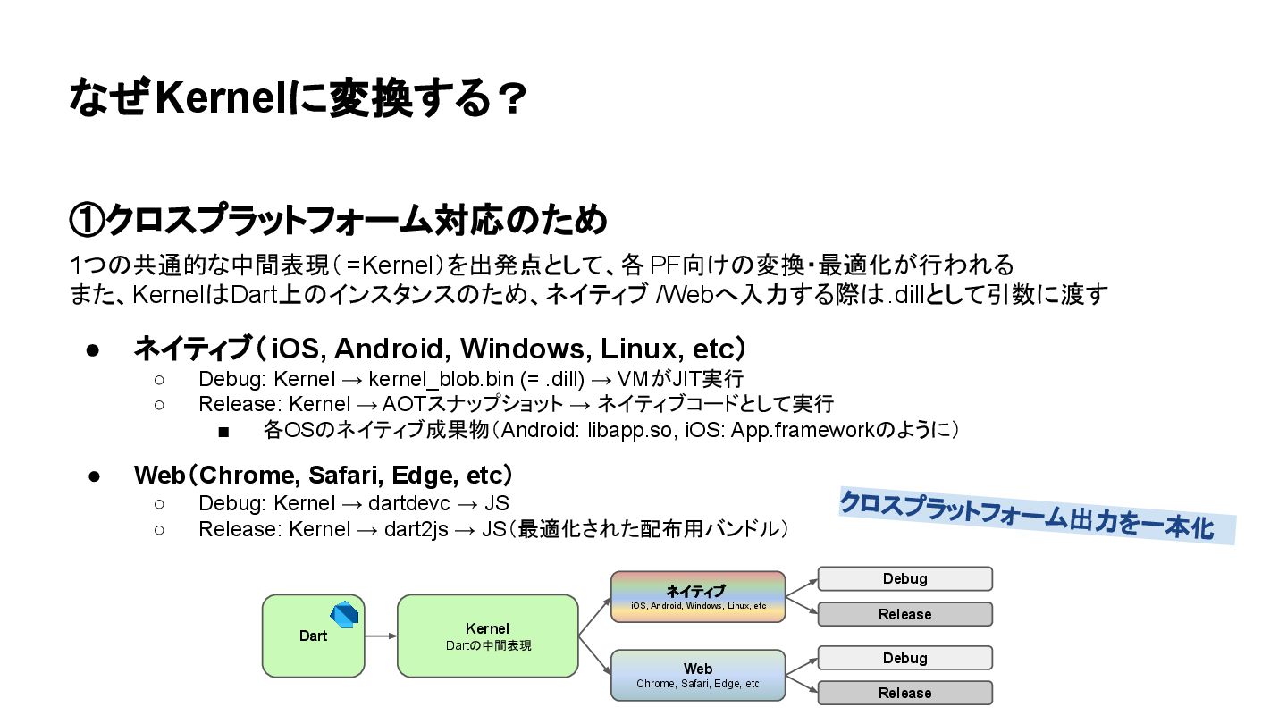 Windows, Linux, etc) ◦ Debug: Kernel → kernel_blob.bin (= .dill) → VMがJIT実行 ◦ Release: Kernel → AOTスナップショット → ネイティブコードとして実行 ▪ 各OSのネイティブ成果物(Android: libapp.so, iOS: App.frameworkのように) • Web(Chrome, Safari, Edge, etc) ◦ Debug: Kernel → dartdevc → JS ◦ Release: Kernel → dart2js → JS(最適化された配布用バンドル) Kernel Dartの中間表現 ネイティブ iOS, Android, Windows, Linux, etc Web Chrome, Safari, Edge, etc Dart Debug Release Debug Release クロスプラットフォーム出力を一本化