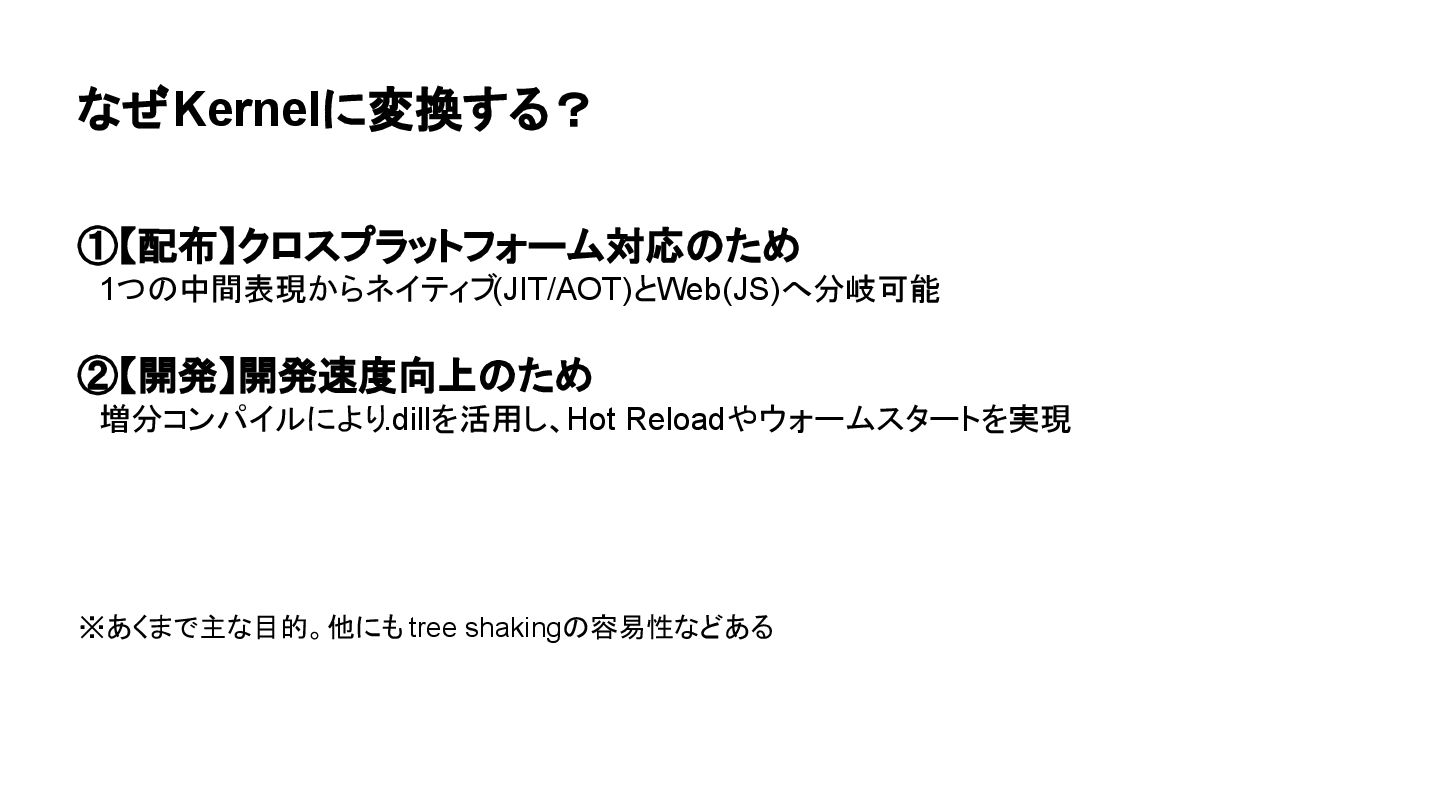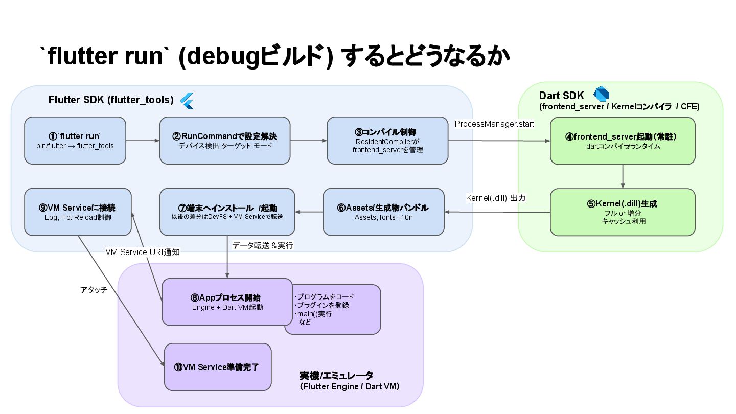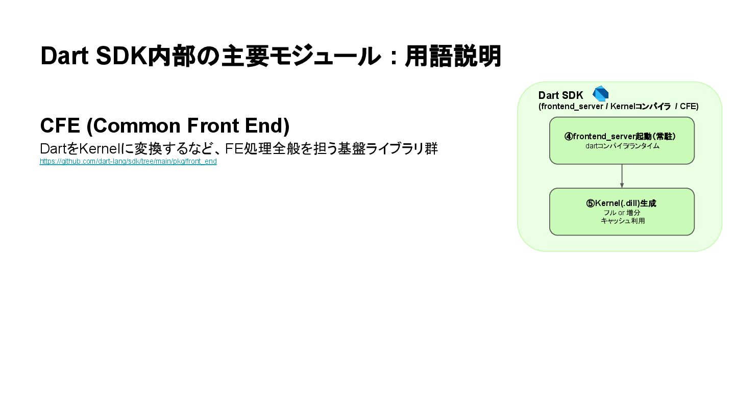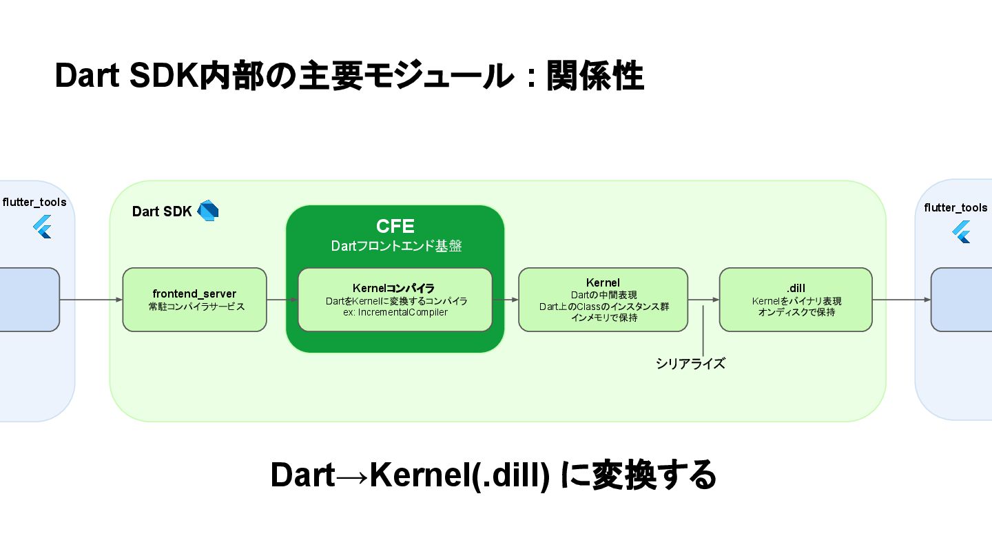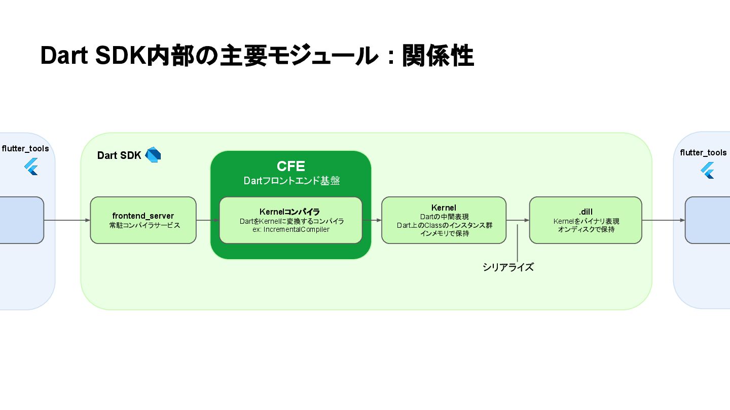 Windows, Linux, etc) ◦ Debug: Kernel → kernel_blob.bin (= .dill) → VMがJIT実行 ◦ Release: Kernel → AOTスナップショット → ネイティブコードとして実行 ▪ 各OSのネイティブ成果物(Android: libapp.so, iOS: App.frameworkのように) • Web(Chrome, Safari, Edge, etc) ◦ Debug: Kernel → dartdevc → JS ◦ Release: Kernel → dart2js → JS(最適化された配布用バンドル) Kernel Dartの中間表現 ネイティブ iOS, Android, Windows, Linux, etc Web Chrome, Safari, Edge, etc Dart Debug Release Debug Release クロスプラットフォーム出力を一本化