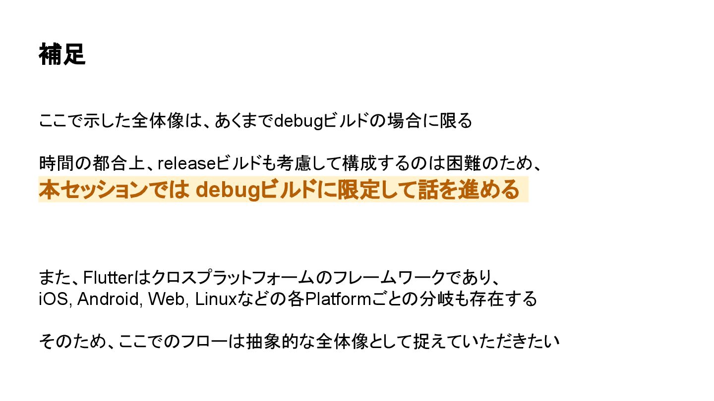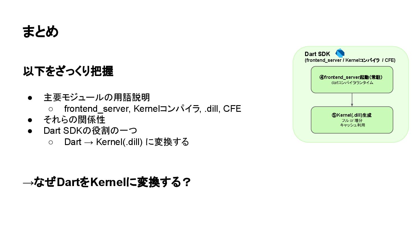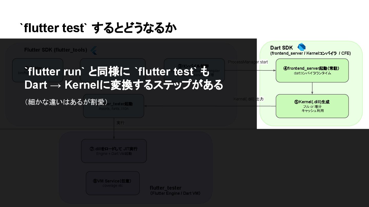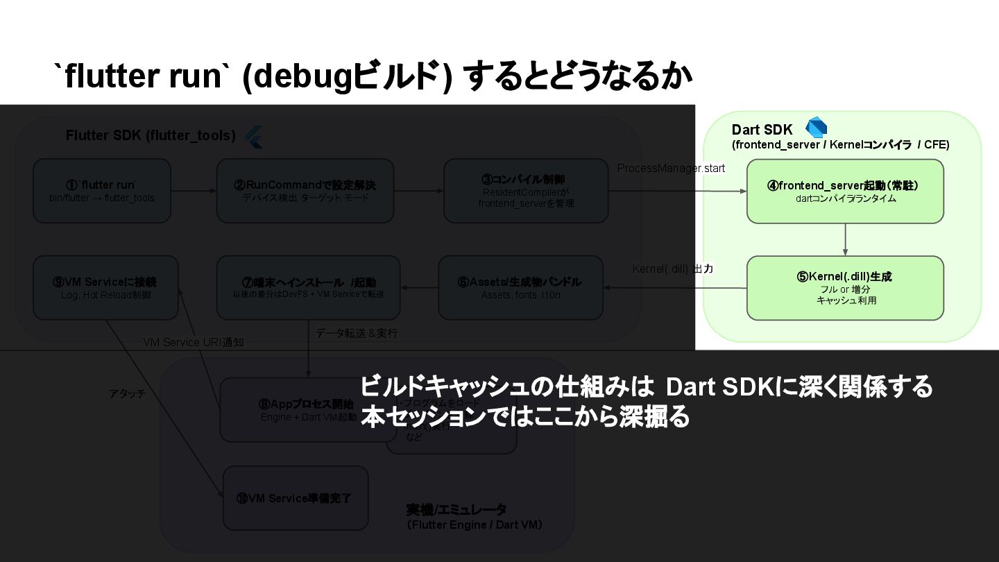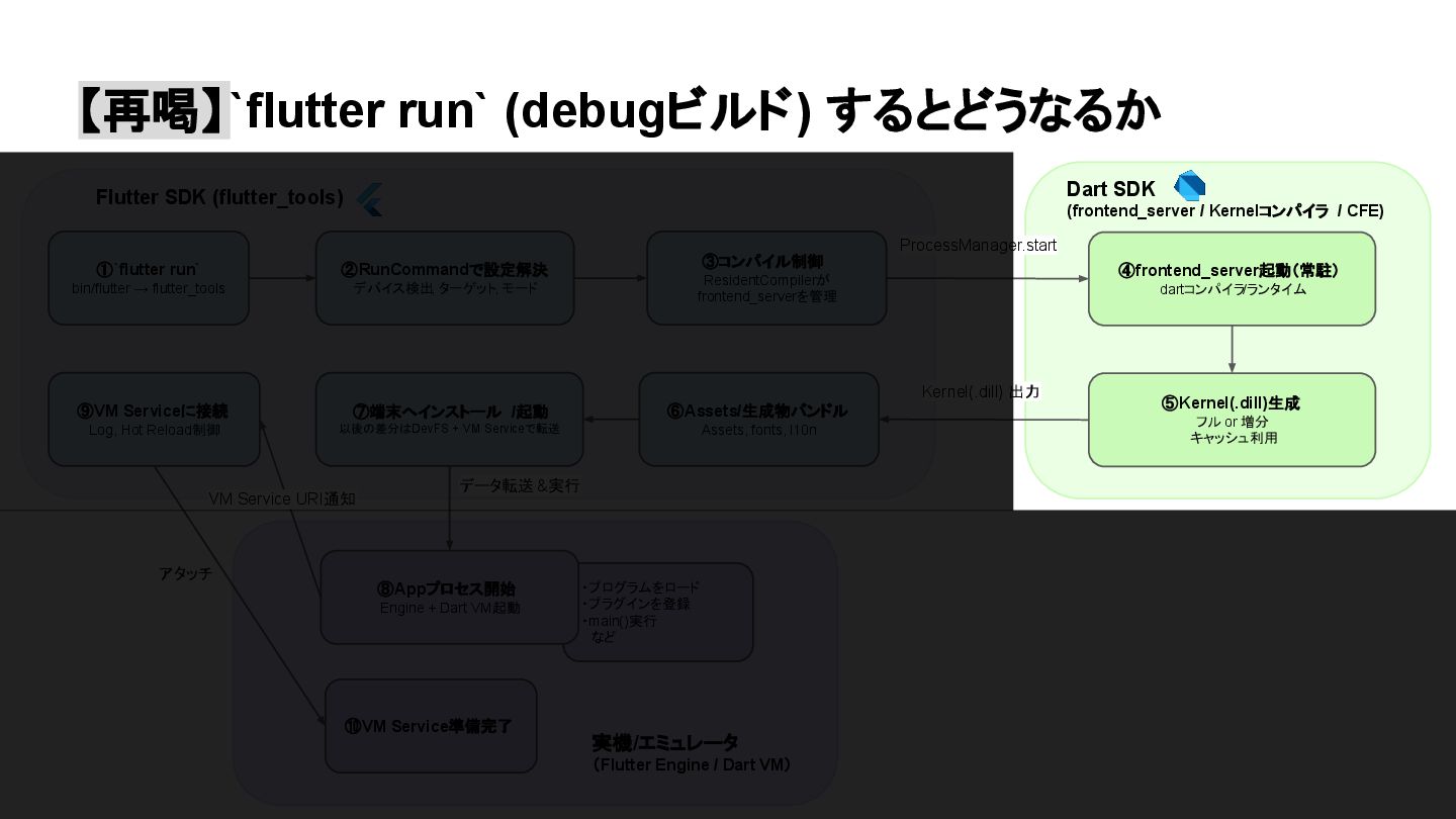 Windows, Linux, etc) ◦ Debug: Kernel → kernel_blob.bin (= .dill) → VMがJIT実行 ◦ Release: Kernel → AOTスナップショット → ネイティブコードとして実行 ▪ 各OSのネイティブ成果物(Android: libapp.so, iOS: App.frameworkのように) • Web(Chrome, Safari, Edge, etc) ◦ Debug: Kernel → dartdevc → JS ◦ Release: Kernel → dart2js → JS(最適化された配布用バンドル) Kernel Dartの中間表現 ネイティブ iOS, Android, Windows, Linux, etc Web Chrome, Safari, Edge, etc Dart Debug Release Debug Release クロスプラットフォーム出力を一本化