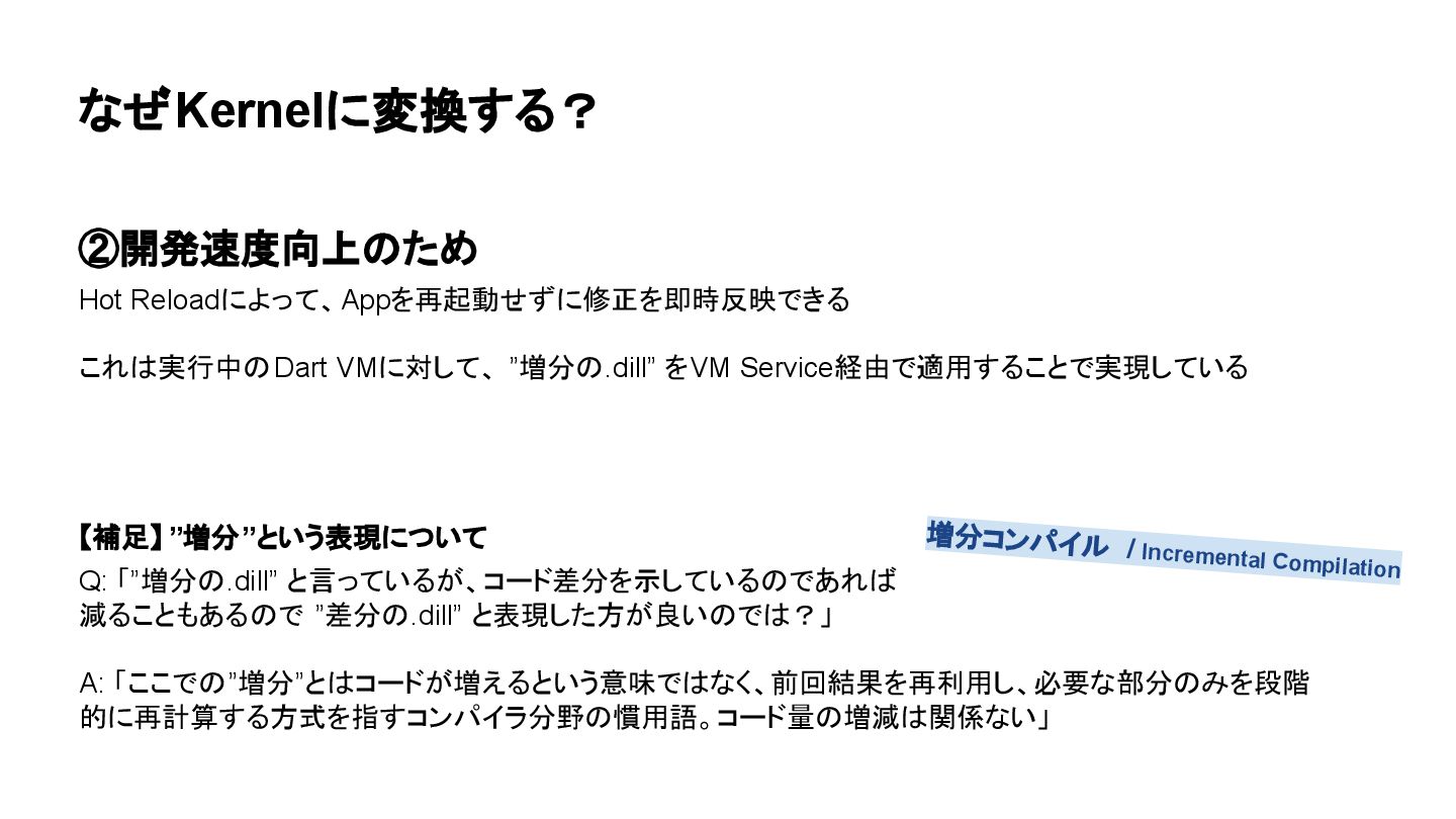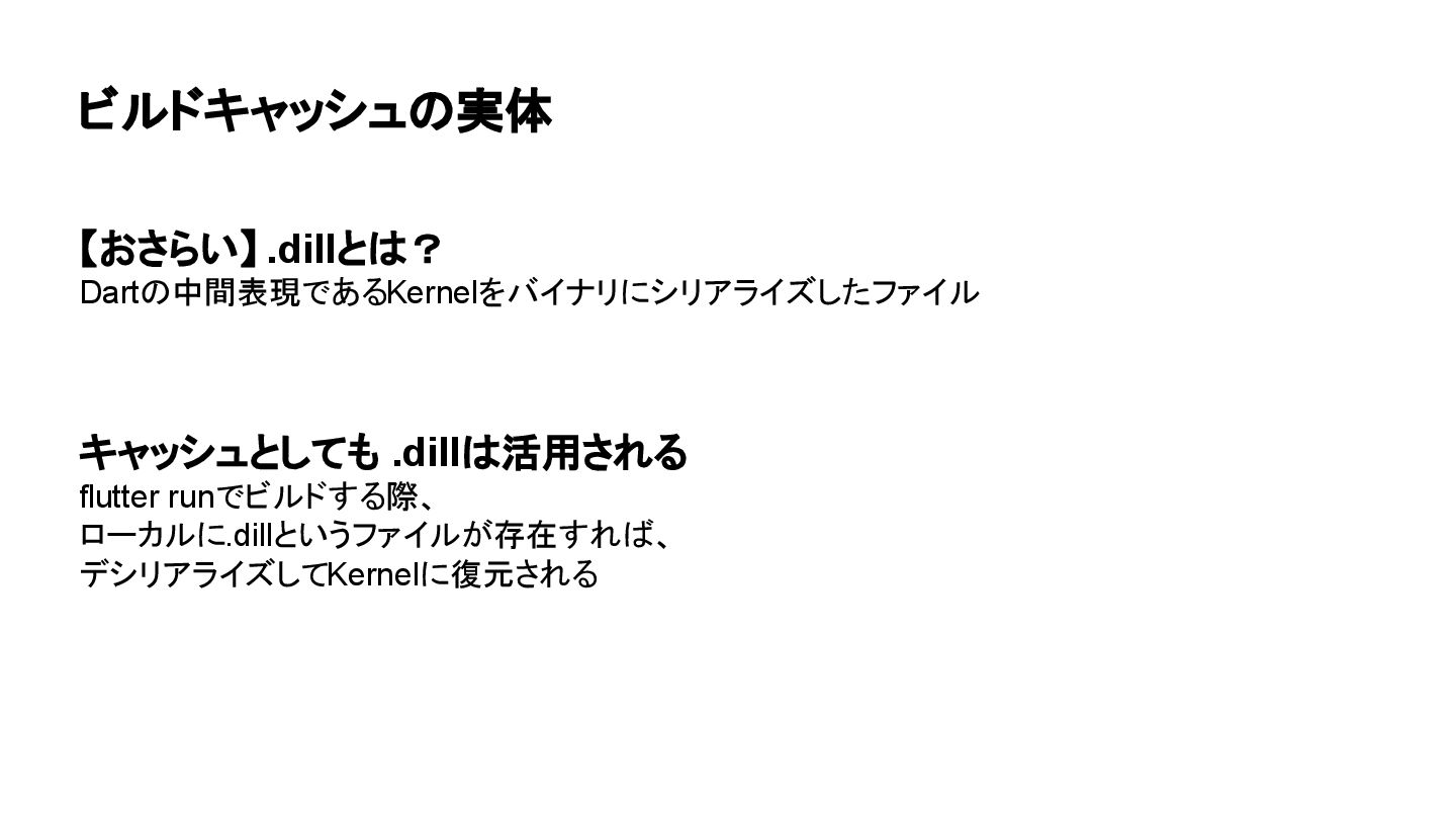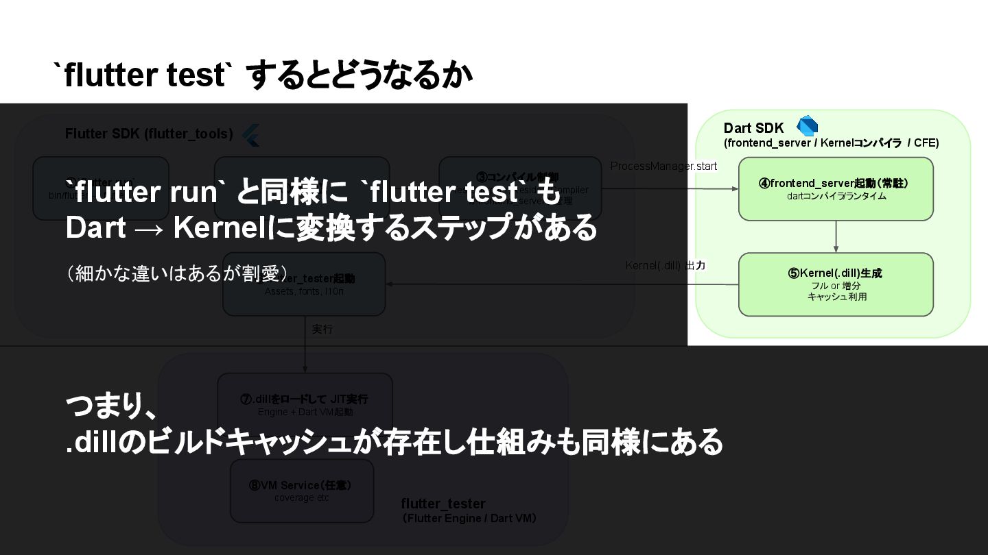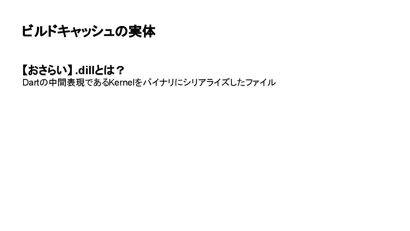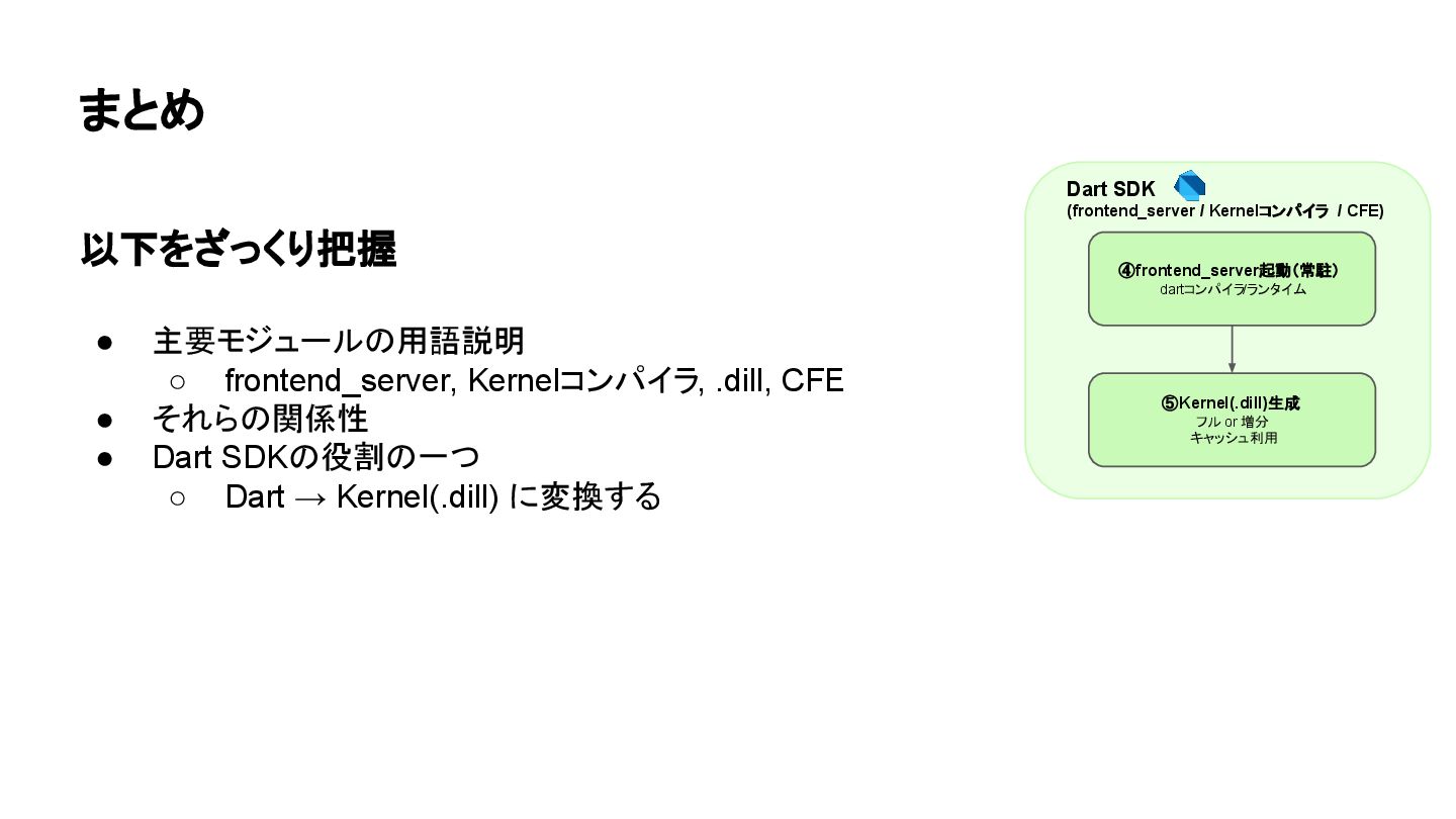 Windows, Linux, etc) ◦ Debug: Kernel → kernel_blob.bin (= .dill) → VMがJIT実行 ◦ Release: Kernel → AOTスナップショット → ネイティブコードとして実行 ▪ 各OSのネイティブ成果物(Android: libapp.so, iOS: App.frameworkのように) • Web(Chrome, Safari, Edge, etc) ◦ Debug: Kernel → dartdevc → JS ◦ Release: Kernel → dart2js → JS(最適化された配布用バンドル) Kernel Dartの中間表現 ネイティブ iOS, Android, Windows, Linux, etc Web Chrome, Safari, Edge, etc Dart Debug Release Debug Release クロスプラットフォーム出力を一本化