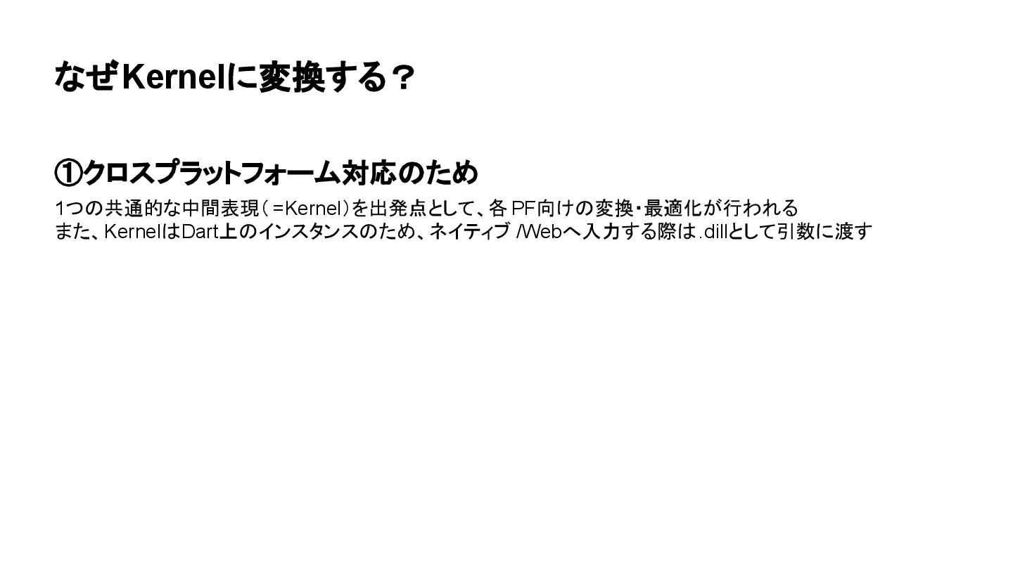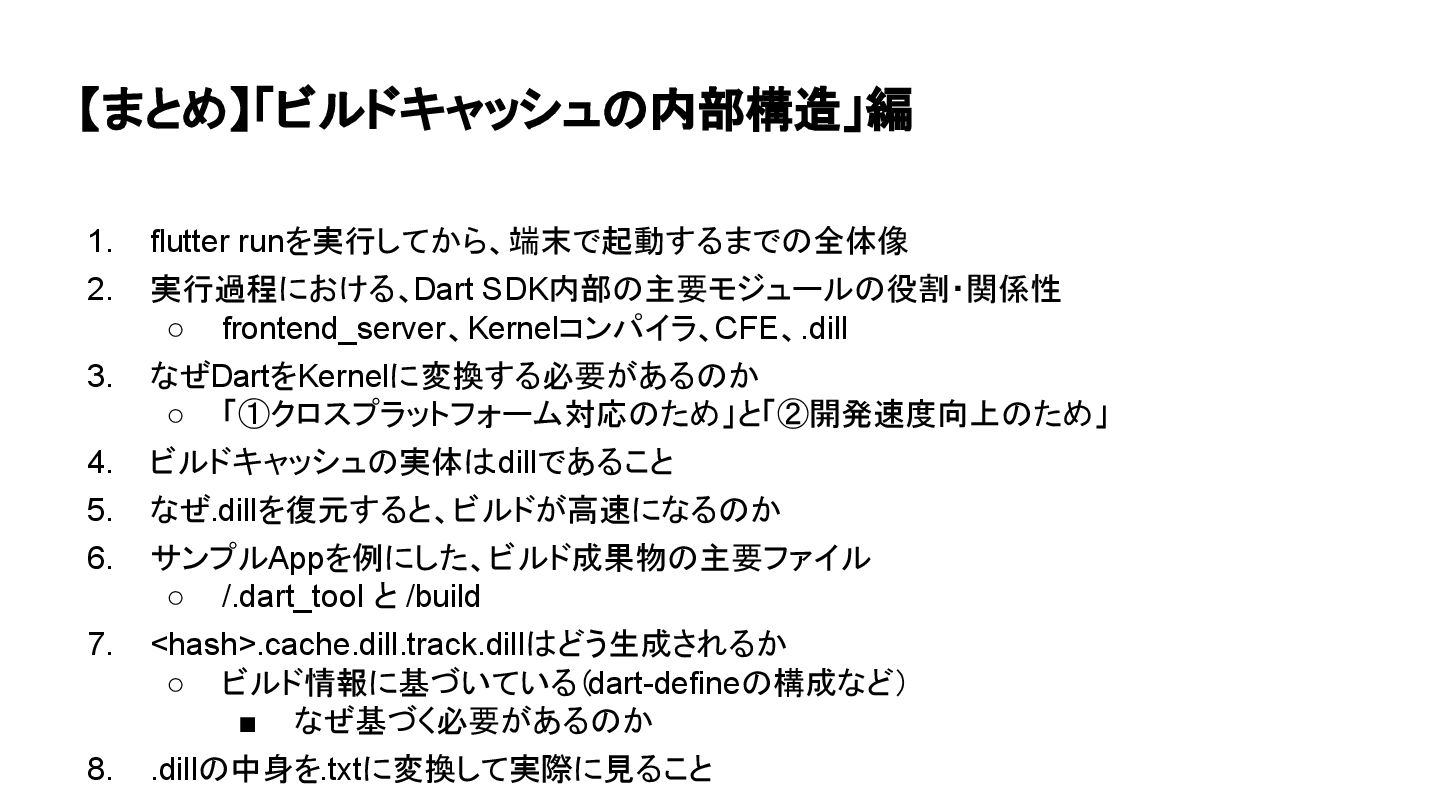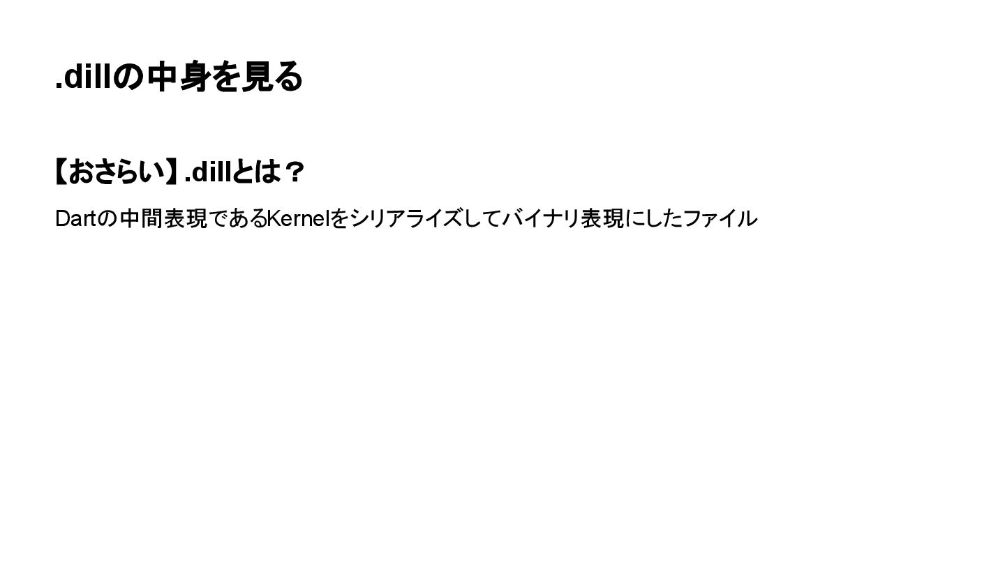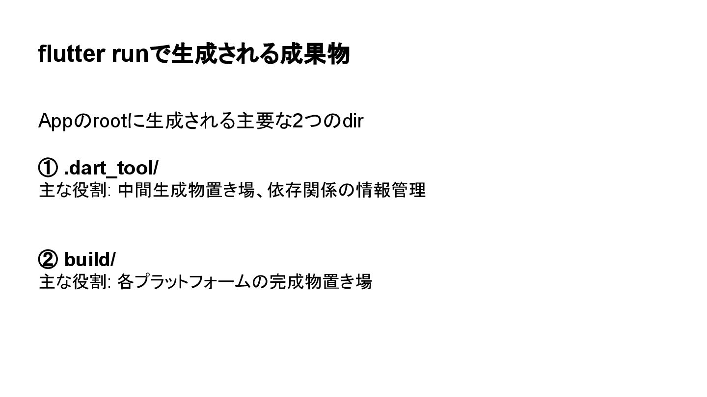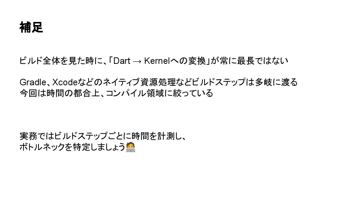 Windows, Linux, etc) ◦ Debug: Kernel → kernel_blob.bin (= .dill) → VMがJIT実行 ◦ Release: Kernel → AOTスナップショット → ネイティブコードとして実行 ▪ 各OSのネイティブ成果物(Android: libapp.so, iOS: App.frameworkのように) • Web(Chrome, Safari, Edge, etc) ◦ Debug: Kernel → dartdevc → JS ◦ Release: Kernel → dart2js → JS(最適化された配布用バンドル) Kernel Dartの中間表現 ネイティブ iOS, Android, Windows, Linux, etc Web Chrome, Safari, Edge, etc Dart Debug Release Debug Release クロスプラットフォーム出力を一本化