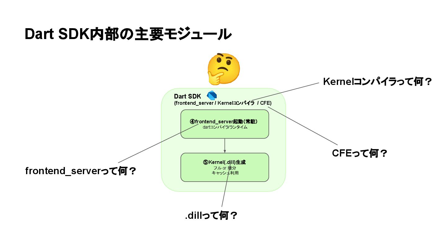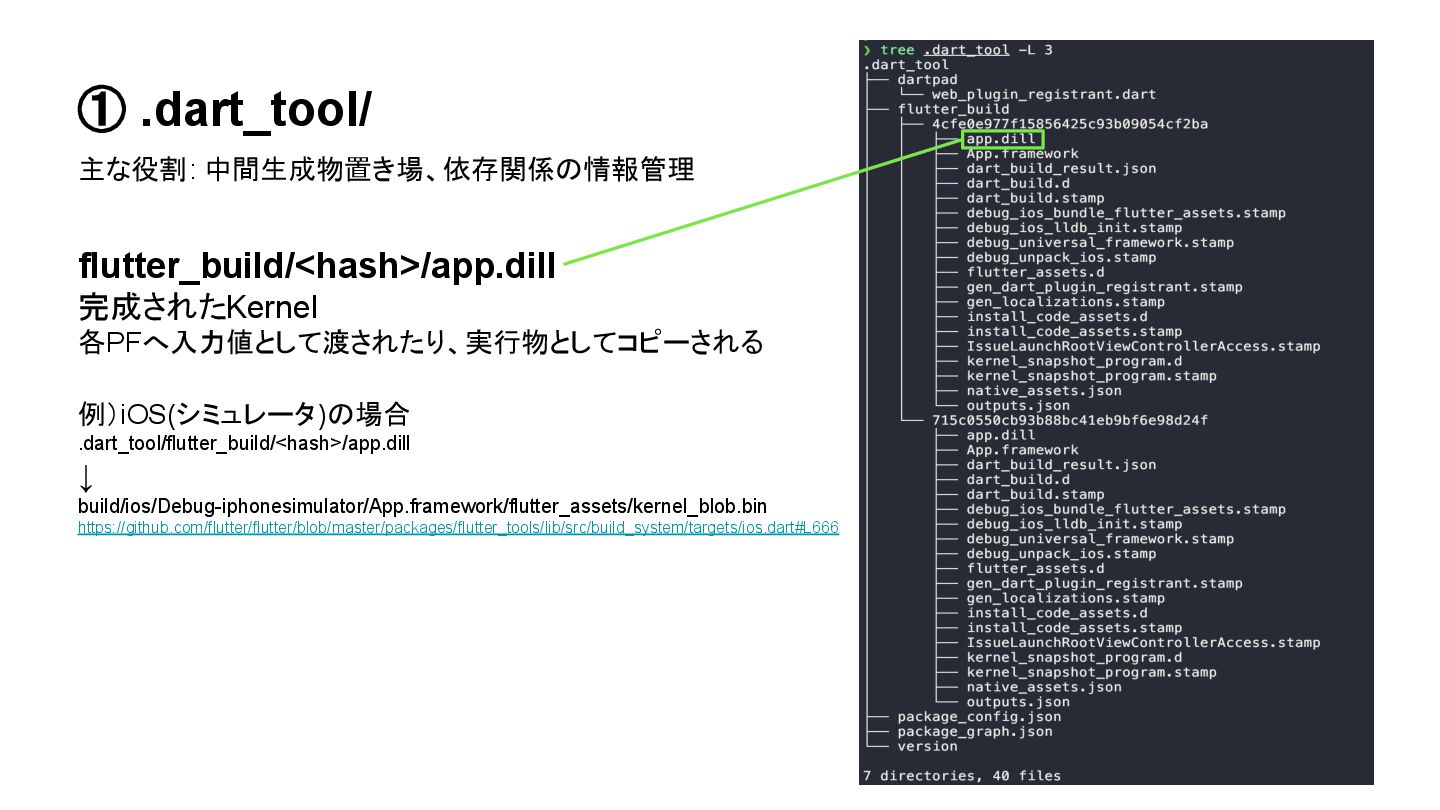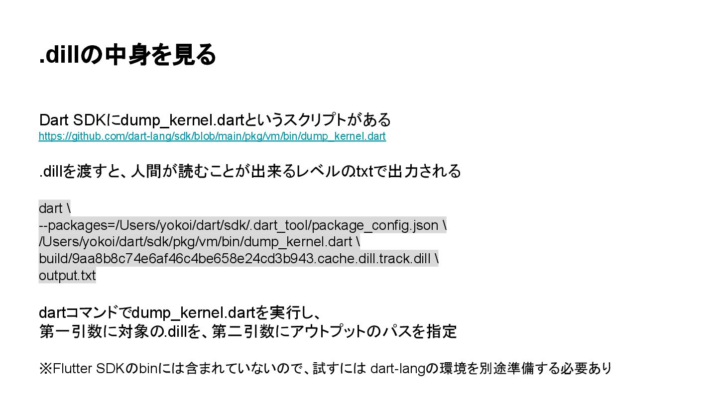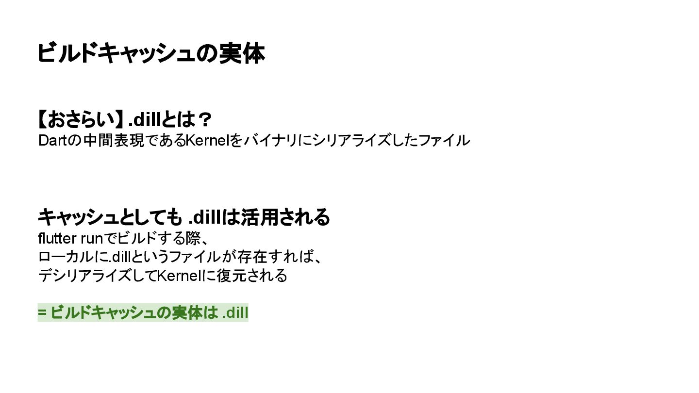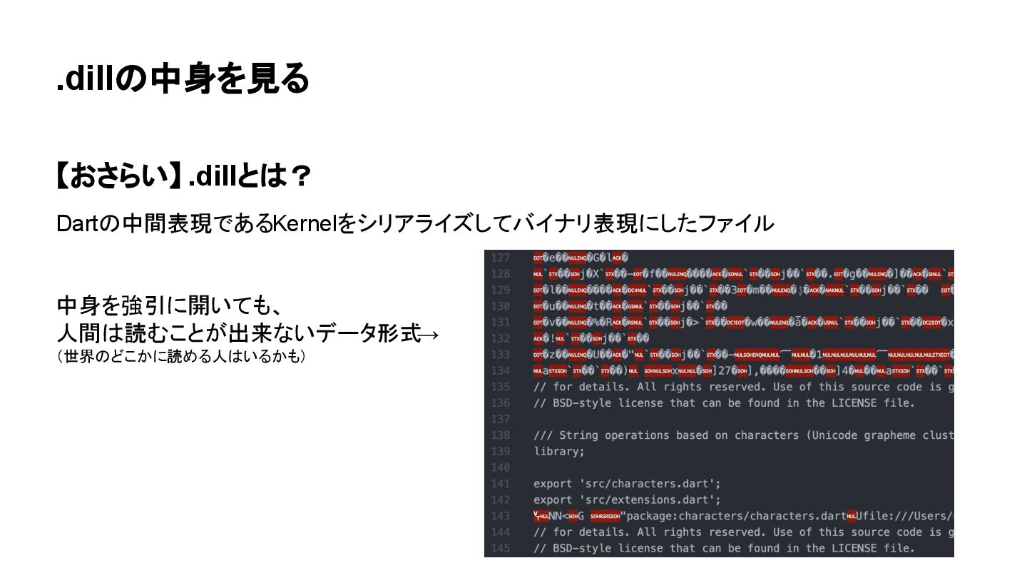 Windows, Linux, etc) ◦ Debug: Kernel → kernel_blob.bin (= .dill) → VMがJIT実行 ◦ Release: Kernel → AOTスナップショット → ネイティブコードとして実行 ▪ 各OSのネイティブ成果物(Android: libapp.so, iOS: App.frameworkのように) • Web(Chrome, Safari, Edge, etc) ◦ Debug: Kernel → dartdevc → JS ◦ Release: Kernel → dart2js → JS(最適化された配布用バンドル) Kernel Dartの中間表現 ネイティブ iOS, Android, Windows, Linux, etc Web Chrome, Safari, Edge, etc Dart Debug Release Debug Release クロスプラットフォーム出力を一本化