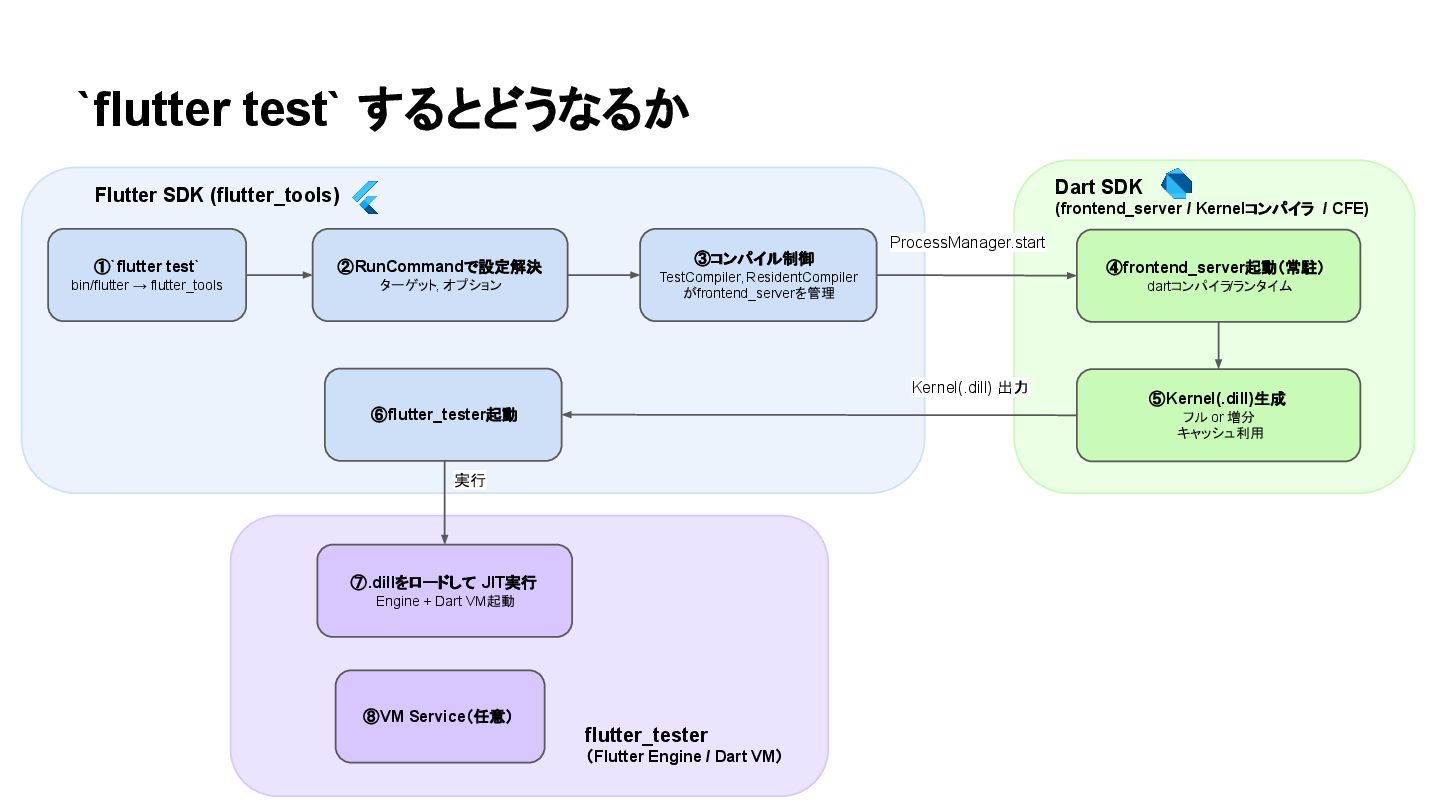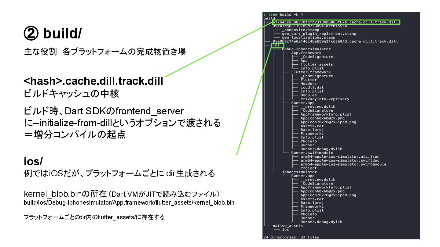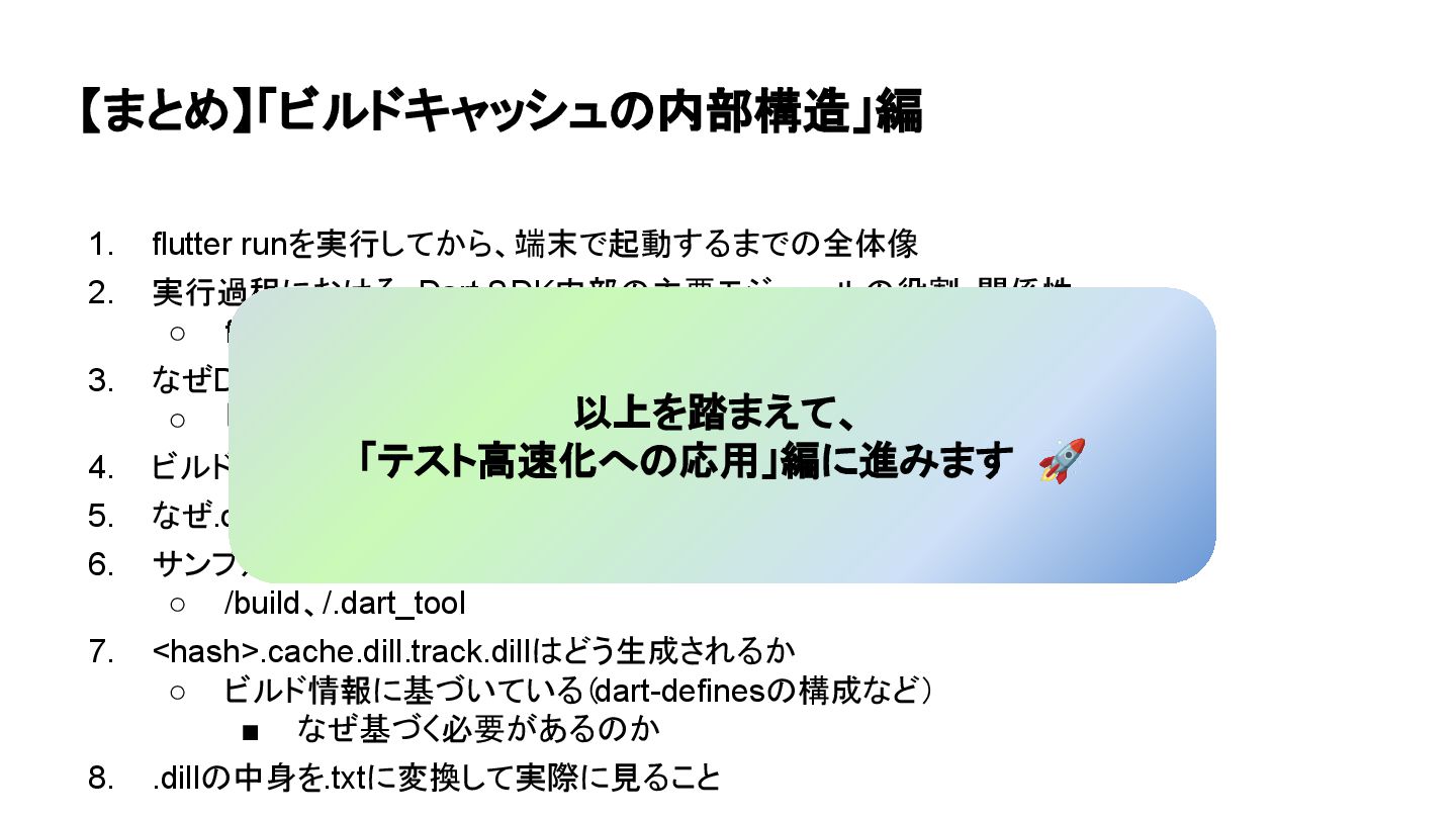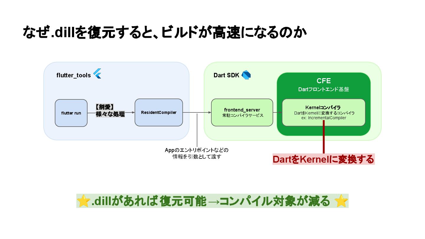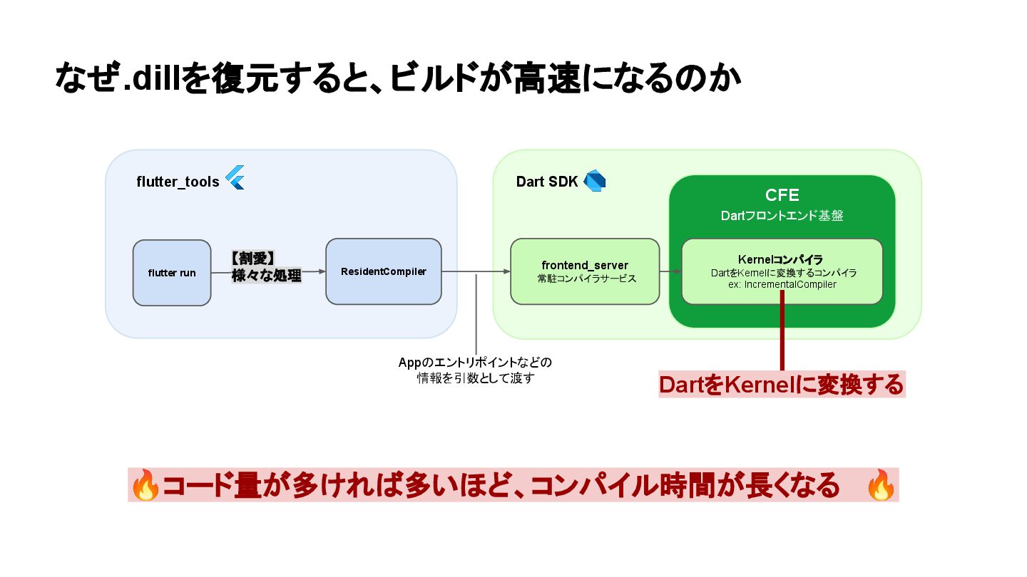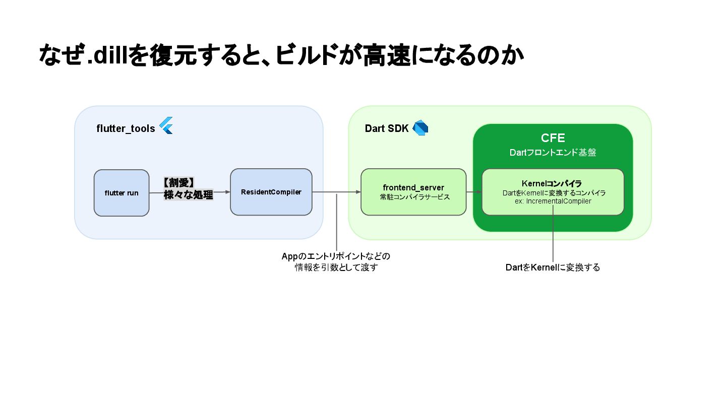 Windows, Linux, etc) ◦ Debug: Kernel → kernel_blob.bin (= .dill) → VMがJIT実行 ◦ Release: Kernel → AOTスナップショット → ネイティブコードとして実行 ▪ 各OSのネイティブ成果物(Android: libapp.so, iOS: App.frameworkのように) • Web(Chrome, Safari, Edge, etc) ◦ Debug: Kernel → dartdevc → JS ◦ Release: Kernel → dart2js → JS(最適化された配布用バンドル) Kernel Dartの中間表現 ネイティブ iOS, Android, Windows, Linux, etc Web Chrome, Safari, Edge, etc Dart Debug Release Debug Release クロスプラットフォーム出力を一本化