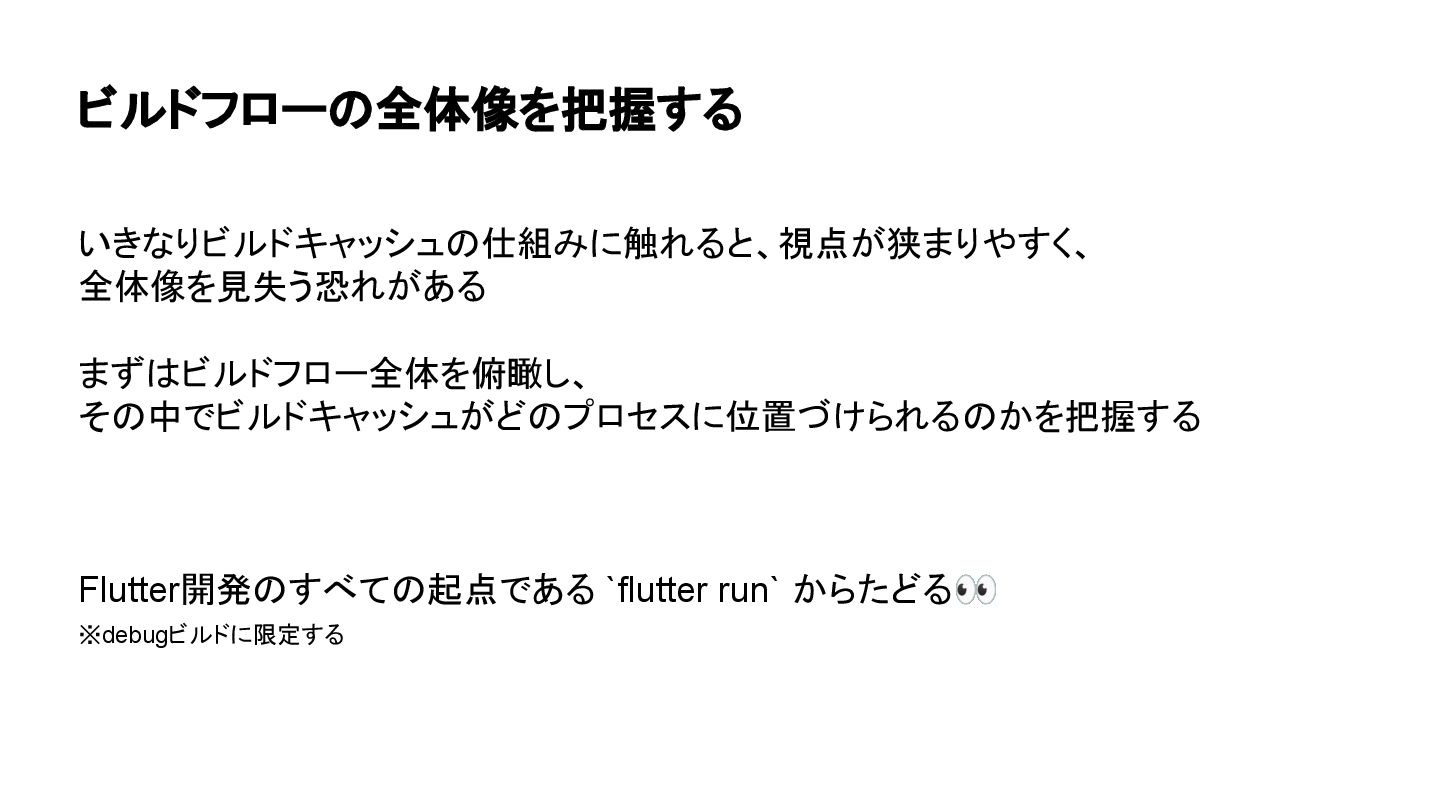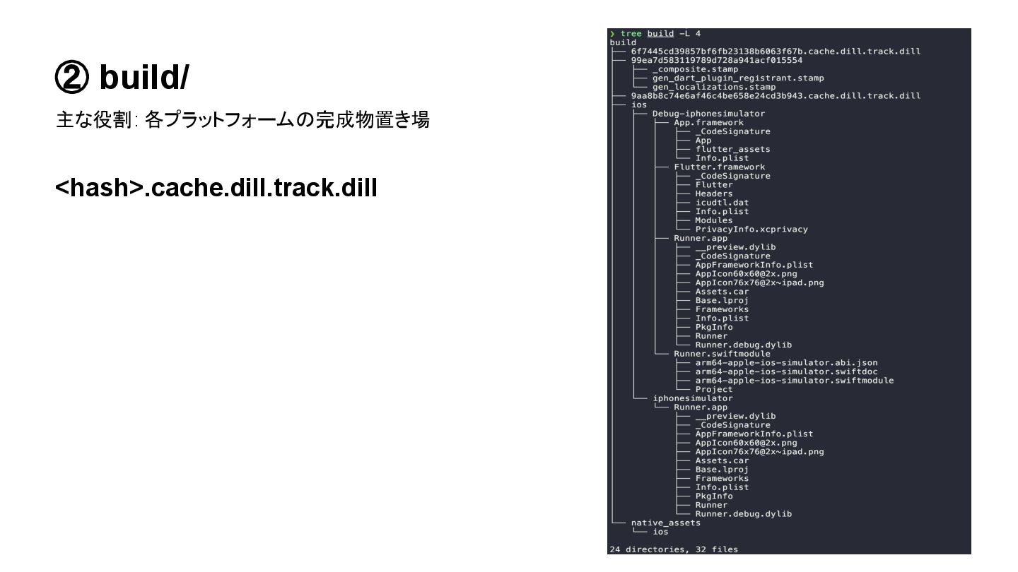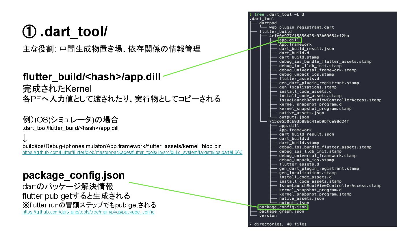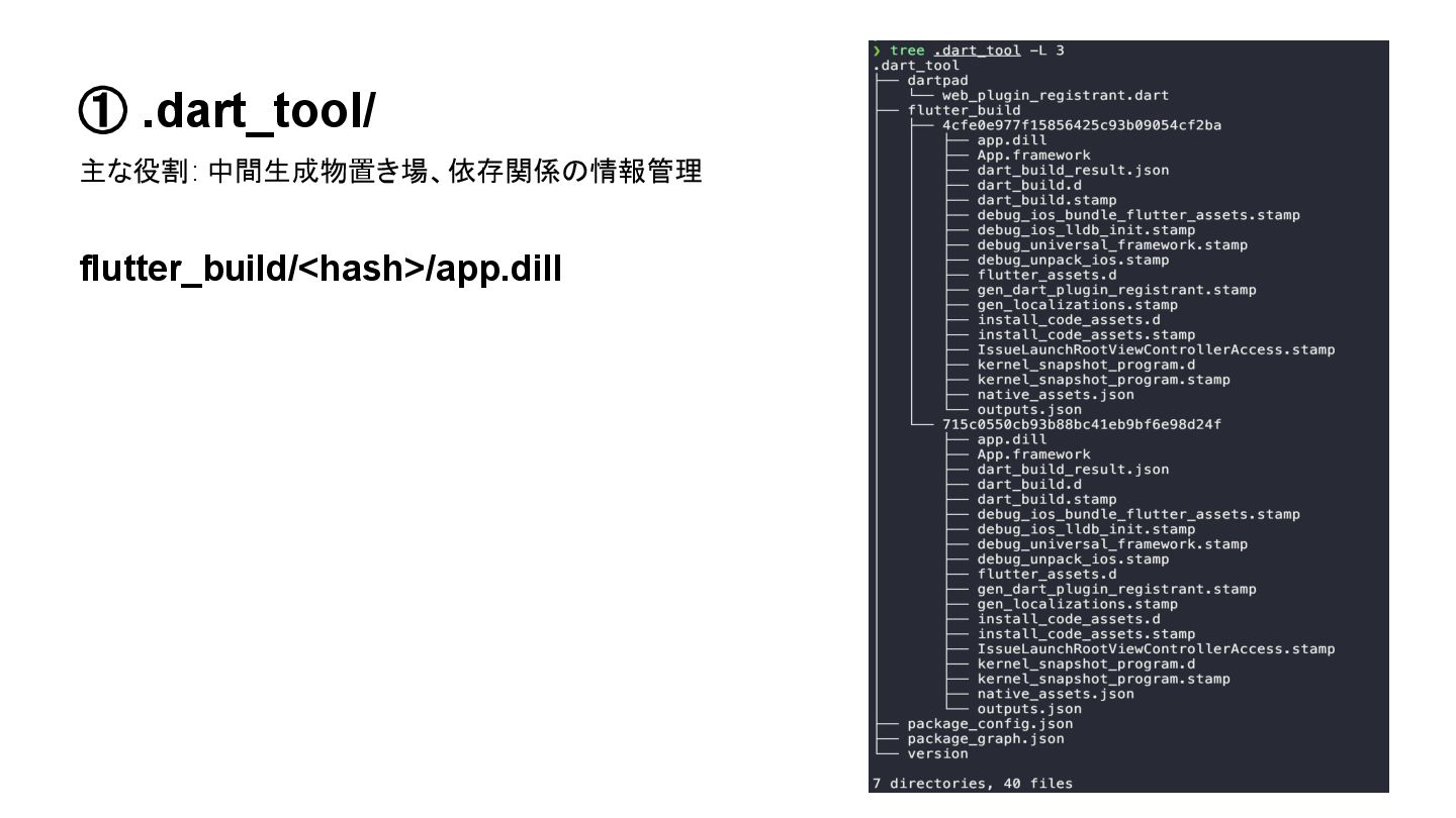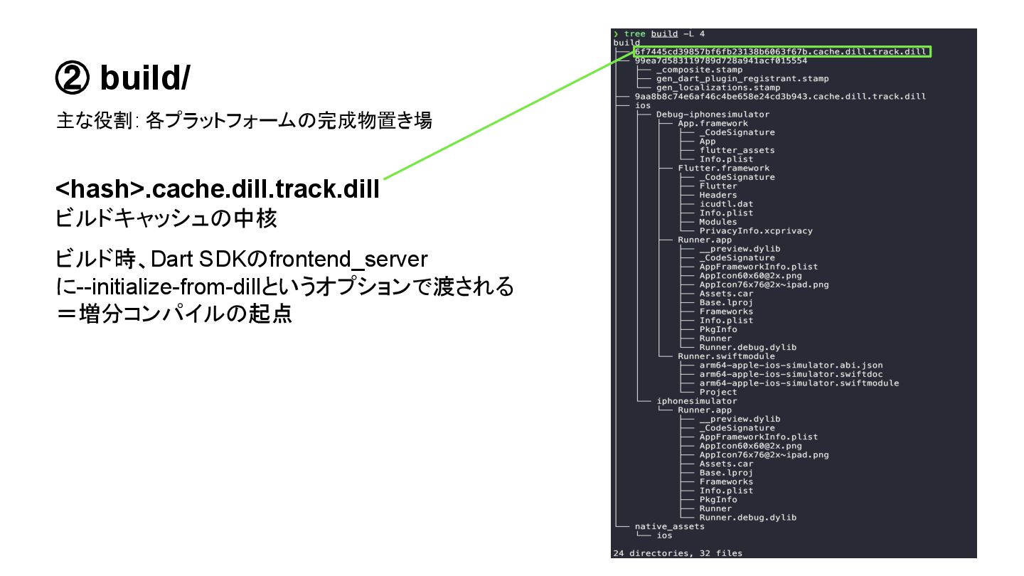 Windows, Linux, etc) ◦ Debug: Kernel → kernel_blob.bin (= .dill) → VMがJIT実行 ◦ Release: Kernel → AOTスナップショット → ネイティブコードとして実行 ▪ 各OSのネイティブ成果物(Android: libapp.so, iOS: App.frameworkのように) • Web(Chrome, Safari, Edge, etc) ◦ Debug: Kernel → dartdevc → JS ◦ Release: Kernel → dart2js → JS(最適化された配布用バンドル) Kernel Dartの中間表現 ネイティブ iOS, Android, Windows, Linux, etc Web Chrome, Safari, Edge, etc Dart Debug Release Debug Release クロスプラットフォーム出力を一本化