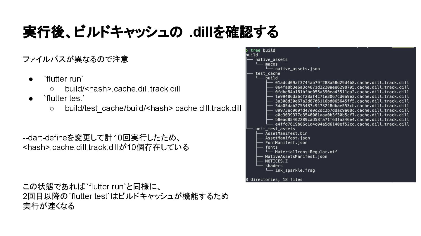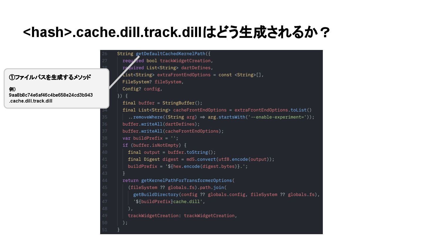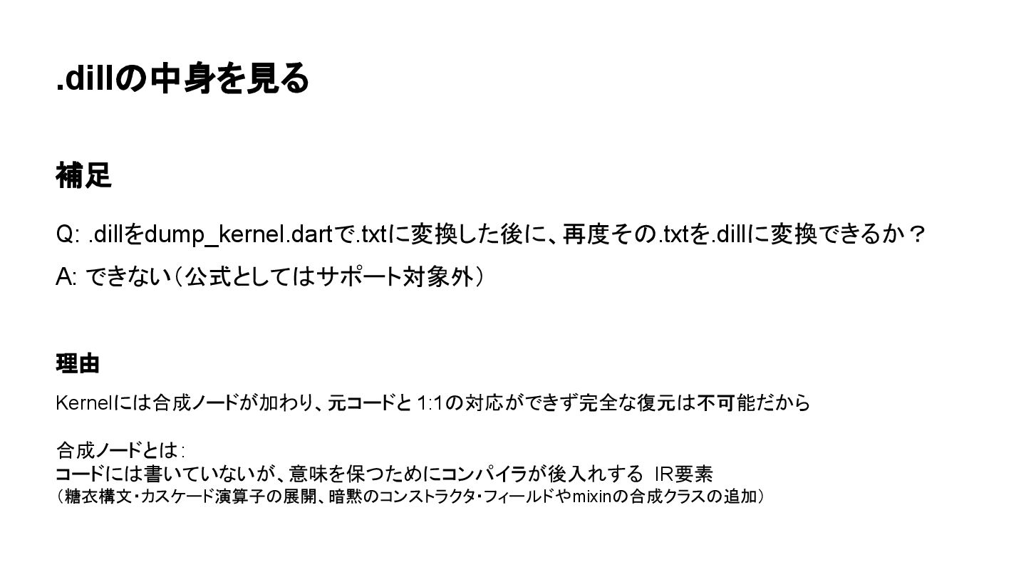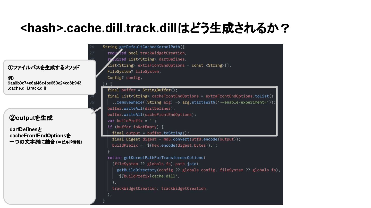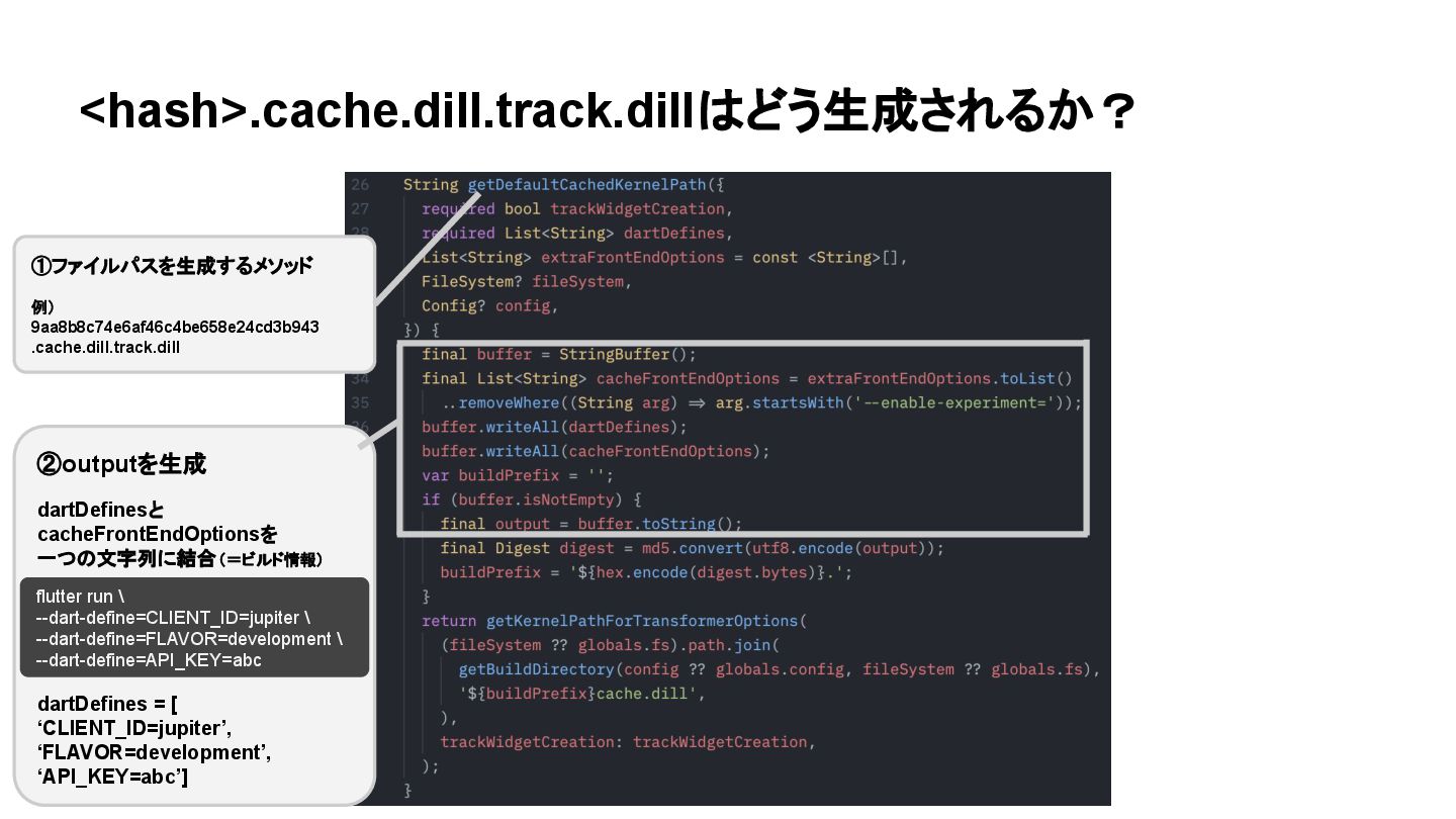 Windows, Linux, etc) ◦ Debug: Kernel → kernel_blob.bin (= .dill) → VMがJIT実行 ◦ Release: Kernel → AOTスナップショット → ネイティブコードとして実行 ▪ 各OSのネイティブ成果物(Android: libapp.so, iOS: App.frameworkのように) • Web(Chrome, Safari, Edge, etc) ◦ Debug: Kernel → dartdevc → JS ◦ Release: Kernel → dart2js → JS(最適化された配布用バンドル) Kernel Dartの中間表現 ネイティブ iOS, Android, Windows, Linux, etc Web Chrome, Safari, Edge, etc Dart Debug Release Debug Release クロスプラットフォーム出力を一本化
