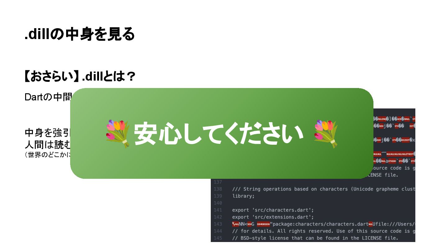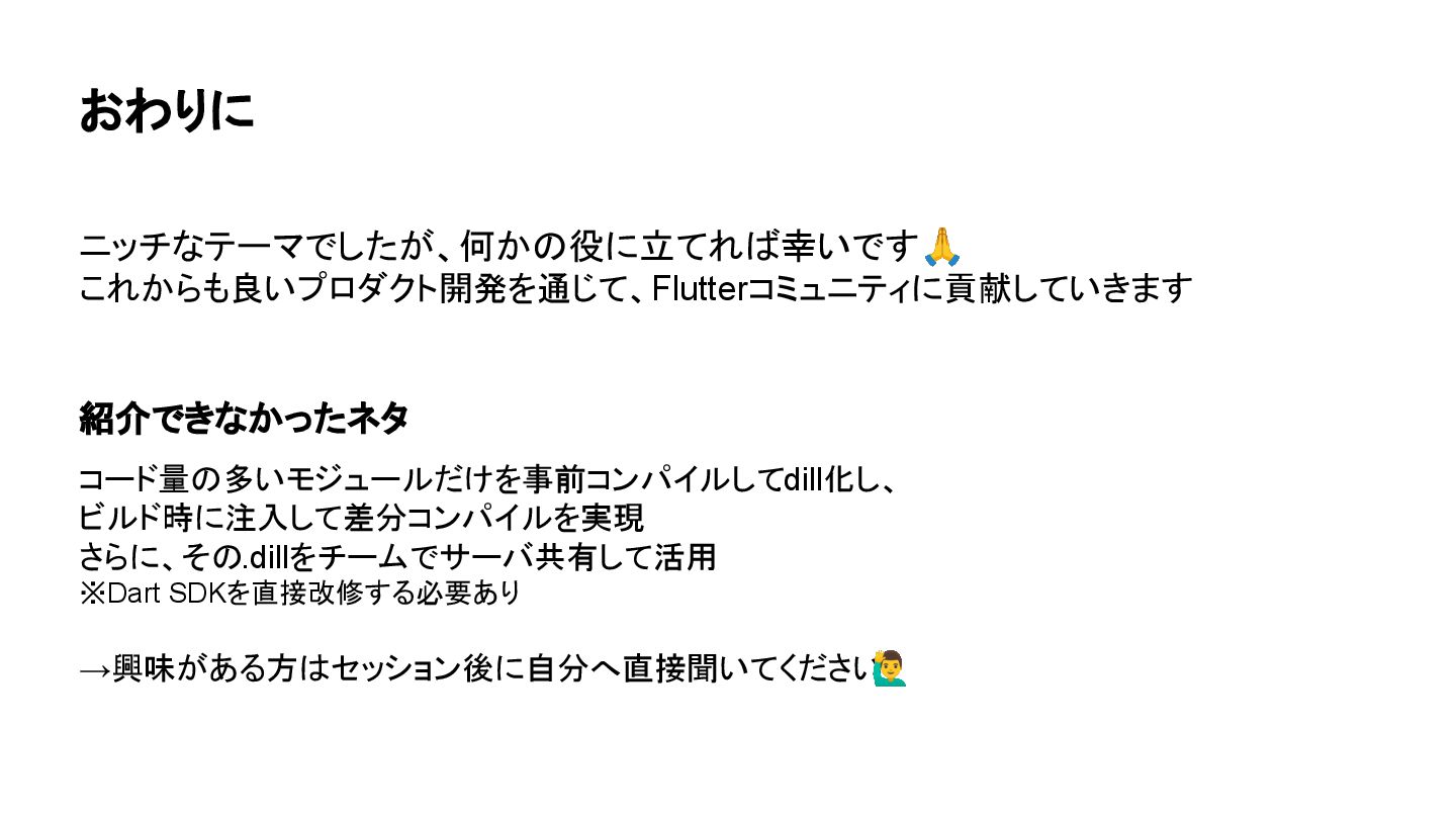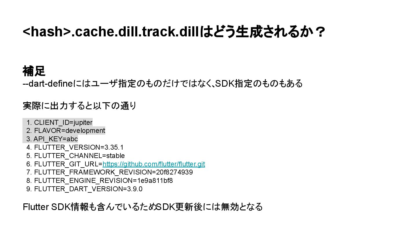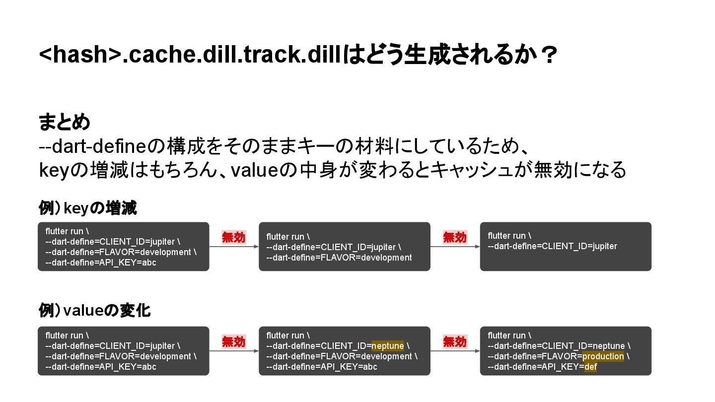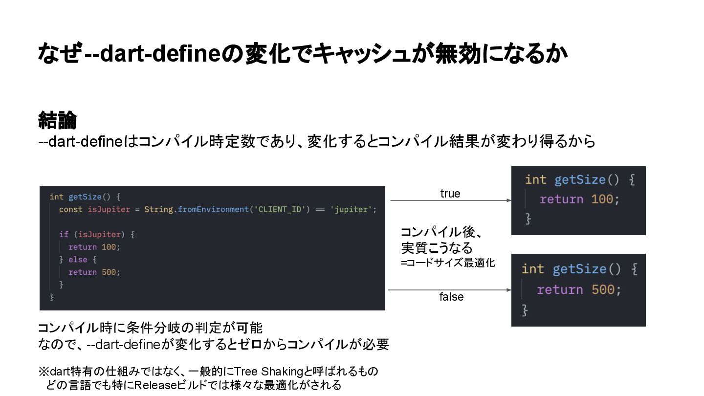 Windows, Linux, etc) ◦ Debug: Kernel → kernel_blob.bin (= .dill) → VMがJIT実行 ◦ Release: Kernel → AOTスナップショット → ネイティブコードとして実行 ▪ 各OSのネイティブ成果物(Android: libapp.so, iOS: App.frameworkのように) • Web(Chrome, Safari, Edge, etc) ◦ Debug: Kernel → dartdevc → JS ◦ Release: Kernel → dart2js → JS(最適化された配布用バンドル) Kernel Dartの中間表現 ネイティブ iOS, Android, Windows, Linux, etc Web Chrome, Safari, Edge, etc Dart Debug Release Debug Release クロスプラットフォーム出力を一本化