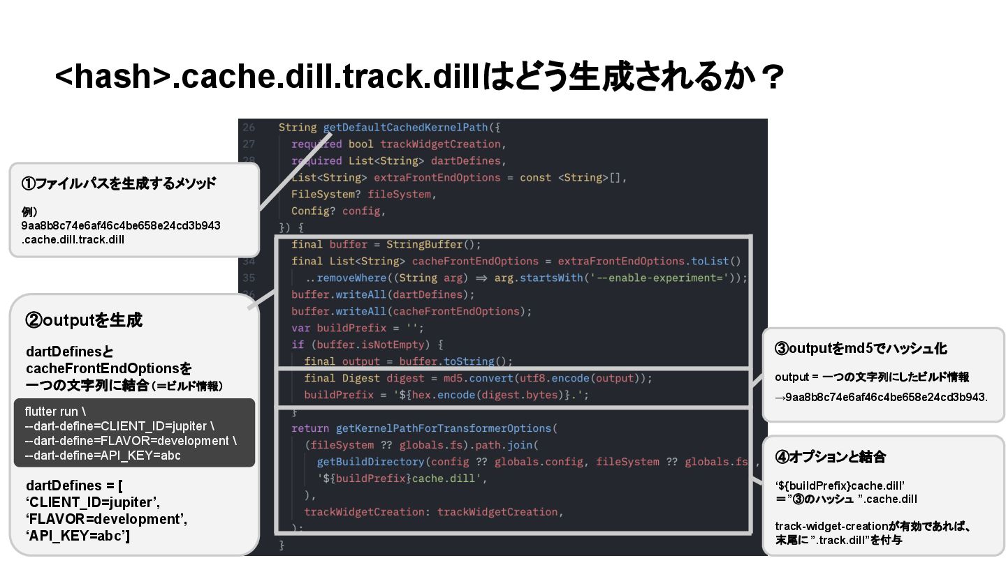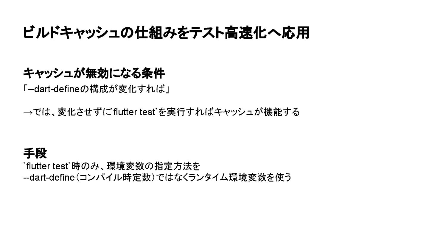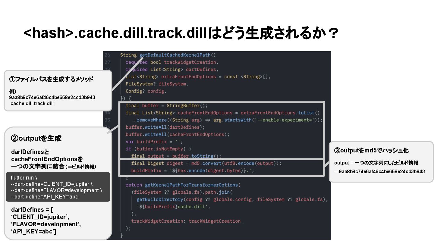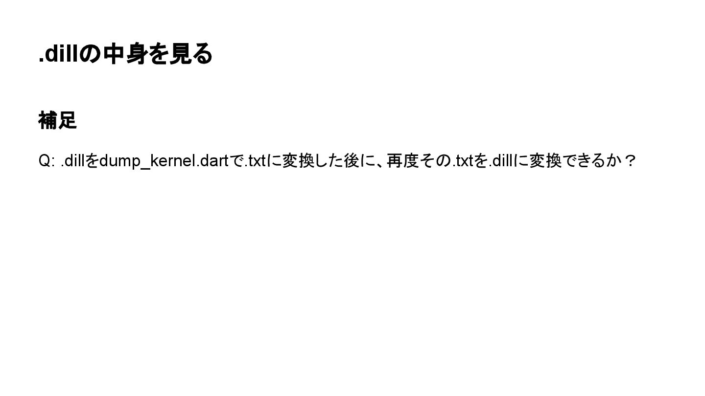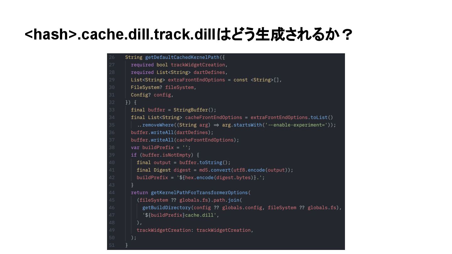 Windows, Linux, etc) ◦ Debug: Kernel → kernel_blob.bin (= .dill) → VMがJIT実行 ◦ Release: Kernel → AOTスナップショット → ネイティブコードとして実行 ▪ 各OSのネイティブ成果物(Android: libapp.so, iOS: App.frameworkのように) • Web(Chrome, Safari, Edge, etc) ◦ Debug: Kernel → dartdevc → JS ◦ Release: Kernel → dart2js → JS(最適化された配布用バンドル) Kernel Dartの中間表現 ネイティブ iOS, Android, Windows, Linux, etc Web Chrome, Safari, Edge, etc Dart Debug Release Debug Release クロスプラットフォーム出力を一本化