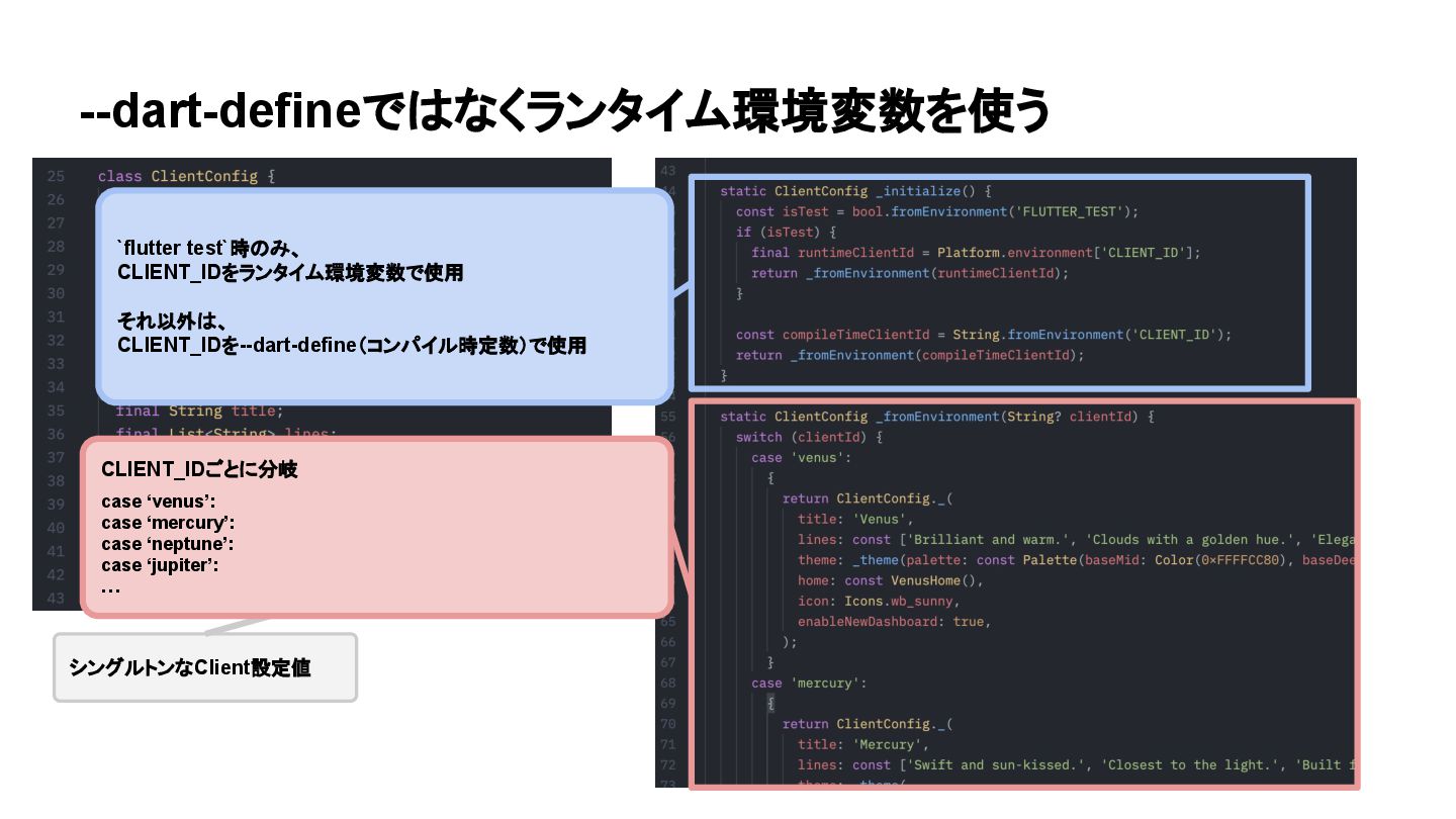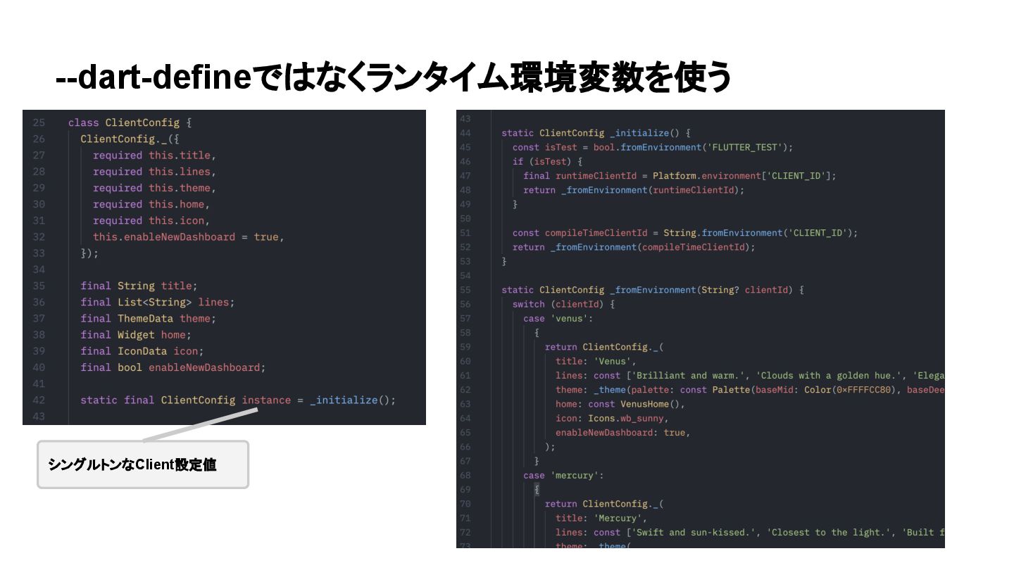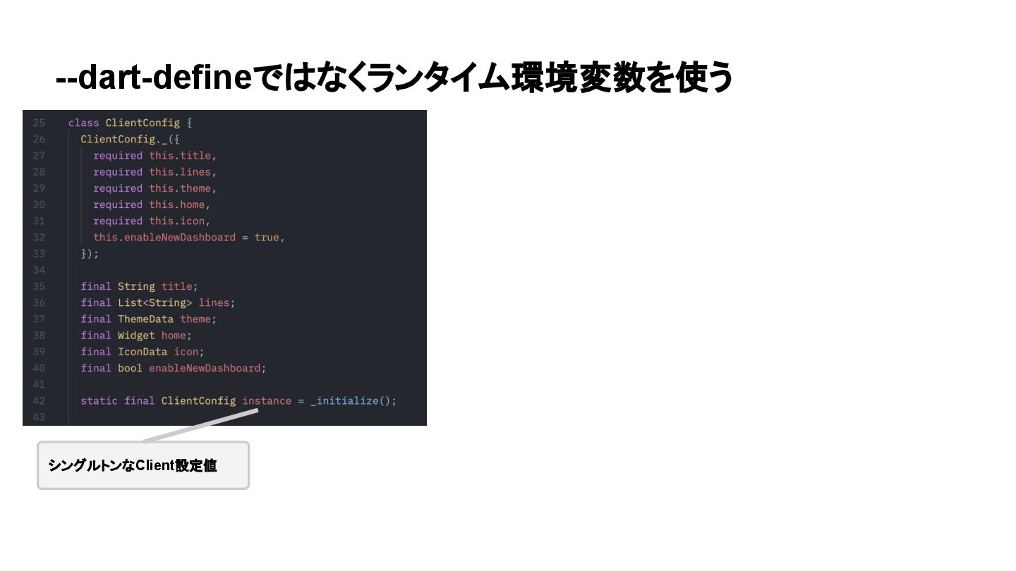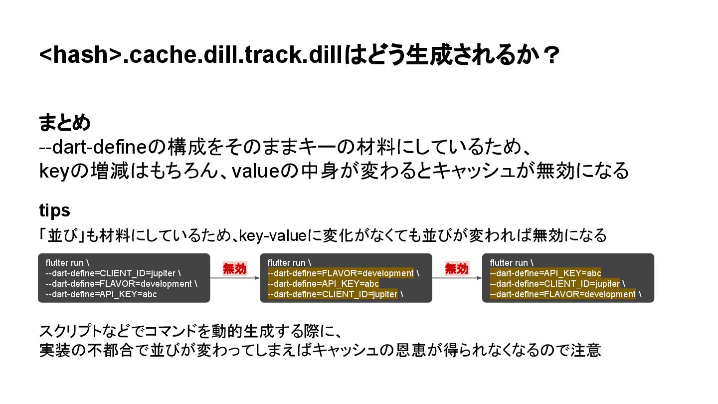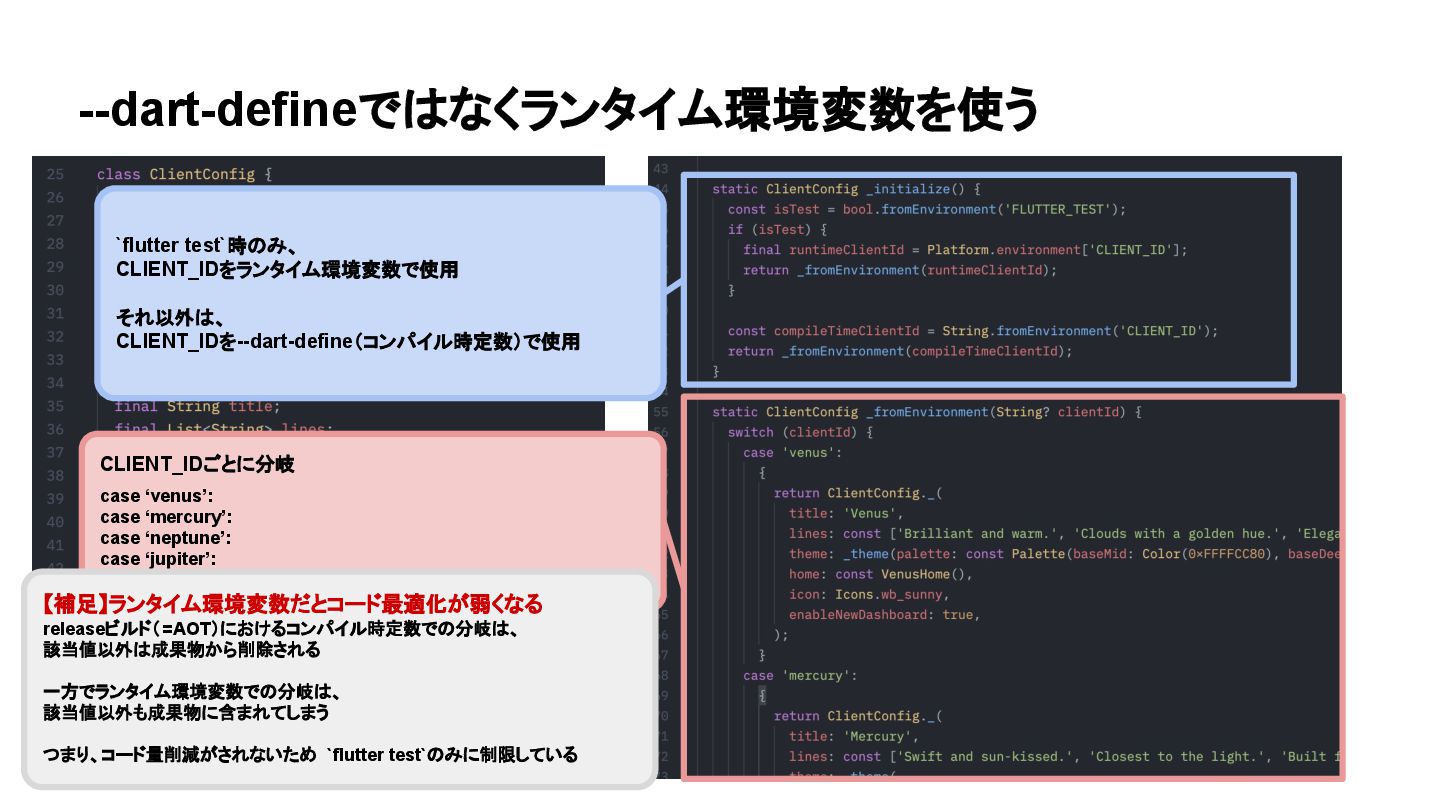 Windows, Linux, etc) ◦ Debug: Kernel → kernel_blob.bin (= .dill) → VMがJIT実行 ◦ Release: Kernel → AOTスナップショット → ネイティブコードとして実行 ▪ 各OSのネイティブ成果物(Android: libapp.so, iOS: App.frameworkのように) • Web(Chrome, Safari, Edge, etc) ◦ Debug: Kernel → dartdevc → JS ◦ Release: Kernel → dart2js → JS(最適化された配布用バンドル) Kernel Dartの中間表現 ネイティブ iOS, Android, Windows, Linux, etc Web Chrome, Safari, Edge, etc Dart Debug Release Debug Release クロスプラットフォーム出力を一本化