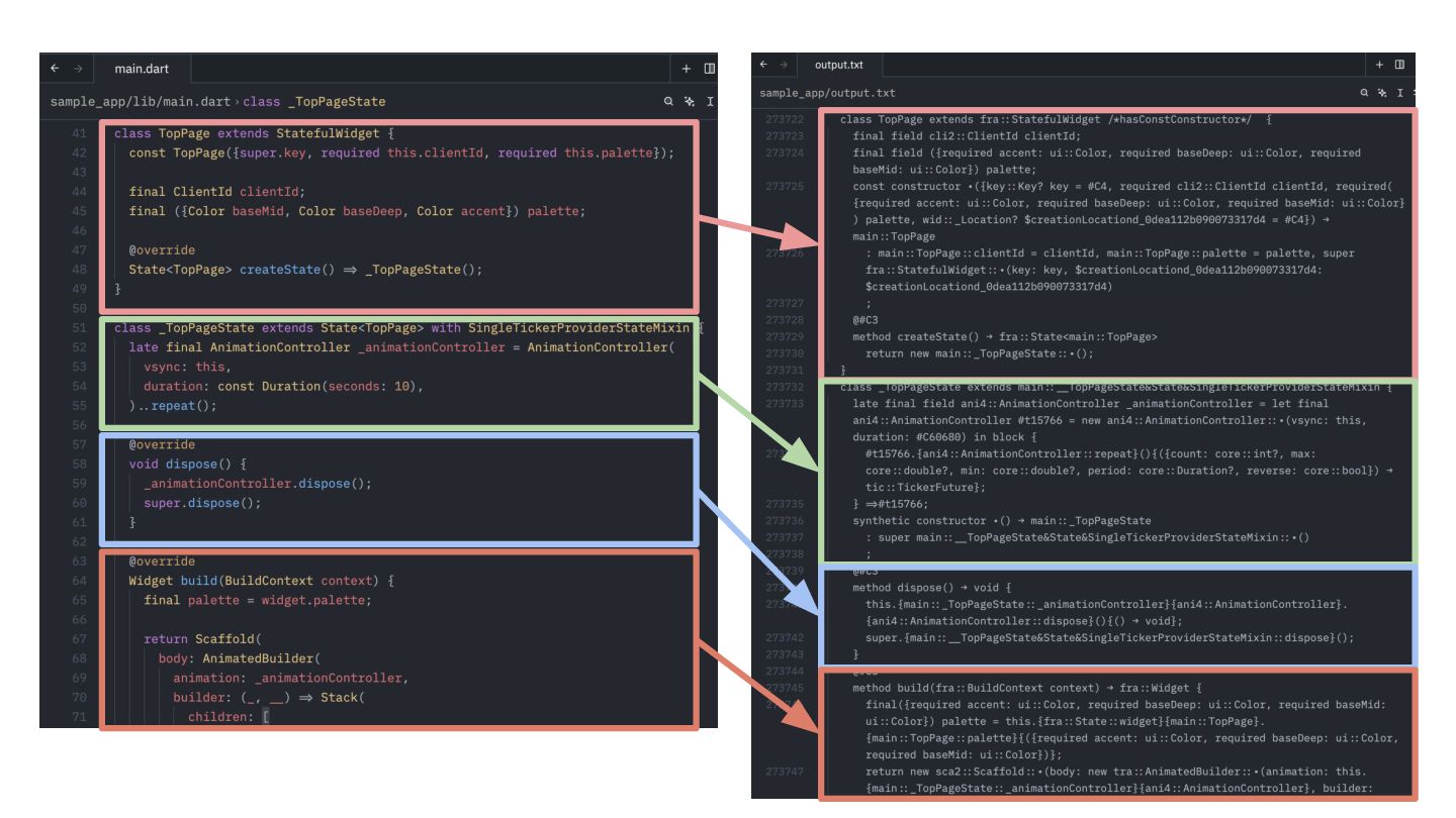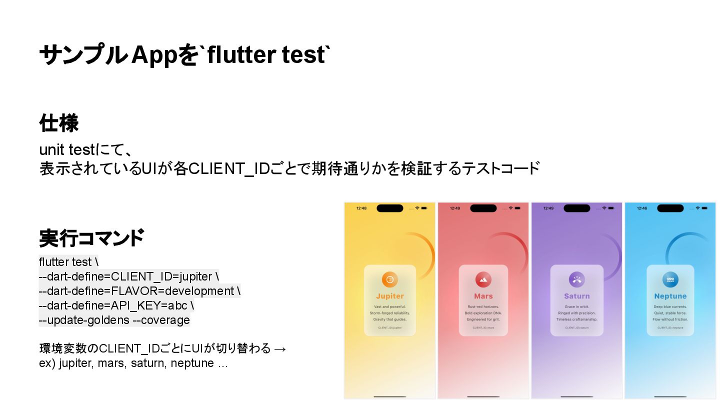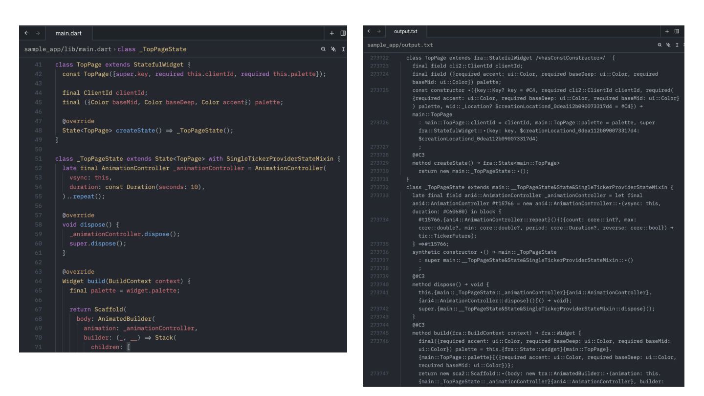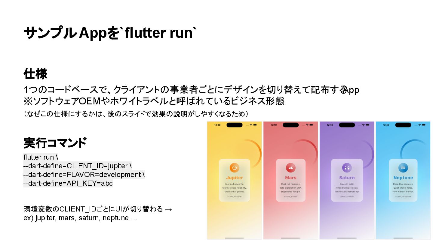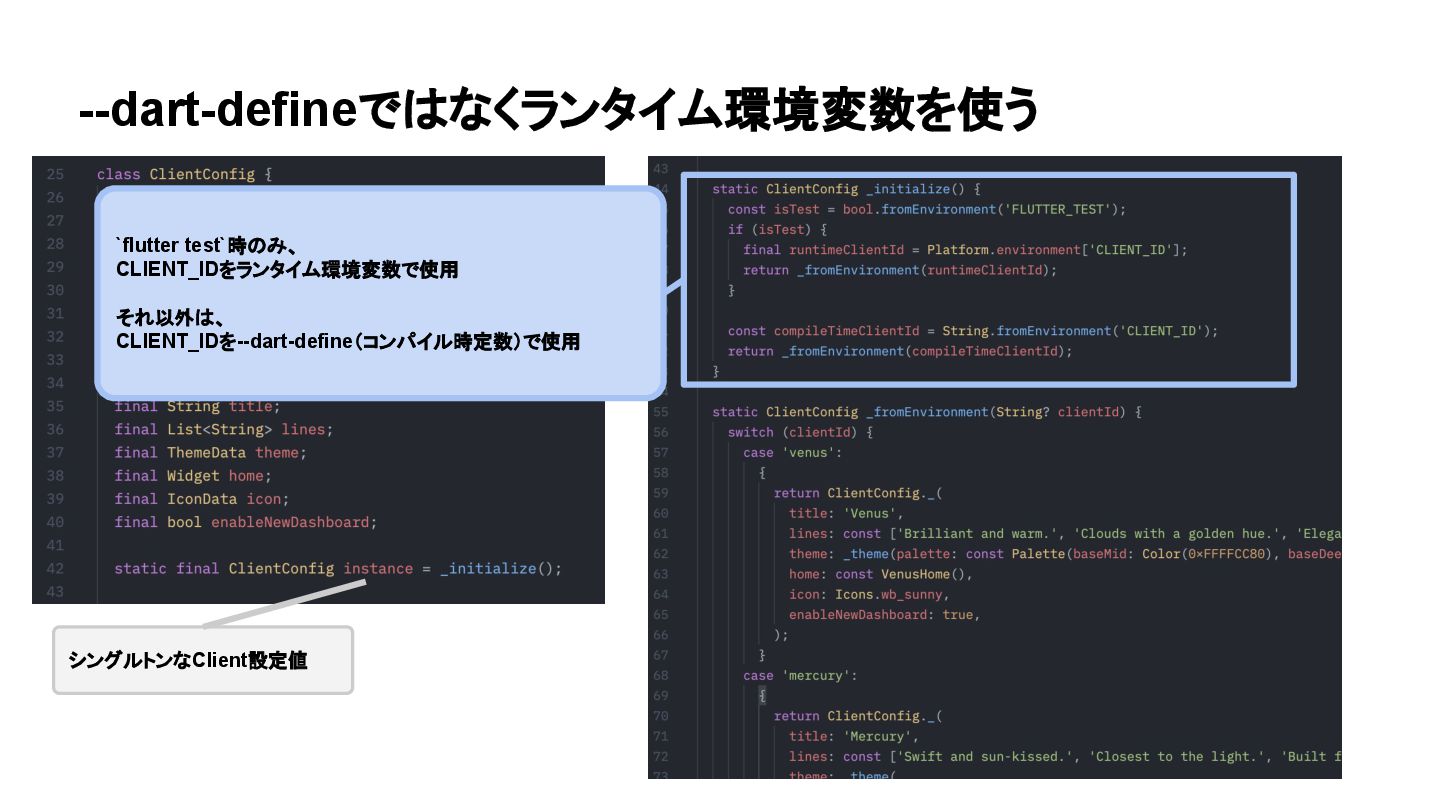 Windows, Linux, etc) ◦ Debug: Kernel → kernel_blob.bin (= .dill) → VMがJIT実行 ◦ Release: Kernel → AOTスナップショット → ネイティブコードとして実行 ▪ 各OSのネイティブ成果物(Android: libapp.so, iOS: App.frameworkのように) • Web(Chrome, Safari, Edge, etc) ◦ Debug: Kernel → dartdevc → JS ◦ Release: Kernel → dart2js → JS(最適化された配布用バンドル) Kernel Dartの中間表現 ネイティブ iOS, Android, Windows, Linux, etc Web Chrome, Safari, Edge, etc Dart Debug Release Debug Release クロスプラットフォーム出力を一本化
