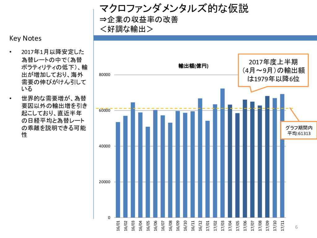 為替レートの変動の後に 日経平均が後を追う綺麗 な正の相関が見られる • つまり、円高(円安)→株 安(株高)だった • しかしながら2017年中ご ろから、安定した為替レー トにも関わらず、EPS(つま り企業の収益性)が上昇 している 5 70 80 90 100 110 120 130 400 600 800 1000 1200 1400 1600 14/01 14/03 14/05 14/07 14/09 14/11 15/01 15/03 15/05 15/07 15/09 15/11 16/01 16/03 16/05 16/07 16/09 16/11 17/01 17/03 17/05 17/07 17/09 17/11 18/01 Nikkei waighted EPS(Left) USDJPY(Right)