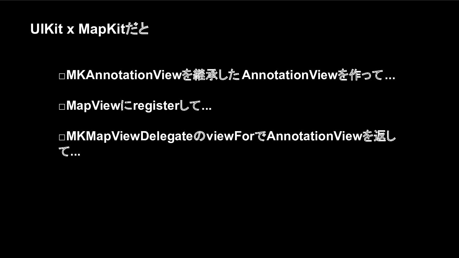 □MKAnnotationViewを継承した AnnotationViewを作って... □MapViewにregisterして... □MKMapViewDelegateのviewForでAnnotationViewを返し て... UIKit x MapKitだと