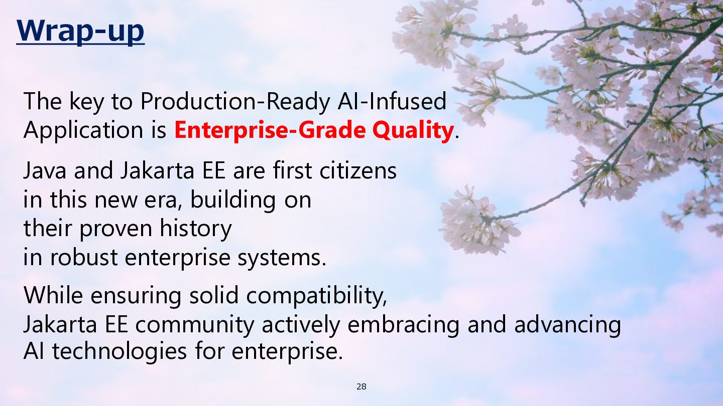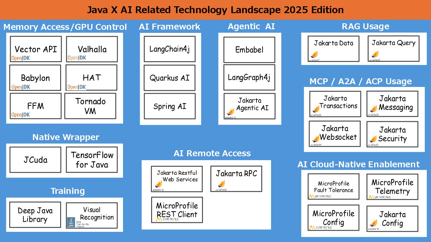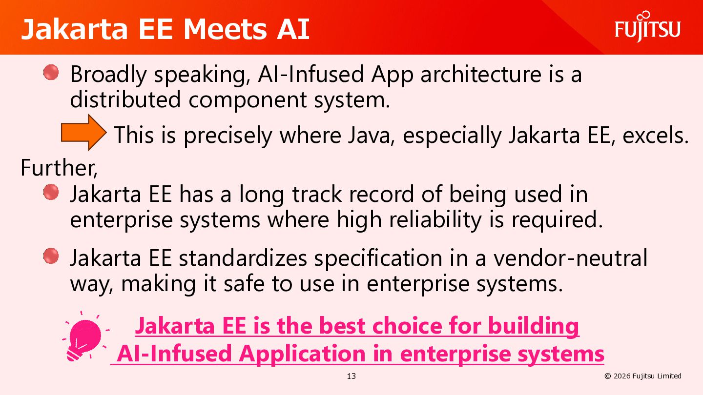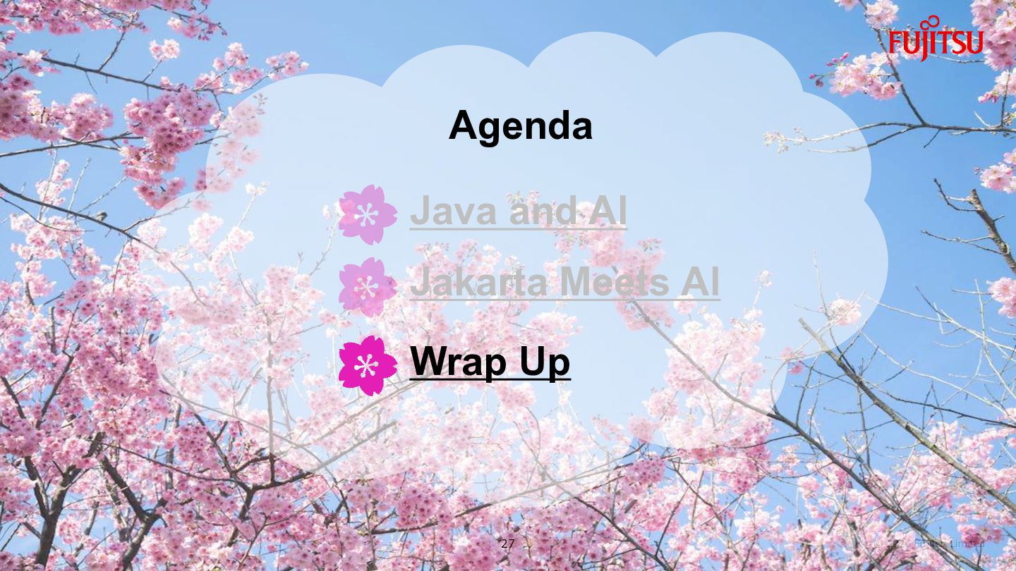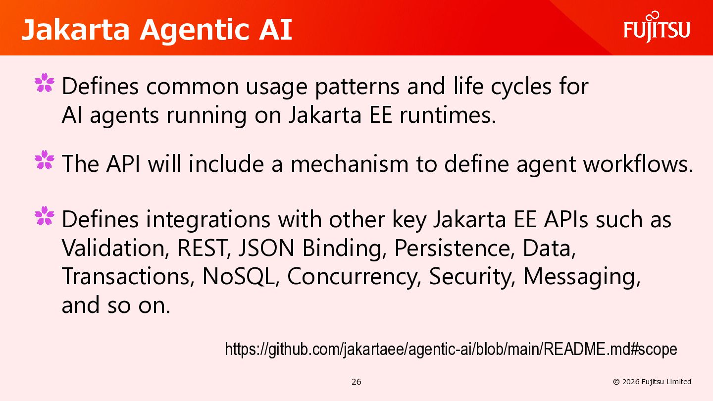 AI Defines common usage patterns and life cycles for AI agents running on Jakarta EE runtimes. The API will include a mechanism to define agent workflows. https://github.com/jakartaee/agentic-ai/blob/main/README.md#scope Defines integrations with other key Jakarta EE APIs such as Validation, REST, JSON Binding, Persistence, Data, Transactions, NoSQL, Concurrency, Security, Messaging, and so on. 26