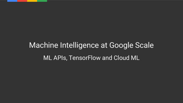 Machine Learning use cases at Google services Externalizing the power with ML APIs TensorFlow: the open source library for ML TensorFlow in the Wild Distributed training and prediction with Cloud ML