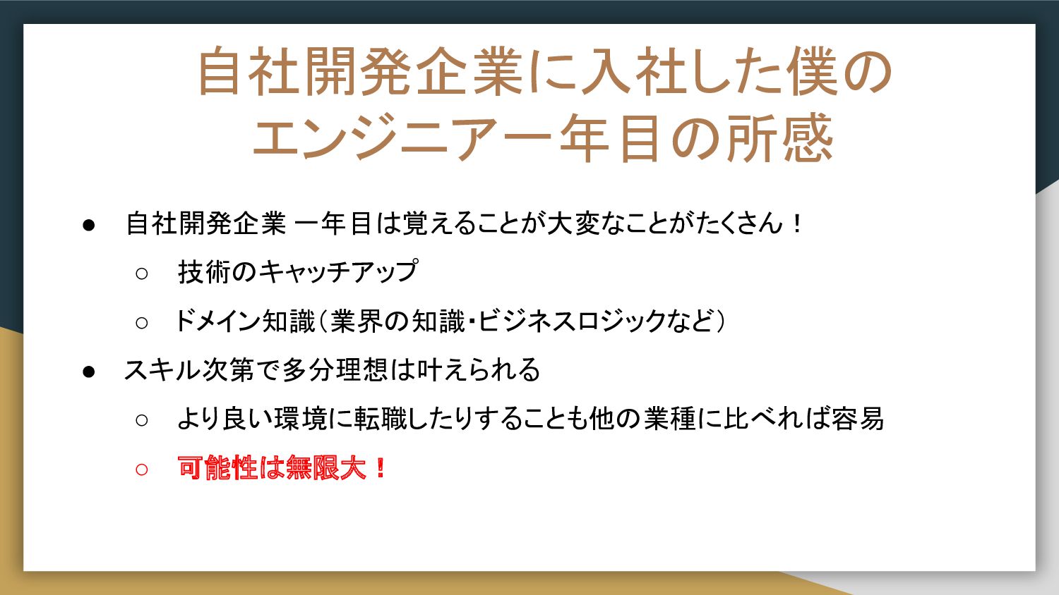 自社開発企業に入社した僕の エンジニア一年目の所感 • 自社開発企業 一年目は覚えることが大変なことがたくさん! ◦ 技術のキャッチアップ ◦ ドメイン知識(業界の知識・ビジネスロジックなど) •