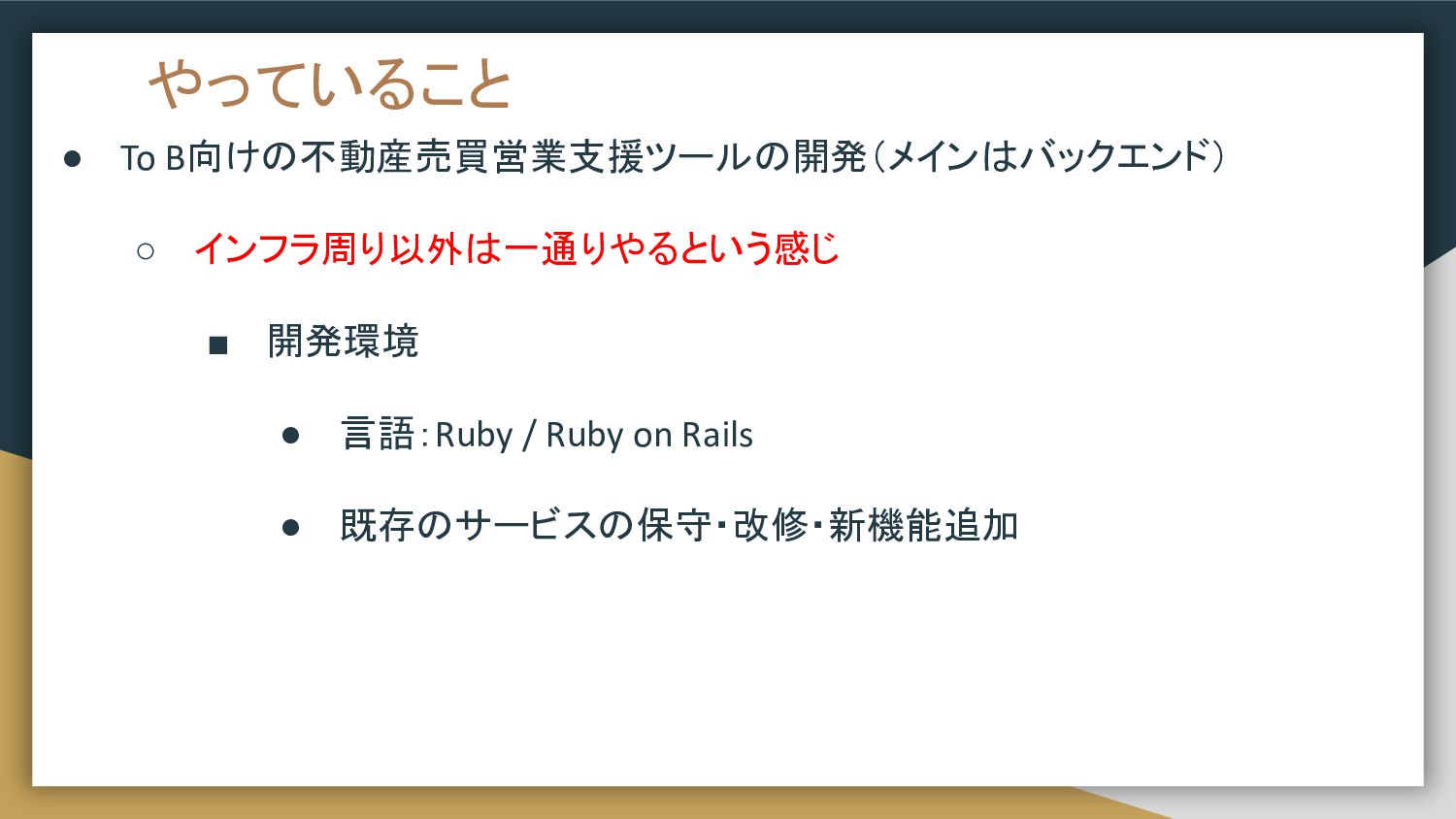 やっていること • To B向けの不動産売買営業支援ツールの開発(メインはバックエンド) ◦ インフラ周り以外は一通りやるという感じ ▪ 開発環境 • 言語:Ruby