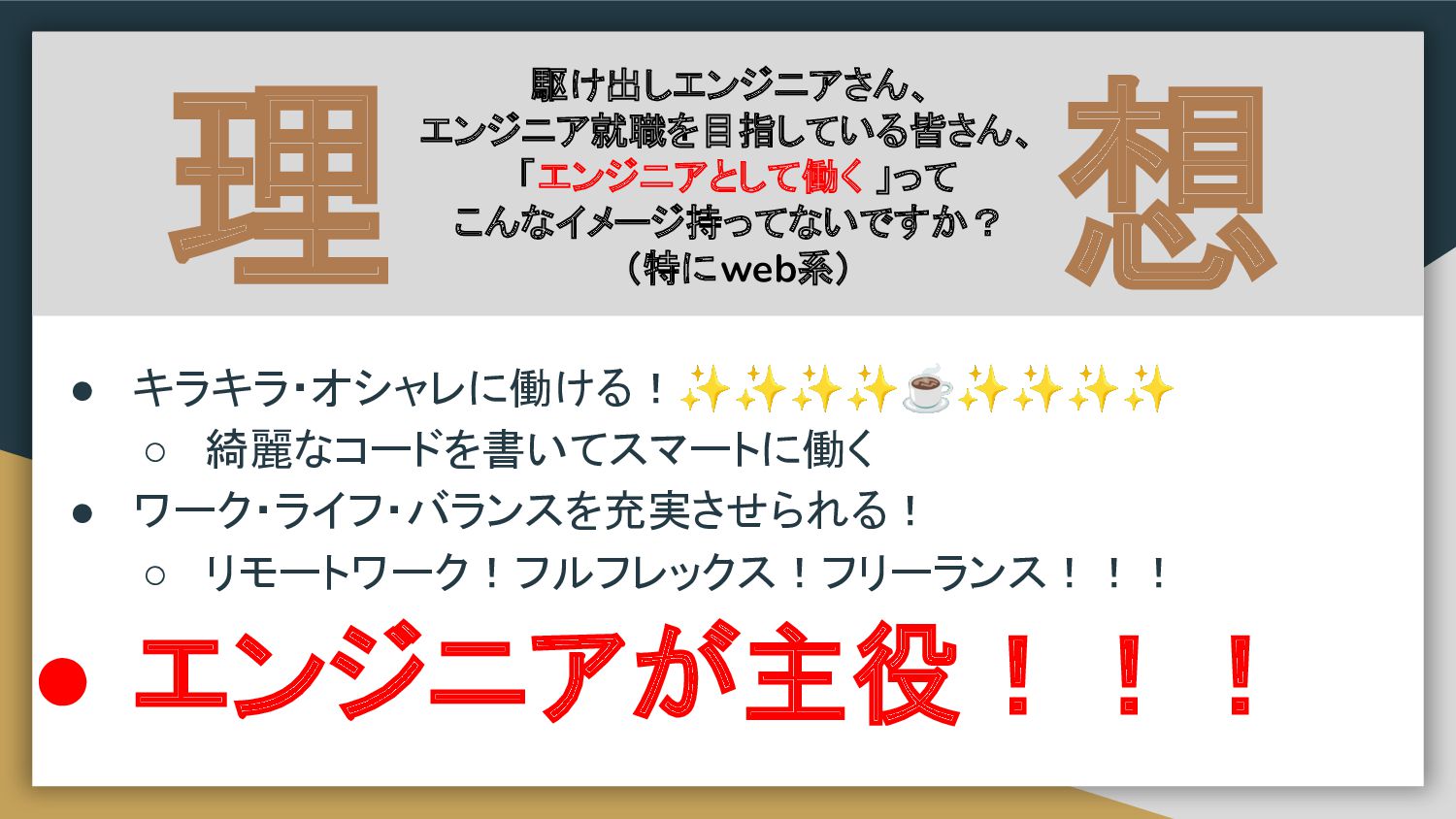◦ 綺麗なコードを書いてスマートに働く • ワーク・ライフ・バランスを充実させられる! ◦ リモートワーク!フルフレックス!フリーランス!!! • エンジニアが主役!!!