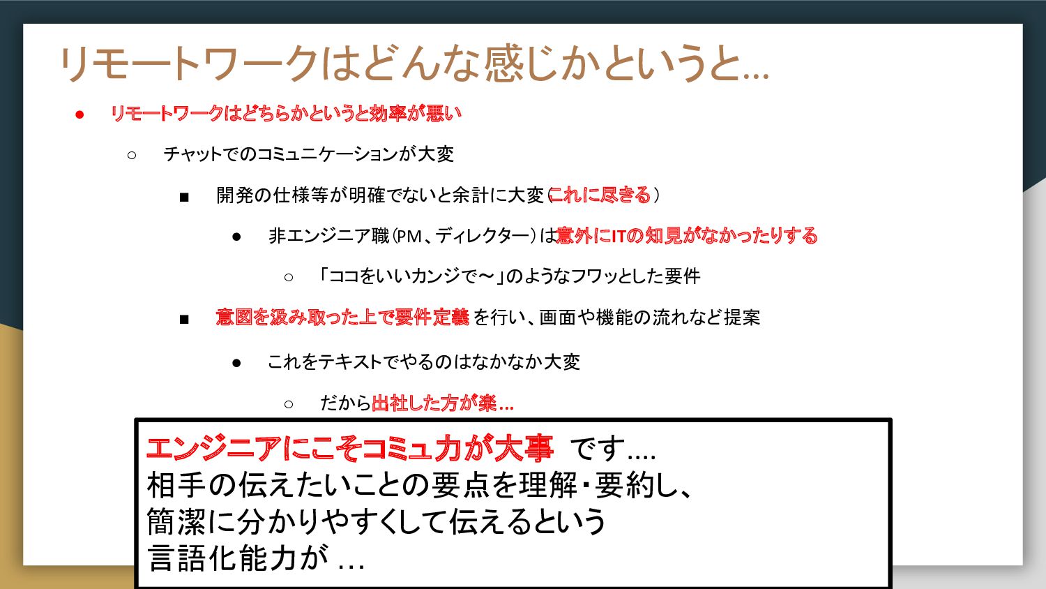 「ココをいいカンジで〜」のようなフワッとした要件 ▪ 意図を汲み取った上で要件定義 を行い、画面や機能の流れなど提案 • これをテキストでやるのはなかなか大変 ◦ だから出社した方が楽... リモートワークはどんな感じかというと... エンジニアにこそコミュ力が大事 です.... 相手の伝えたいことの要点を理解・要約し、 簡潔に分かりやすくして伝えるという 言語化能力が …