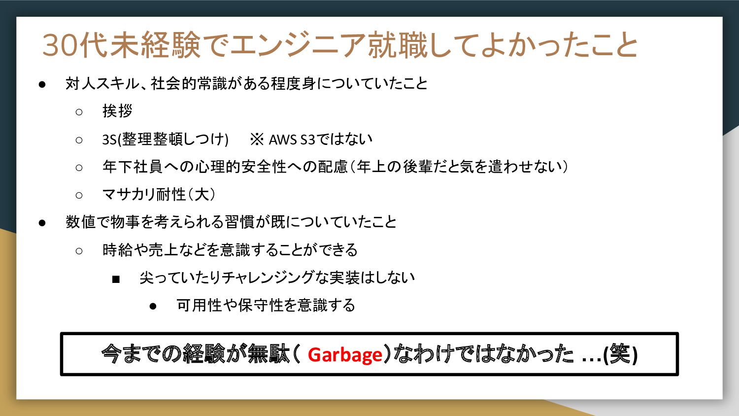 30代未経験でエンジニア就職してよかったこと • 対人スキル、社会的常識がある程度身についていたこと ◦ 挨拶 ◦ 3S(整理整頓しつけ) ※ AWS S3ではない ◦