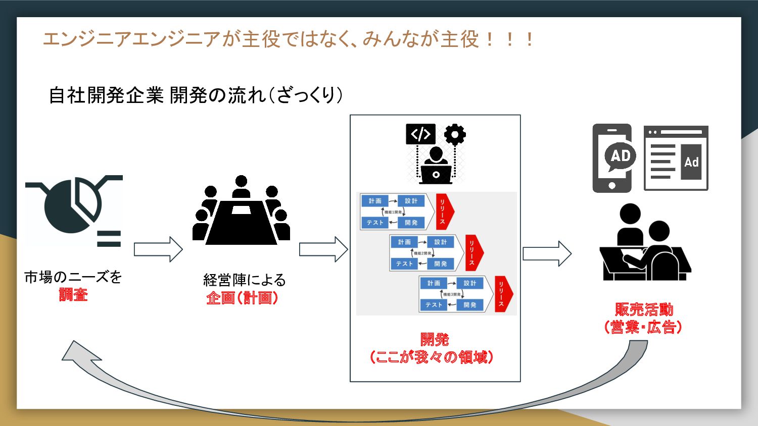 自社開発企業 開発の流れ(ざっくり) エンジニアエンジニアが主役ではなく、みんなが主役!!! 市場のニーズを 調査 経営陣による 企画(計画) 開発 (ここが我々の領域) 販売活動