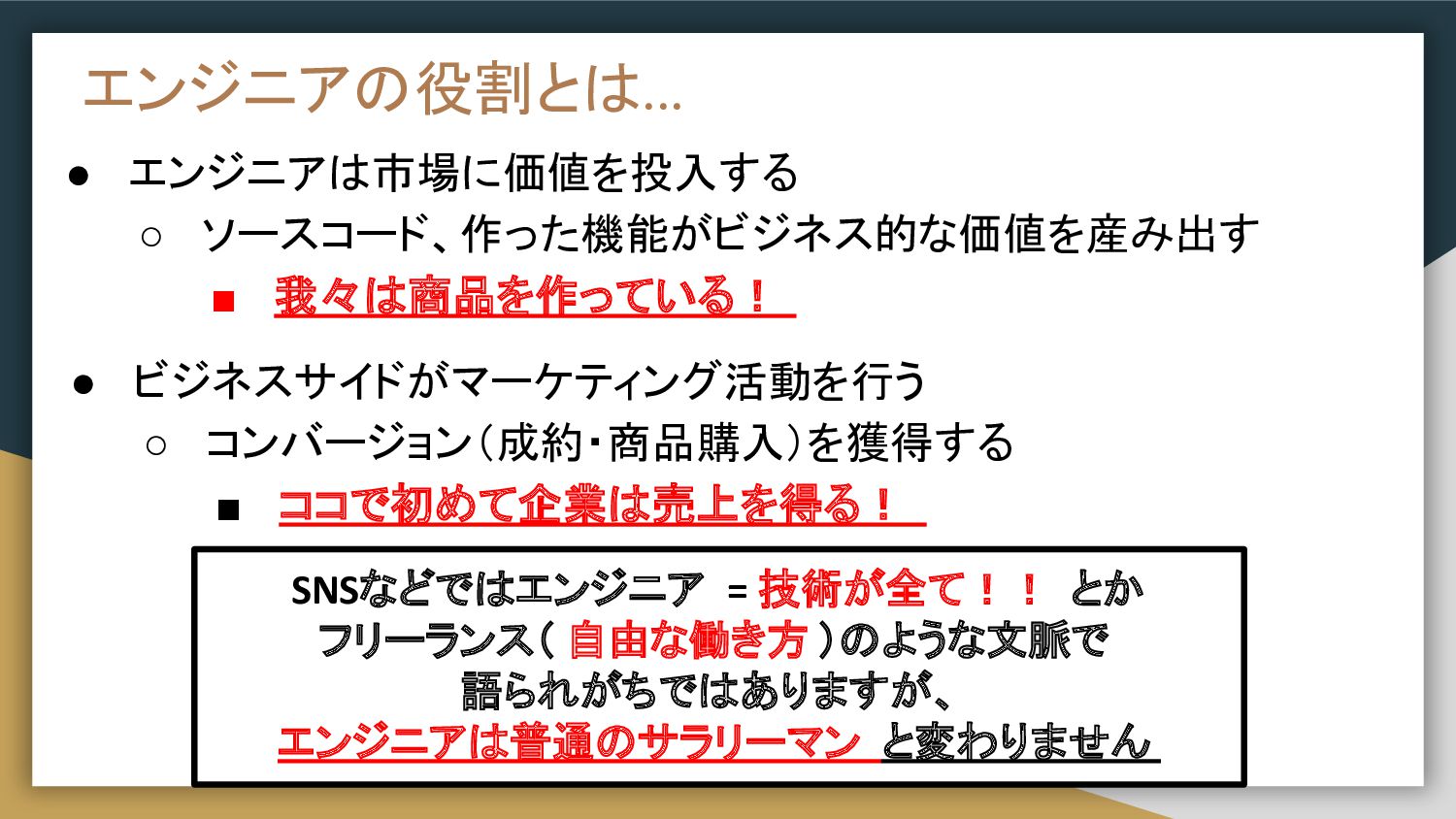 エンジニアの役割とは... • ビジネスサイドがマーケティング活動を行う ◦ コンバージョン(成約・商品購入)を獲得する ▪ ココで初めて企業は売上を得る! • エンジニアは市場に価値を投入する ◦