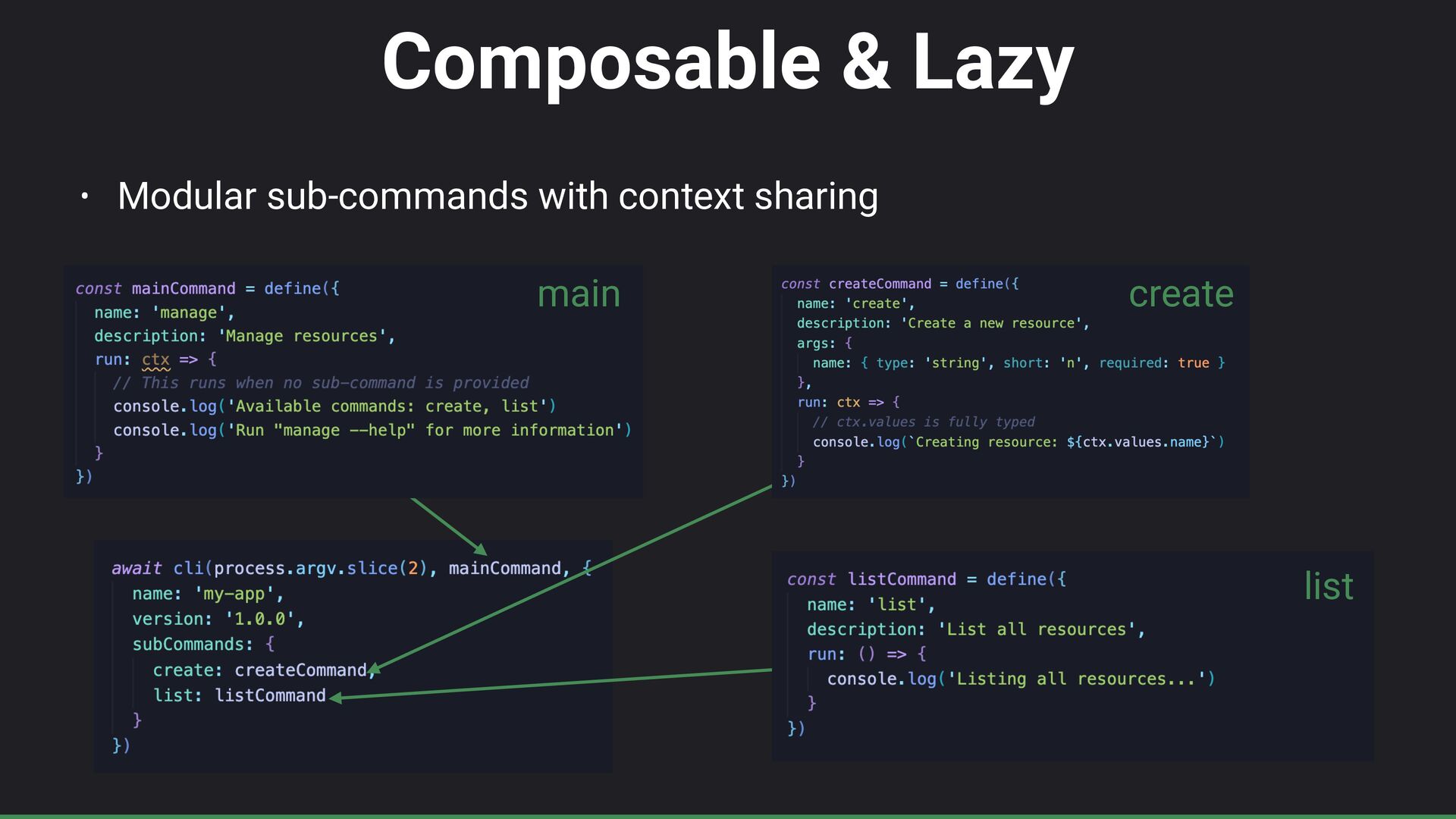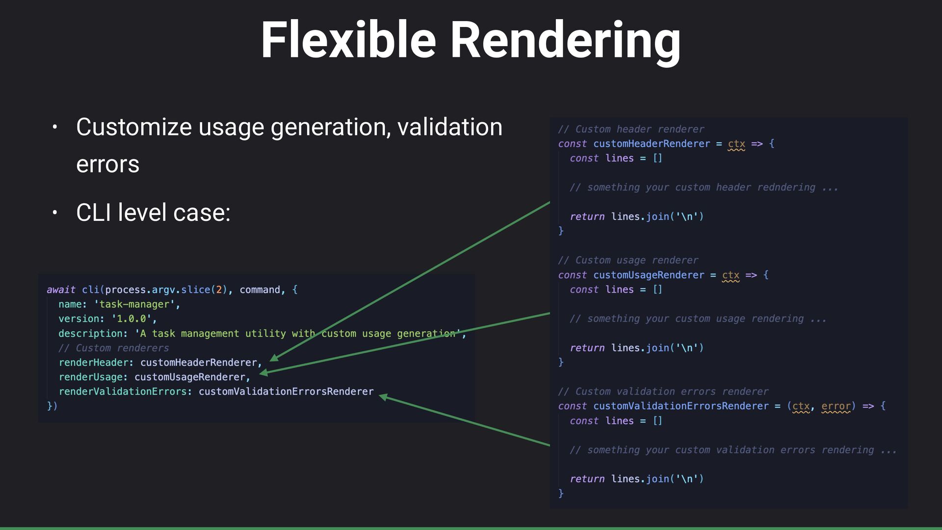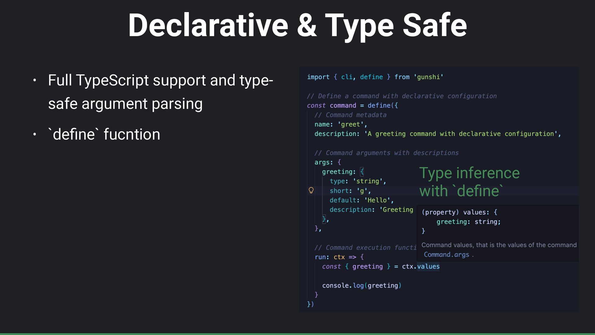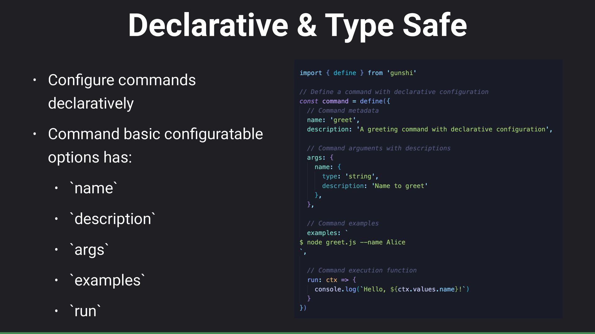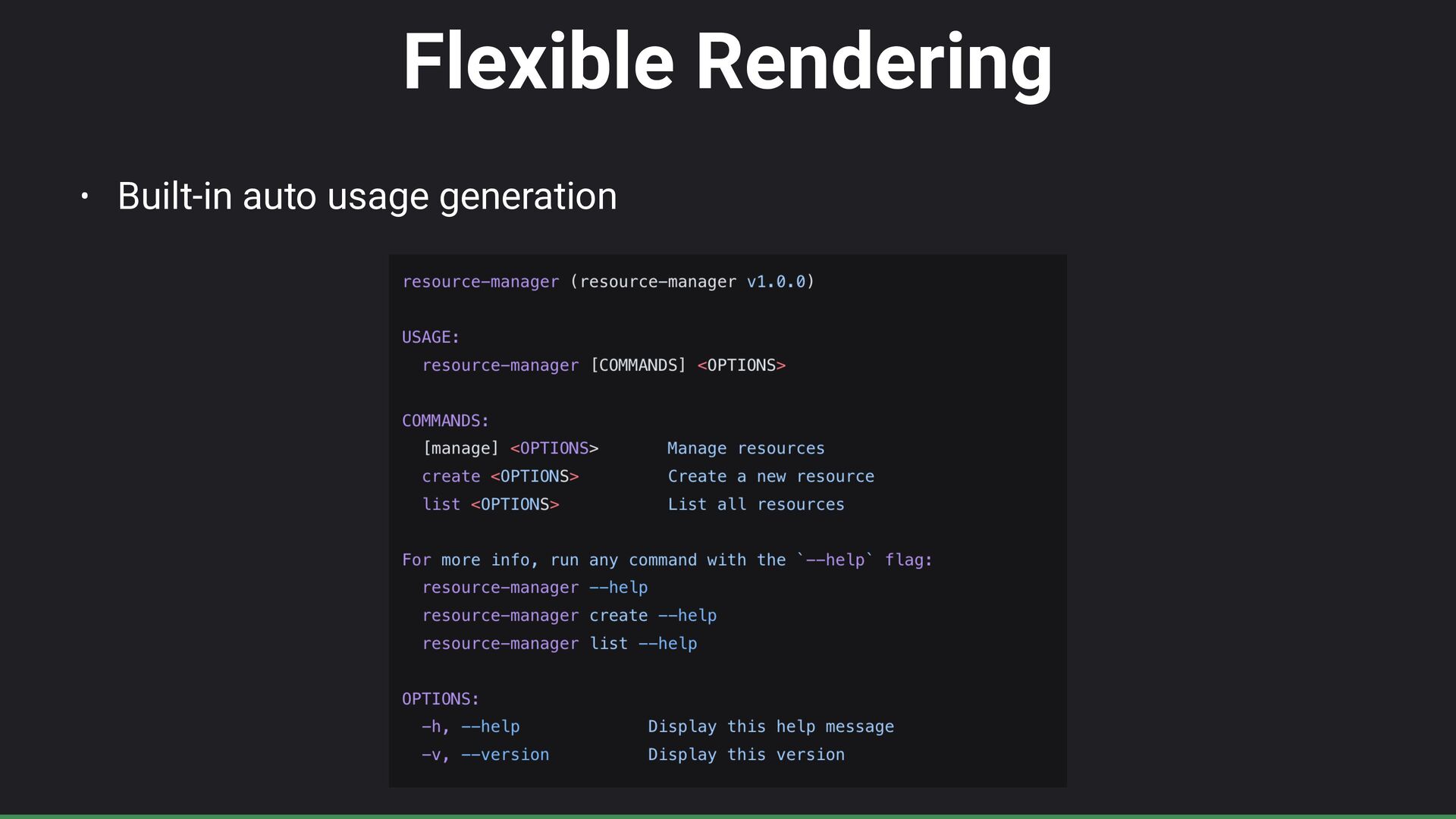 properties • `type`: 'string', 'number', 'boolean', ‘positional', ‘enum’, 'custom' • `description`: A description of what the option does • `short`: A single-character alias (e.g. -n for —name) • `default`: Default value if the option is not provided • `required`: Set to `true` if the option is required • `multiple`: Set to `true` if multiple option values are allowed