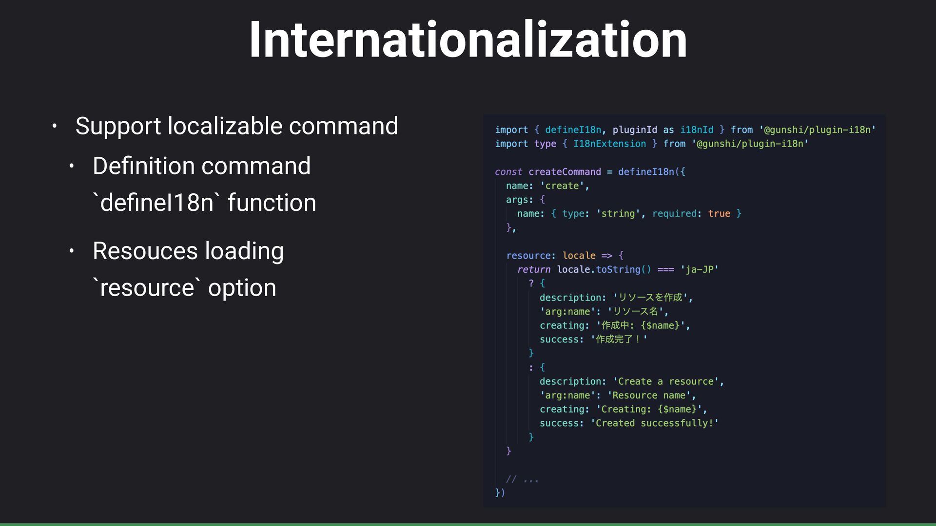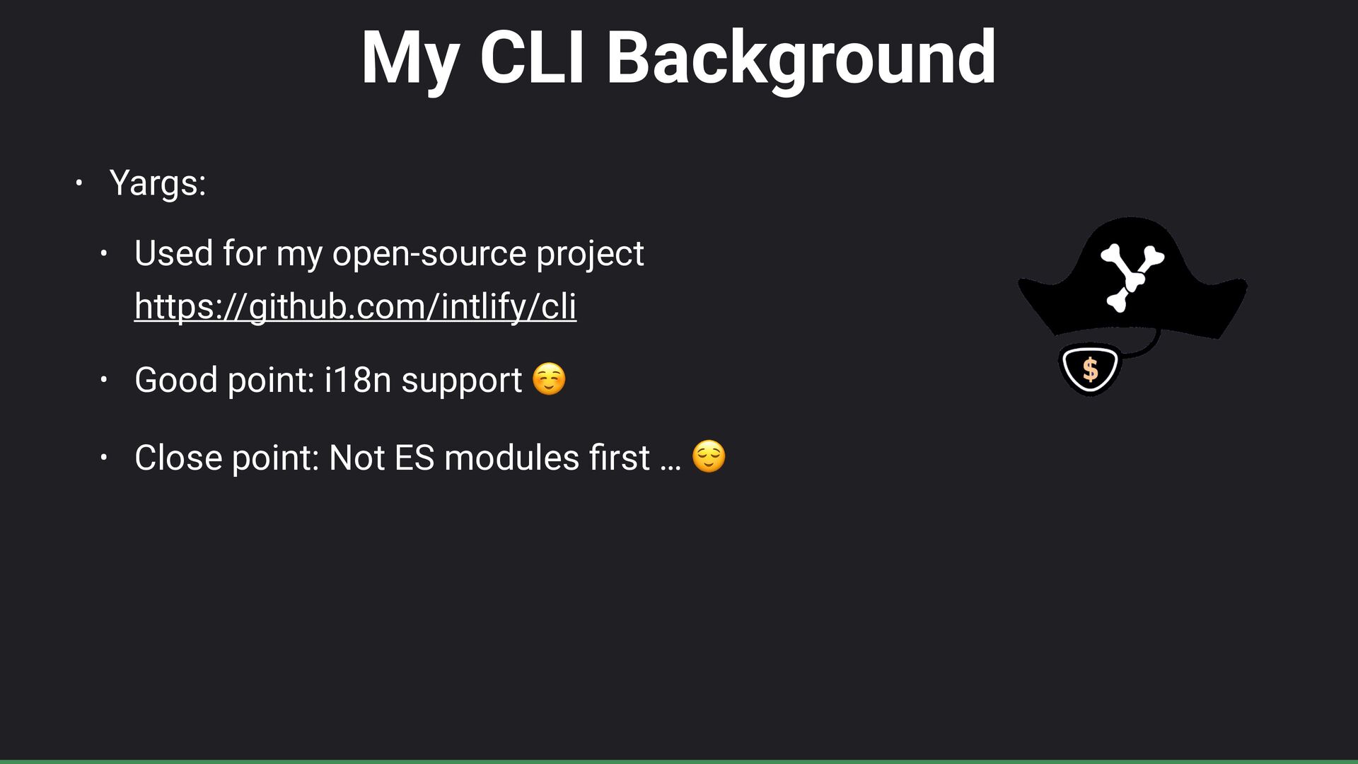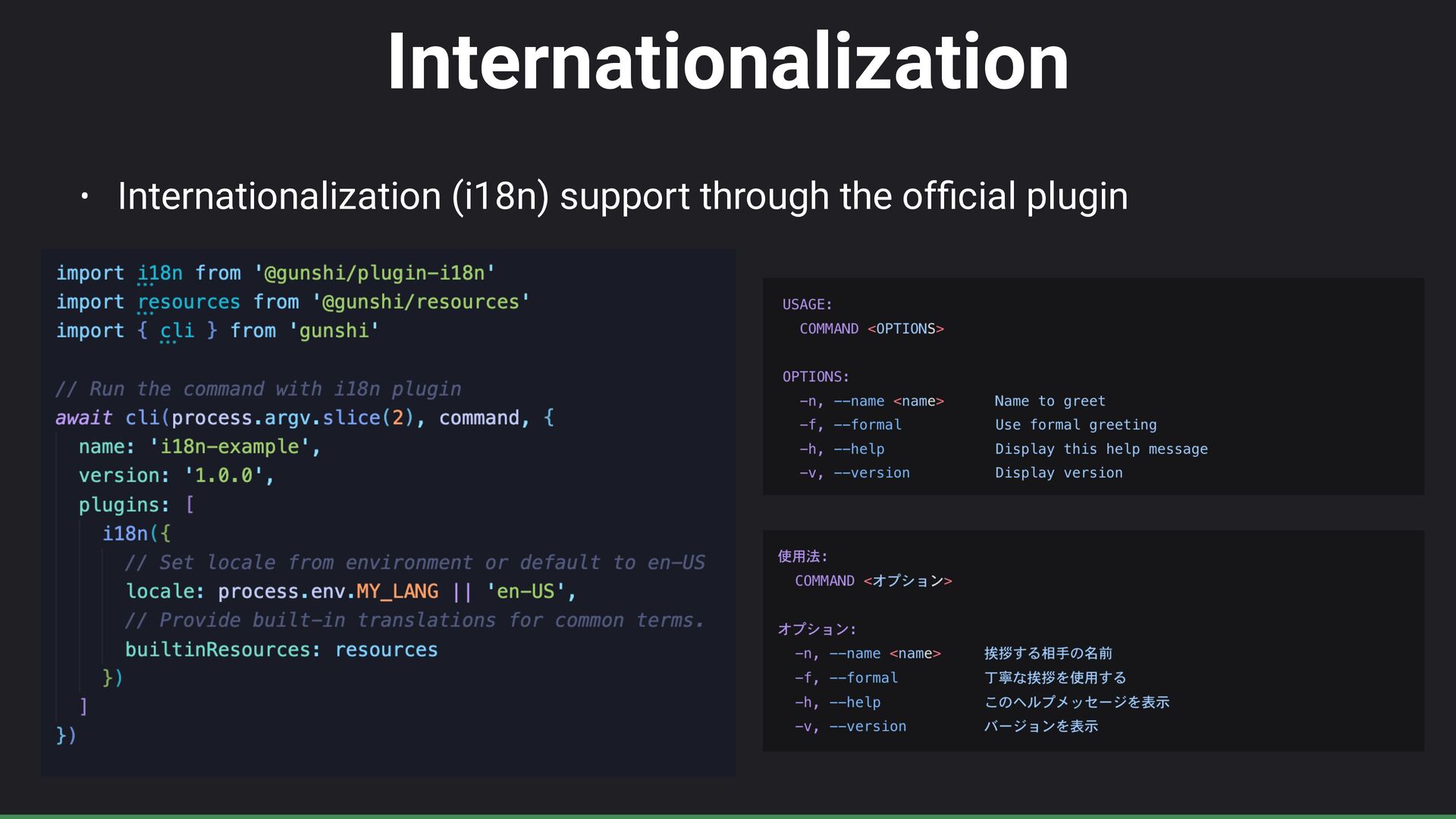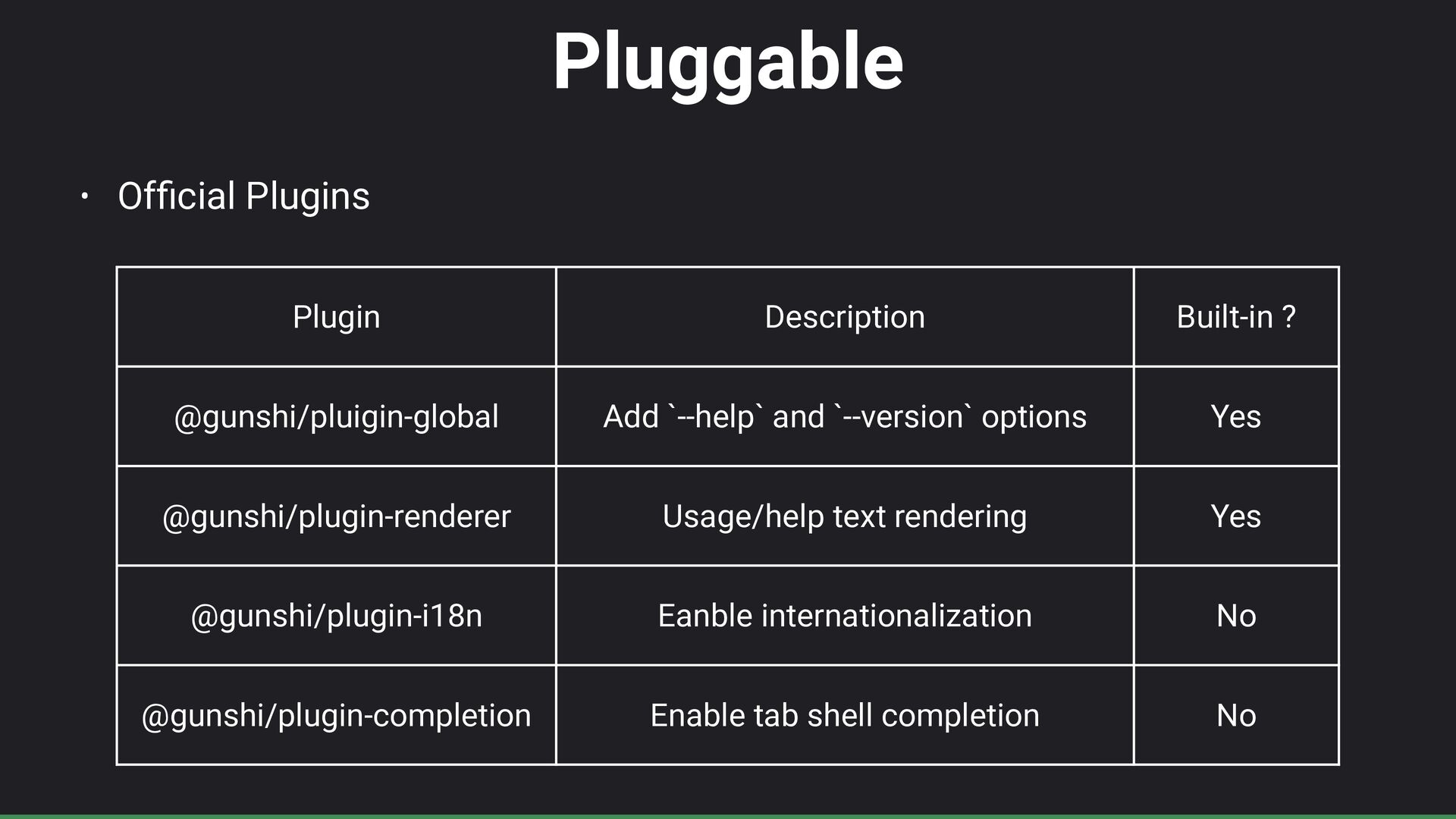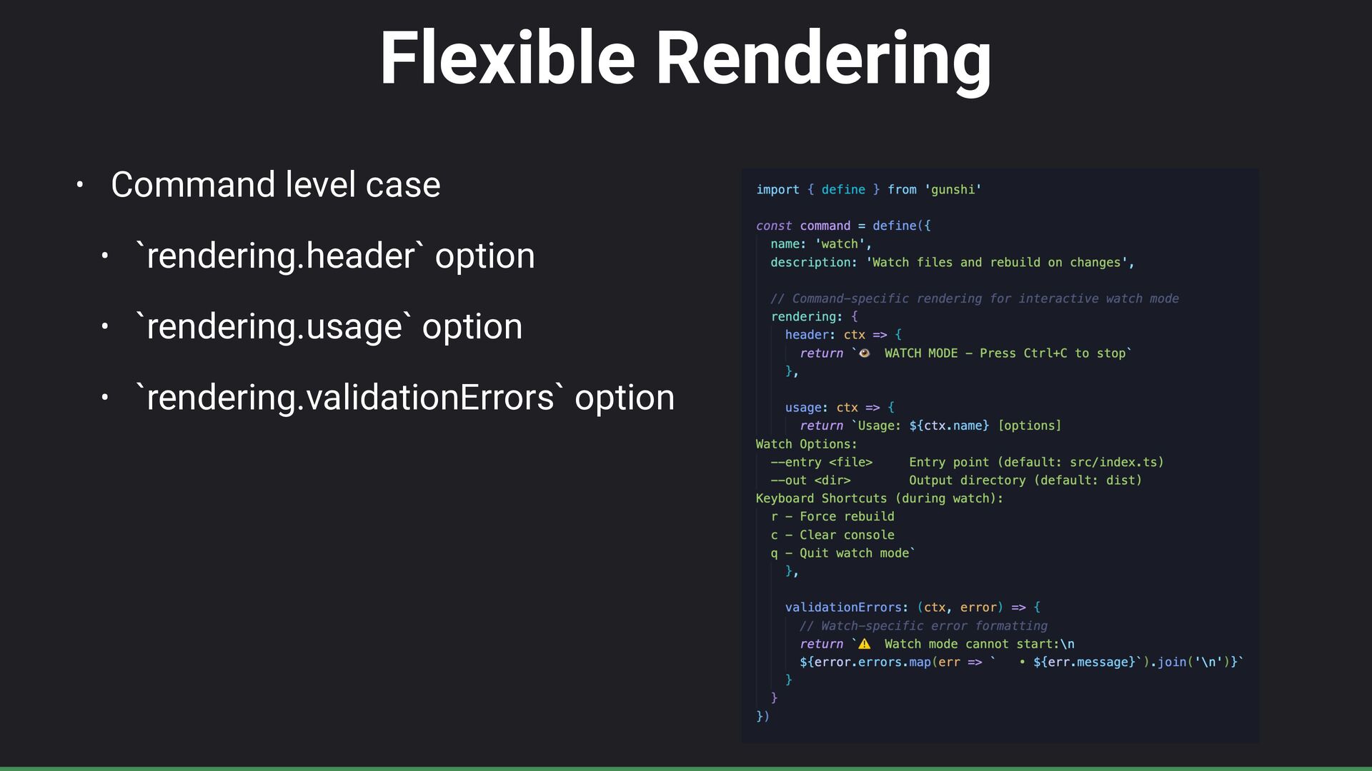 properties • `type`: 'string', 'number', 'boolean', ‘positional', ‘enum’, 'custom' • `description`: A description of what the option does • `short`: A single-character alias (e.g. -n for —name) • `default`: Default value if the option is not provided • `required`: Set to `true` if the option is required • `multiple`: Set to `true` if multiple option values are allowed