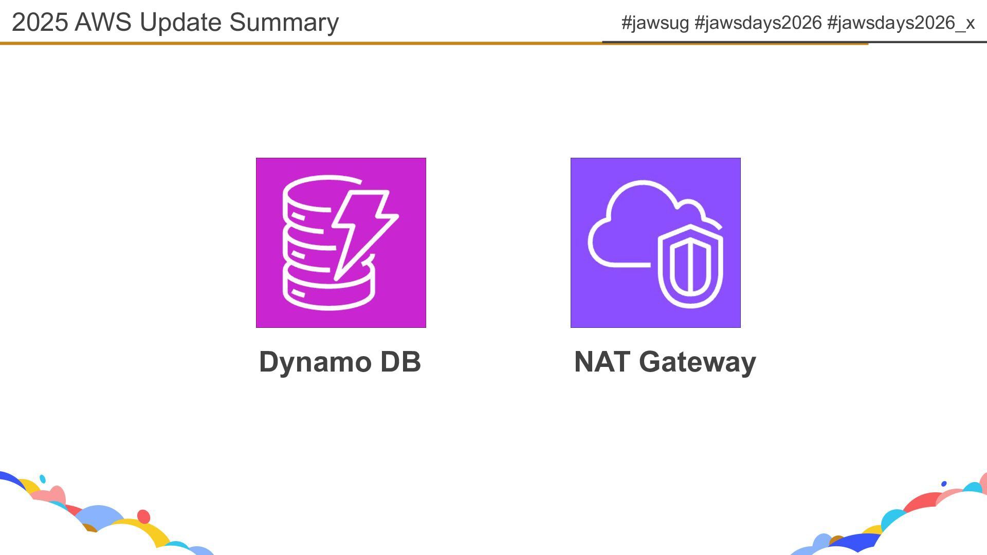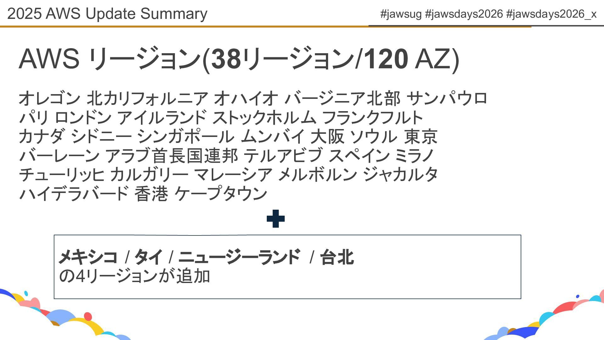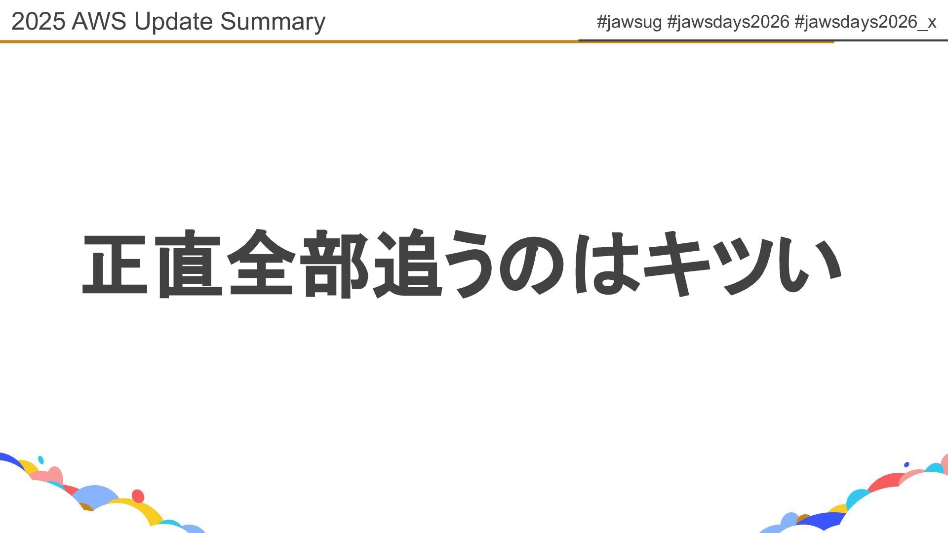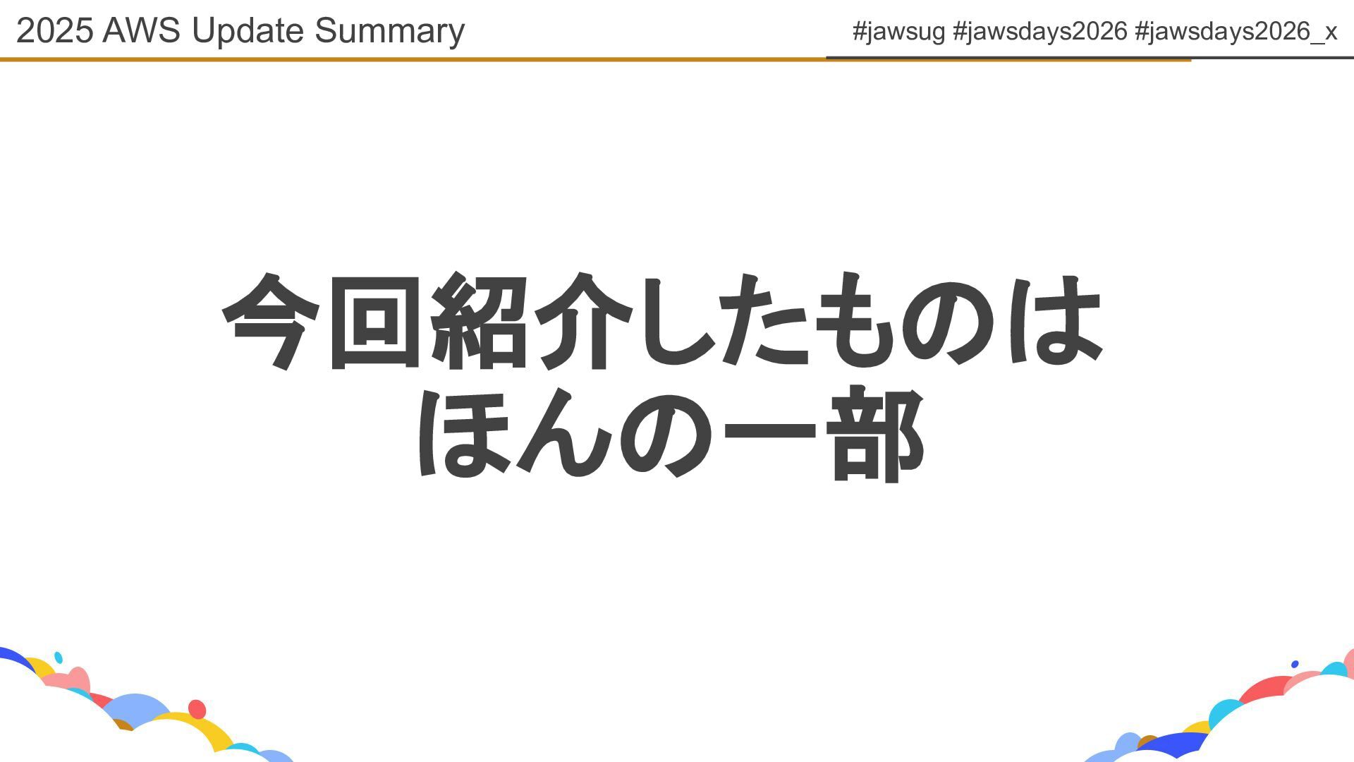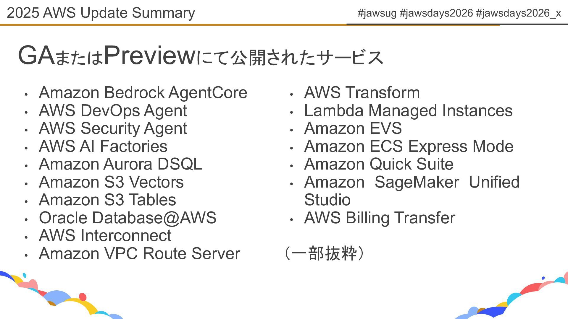 Agent • AWS Security Agent • AWS AI Factories • Amazon Aurora DSQL • Amazon S3 Vectors • Amazon S3 Tables • Oracle Database@AWS • AWS Interconnect • Amazon VPC Route Server GAまたはPreviewにて公開されたサービス 2025 AWS Update Summary • AWS Transform • Lambda Managed Instances • Amazon EVS • Amazon ECS Express Mode • Amazon Quick Suite • Amazon SageMaker Unified Studio • AWS Billing Transfer (一部抜粋)