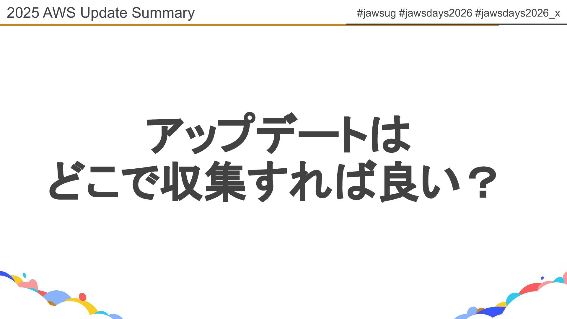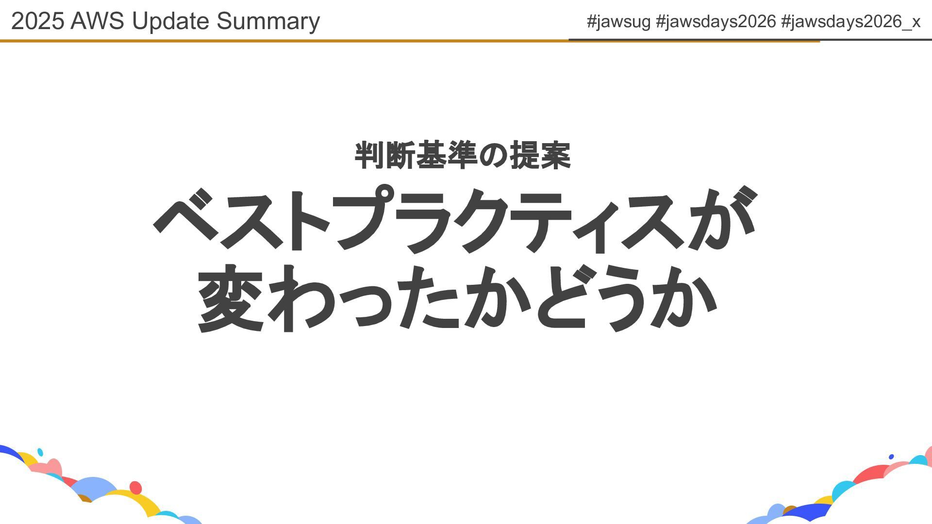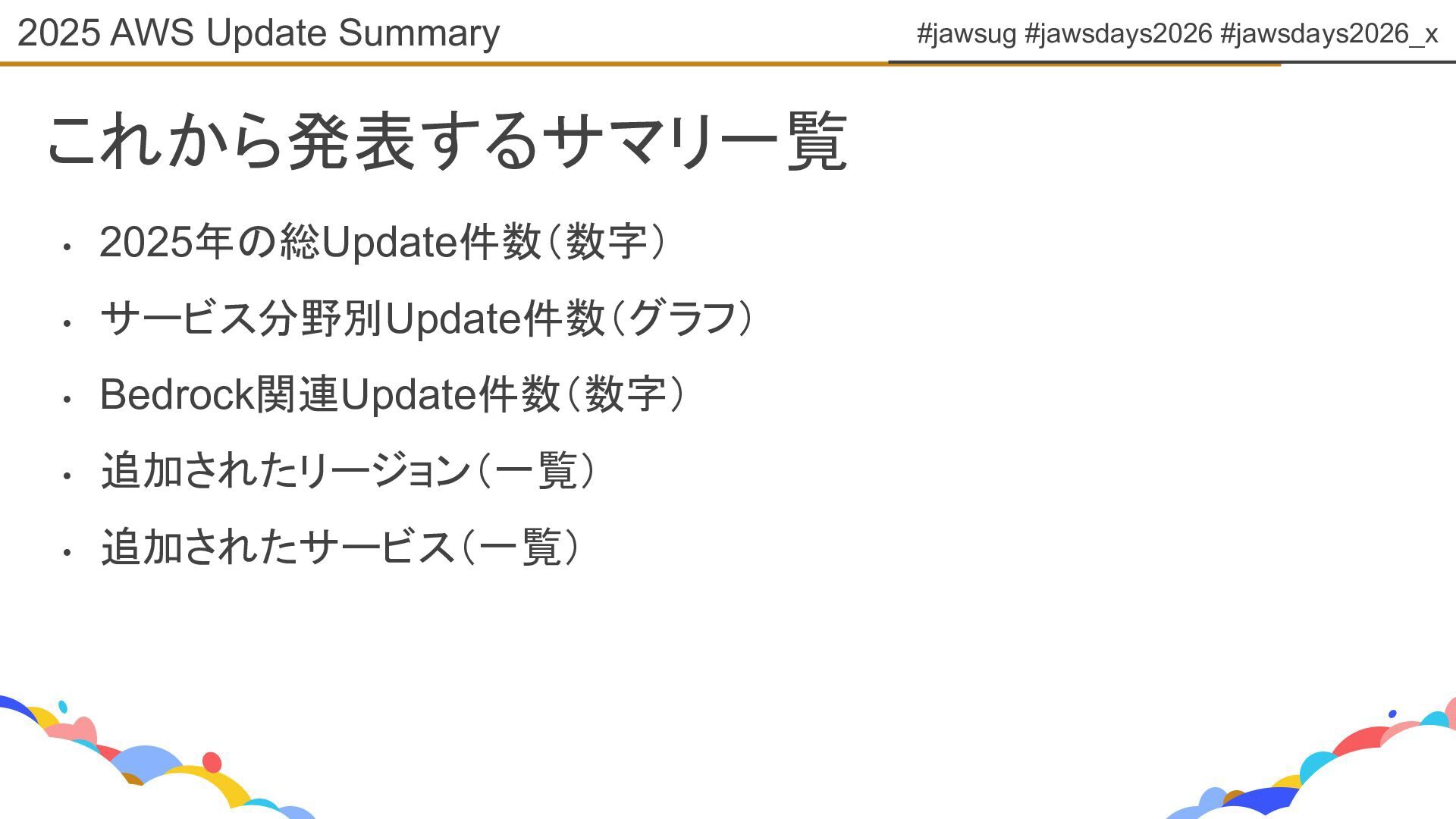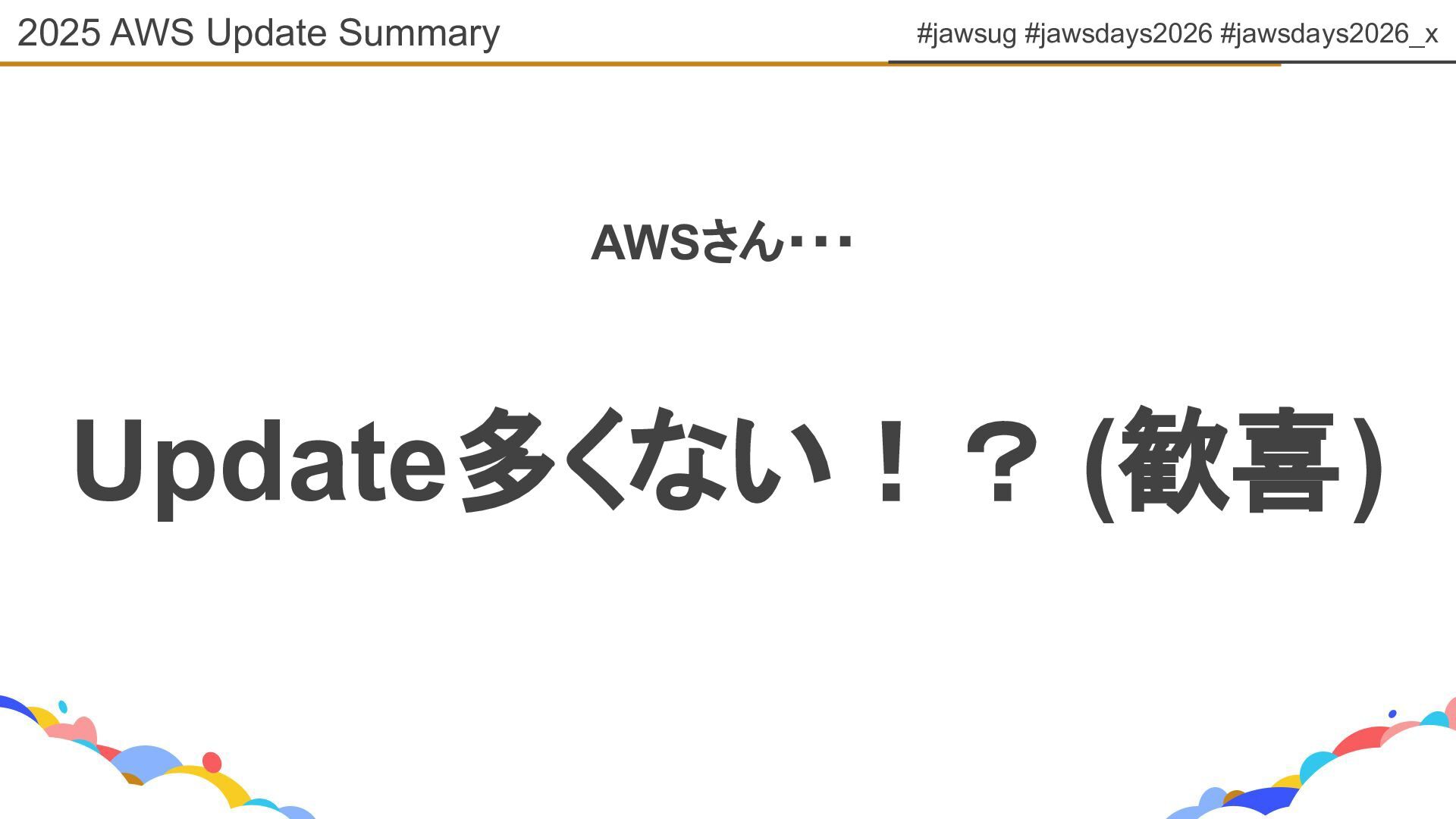 Agent • AWS Security Agent • AWS AI Factories • Amazon Aurora DSQL • Amazon S3 Vectors • Amazon S3 Tables • Oracle Database@AWS • AWS Interconnect • Amazon VPC Route Server GAまたはPreviewにて公開されたサービス 2025 AWS Update Summary • AWS Transform • Lambda Managed Instances • Amazon EVS • Amazon ECS Express Mode • Amazon Quick Suite • Amazon SageMaker Unified Studio • AWS Billing Transfer (一部抜粋)