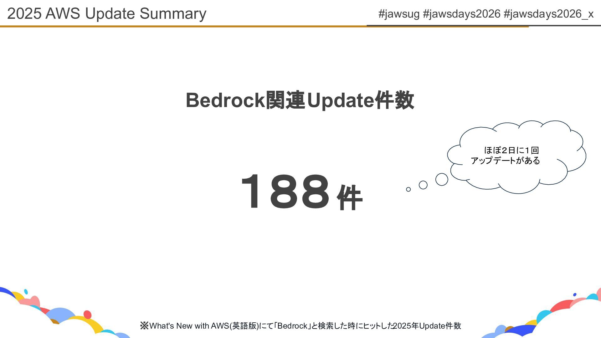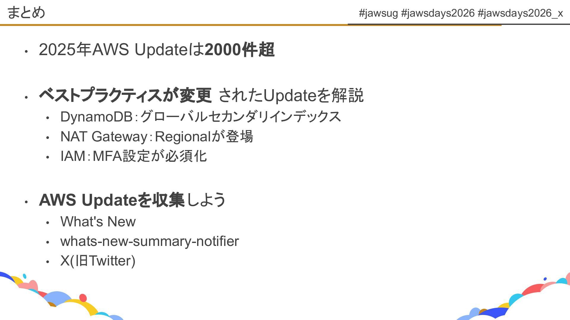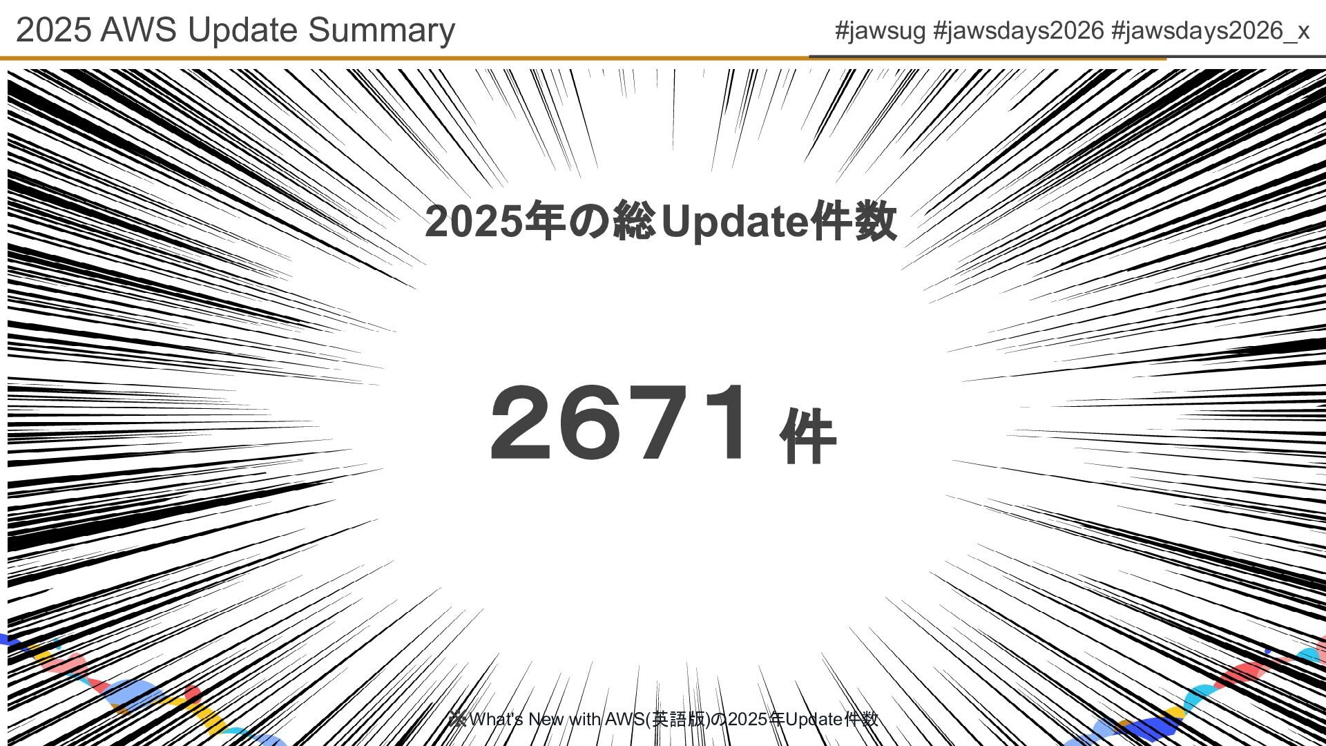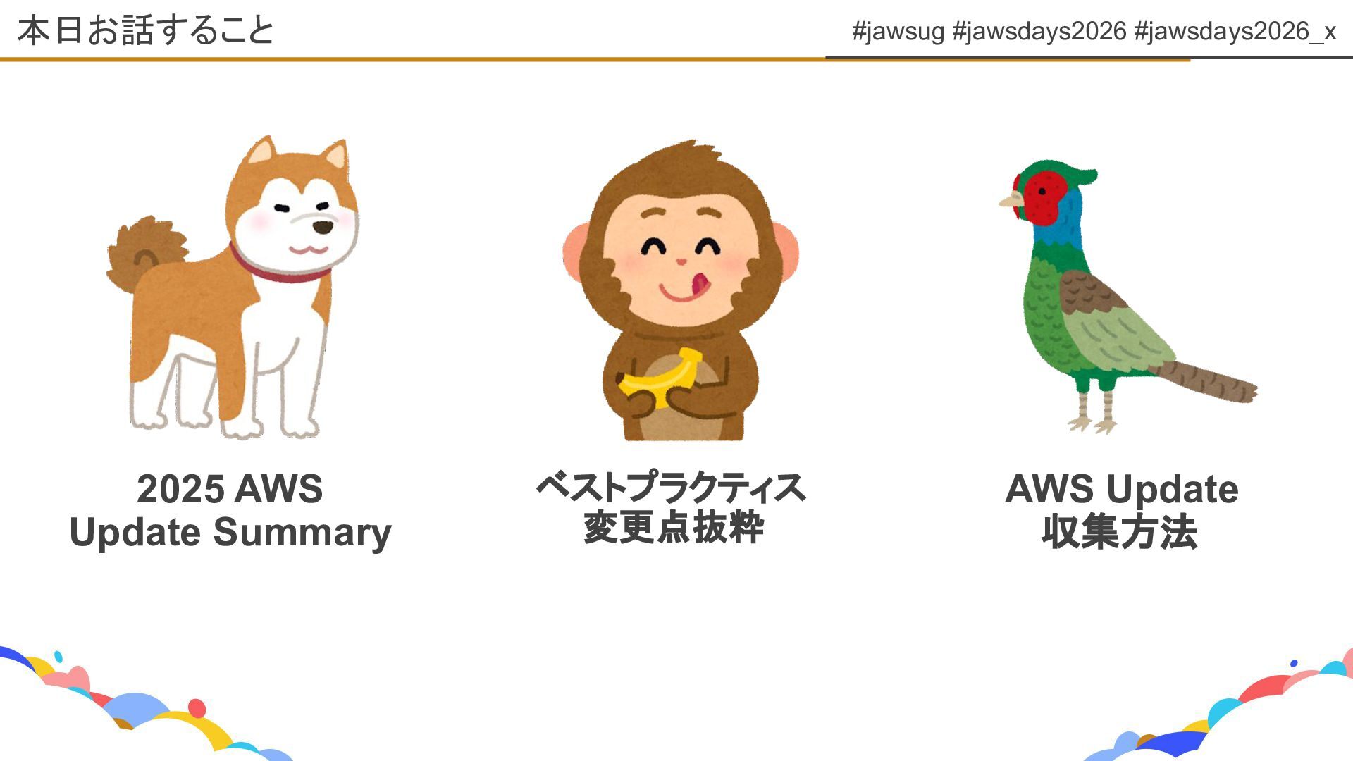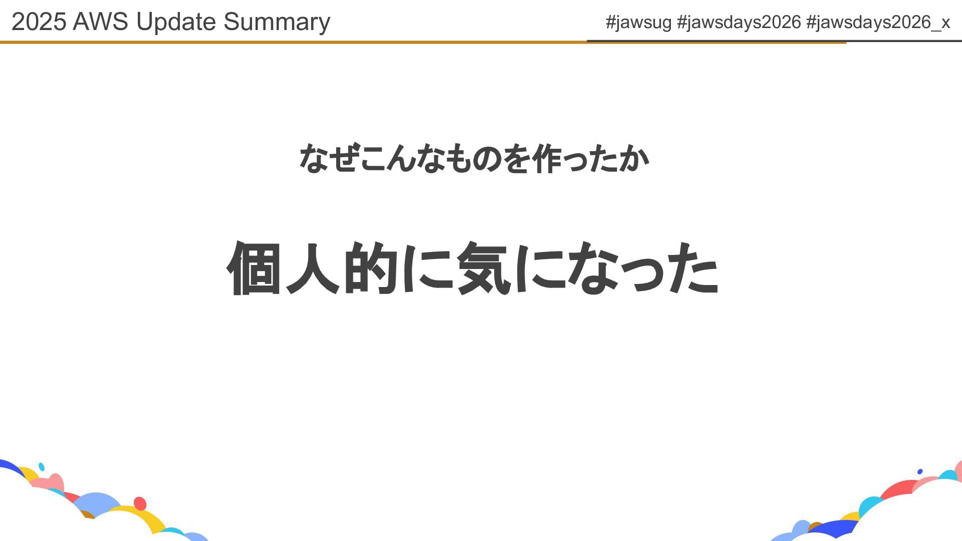 Agent • AWS Security Agent • AWS AI Factories • Amazon Aurora DSQL • Amazon S3 Vectors • Amazon S3 Tables • Oracle Database@AWS • AWS Interconnect • Amazon VPC Route Server GAまたはPreviewにて公開されたサービス 2025 AWS Update Summary • AWS Transform • Lambda Managed Instances • Amazon EVS • Amazon ECS Express Mode • Amazon Quick Suite • Amazon SageMaker Unified Studio • AWS Billing Transfer (一部抜粋)