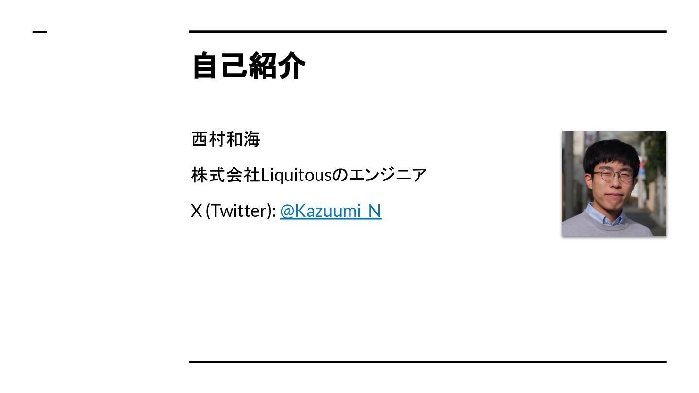 西村和海 株式会社Liquitousのエンジニア X (Twitter): @Kazuumi_N 自己紹介