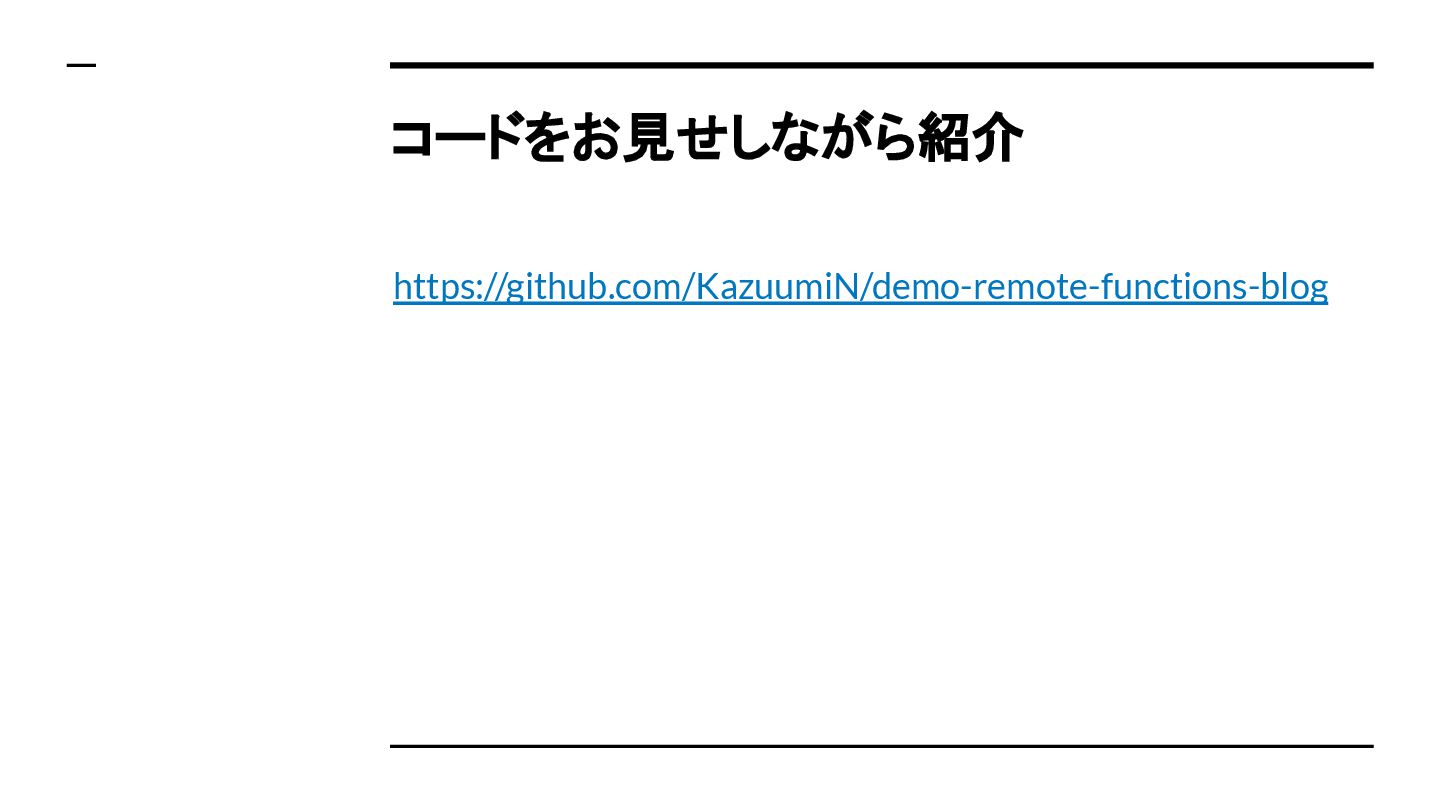 コードをお見せしながら紹介 https://github.com/KazuumiN/demo-remote-functions-blog