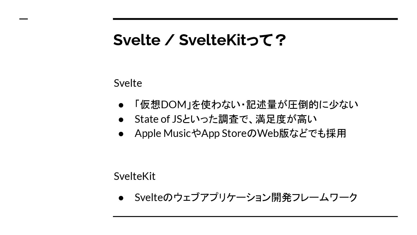 Svelte • 「仮想DOM」を使わない・記述量が圧倒的に少ない • State of JSといった調査で、満足度が高い • Apple MusicやApp