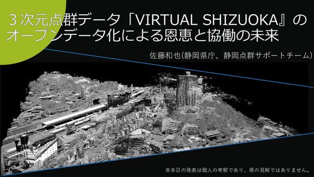 「Virtulal Shizuoka」は、静岡県が取得・オープンデータとして公開している、県土の高密度色付き3次元点群データです。2019年度の伊豆半島東部・熱海を皮切りに、2023年度に静岡県全域のデータを取得・オープンデータ化しています。点群データは、デジタルツインとして可視化、分析、シミュレーションなどの様々な用途に利用され、オープンデータによるイノベーションに結び付いています。また、最近では、活用方法を共有し利用者の裾野を増やす流れにもつながり始めています。