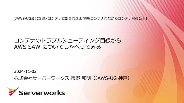 2024年11月2日に JAWS-UG 金沢支部と、JAWS-UG コンテナ支部の共同開催イベント「JAWS-UG金沢支部×コンテナ支部合同企画 物理コンテナ見ながらコンテナ勉強会!」( https://jawsug-kanazawa.connpass.com/event/325803/ )でお話しした時の資料です。