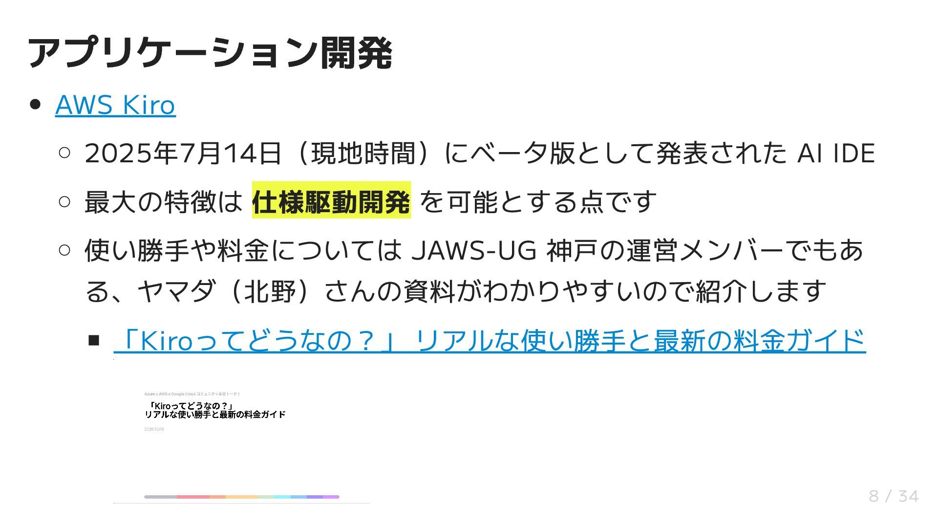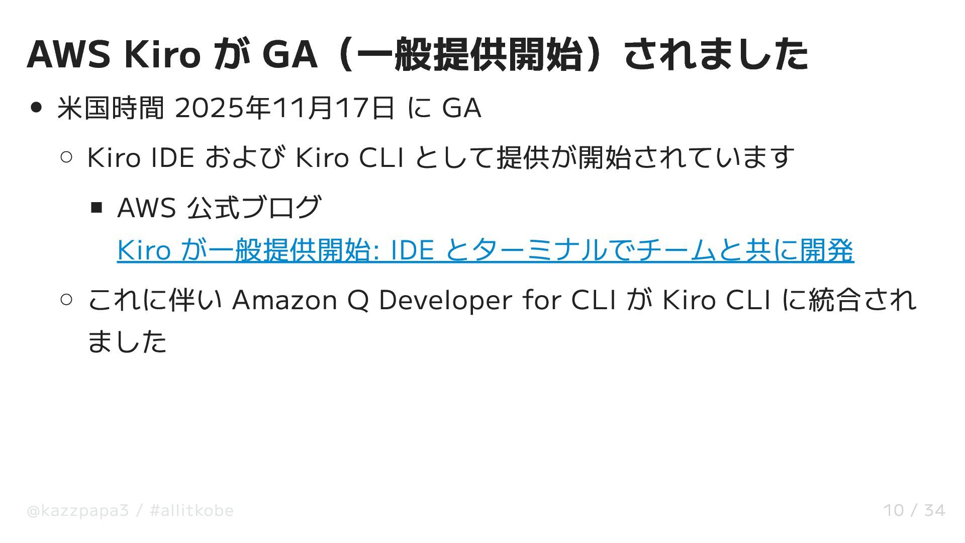テクニカルサポートエンジニアとして Amazon Q Developer for CLI を活用したトラブルシュートを模索している取り組みをベースに AWS の AI サービスの紹介をさせていただきました。(あとは Kiro の GA に伴う急な資料修正に追い立てられた件も話しました)