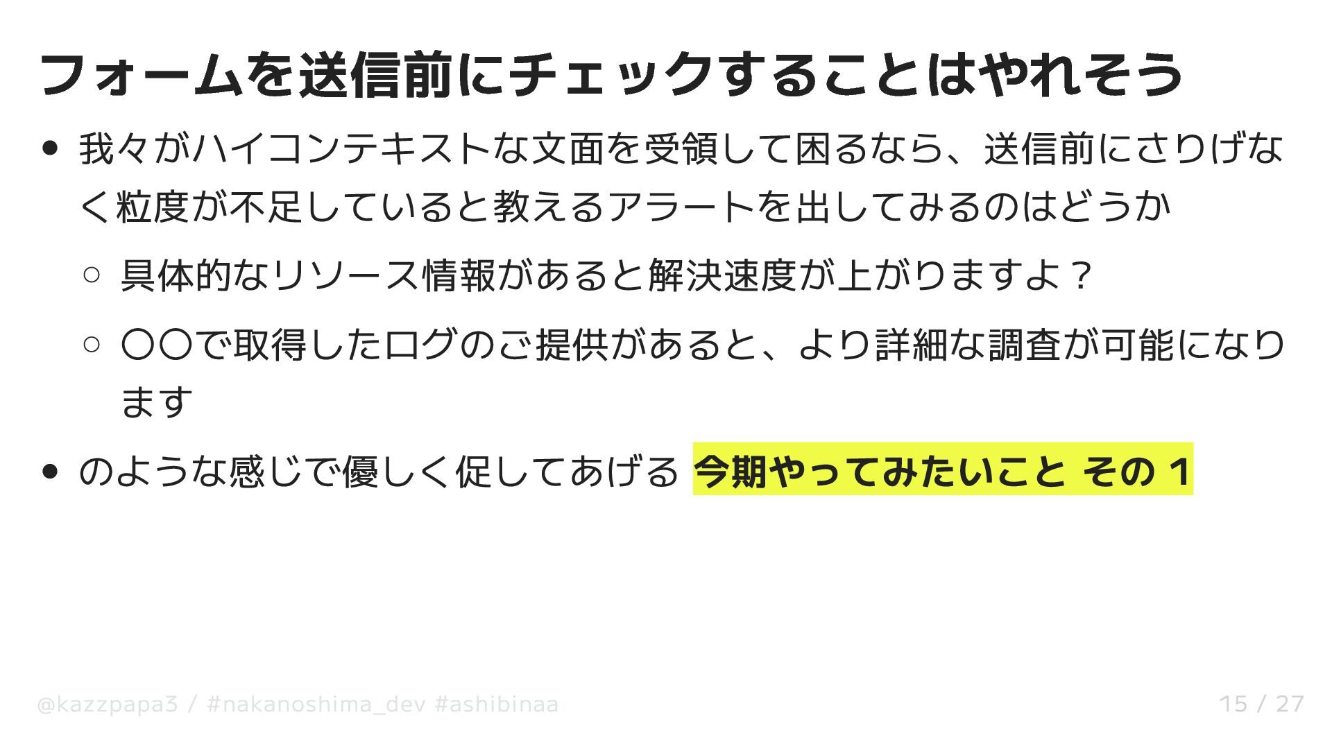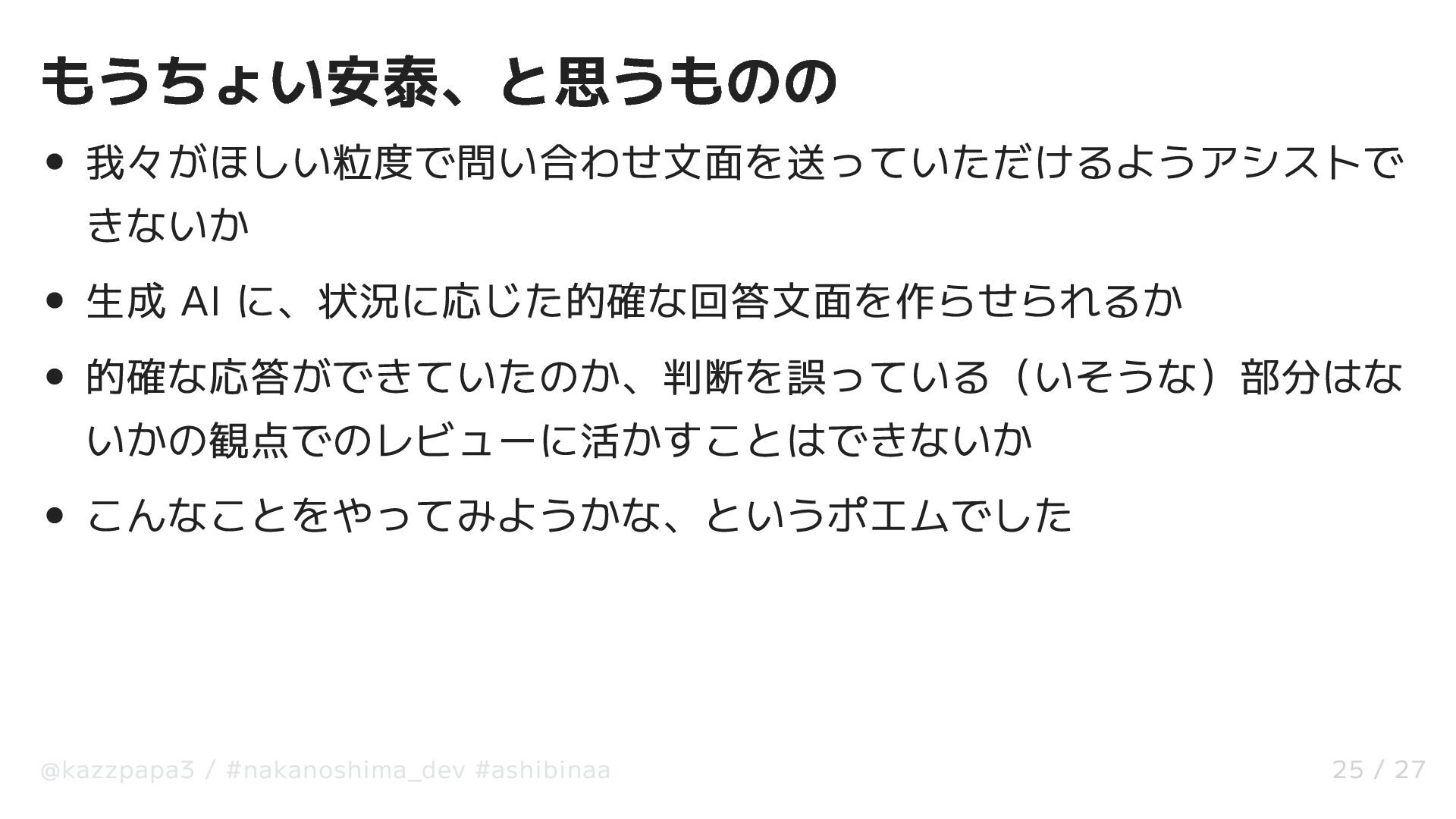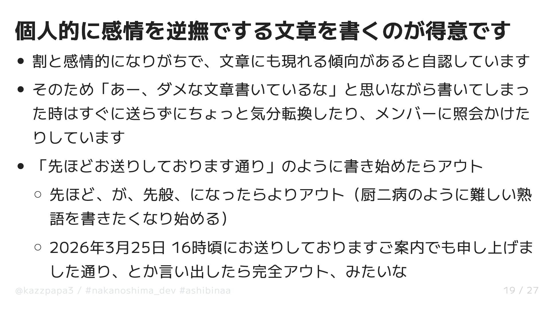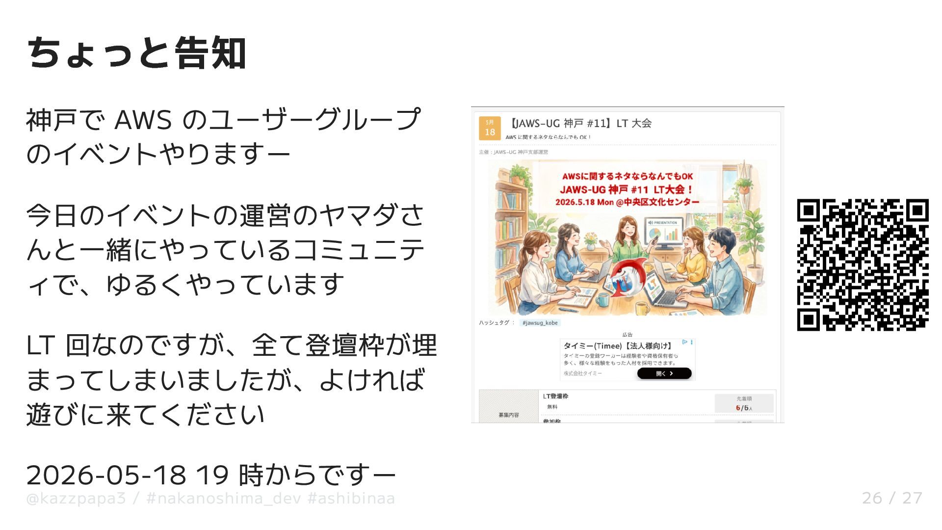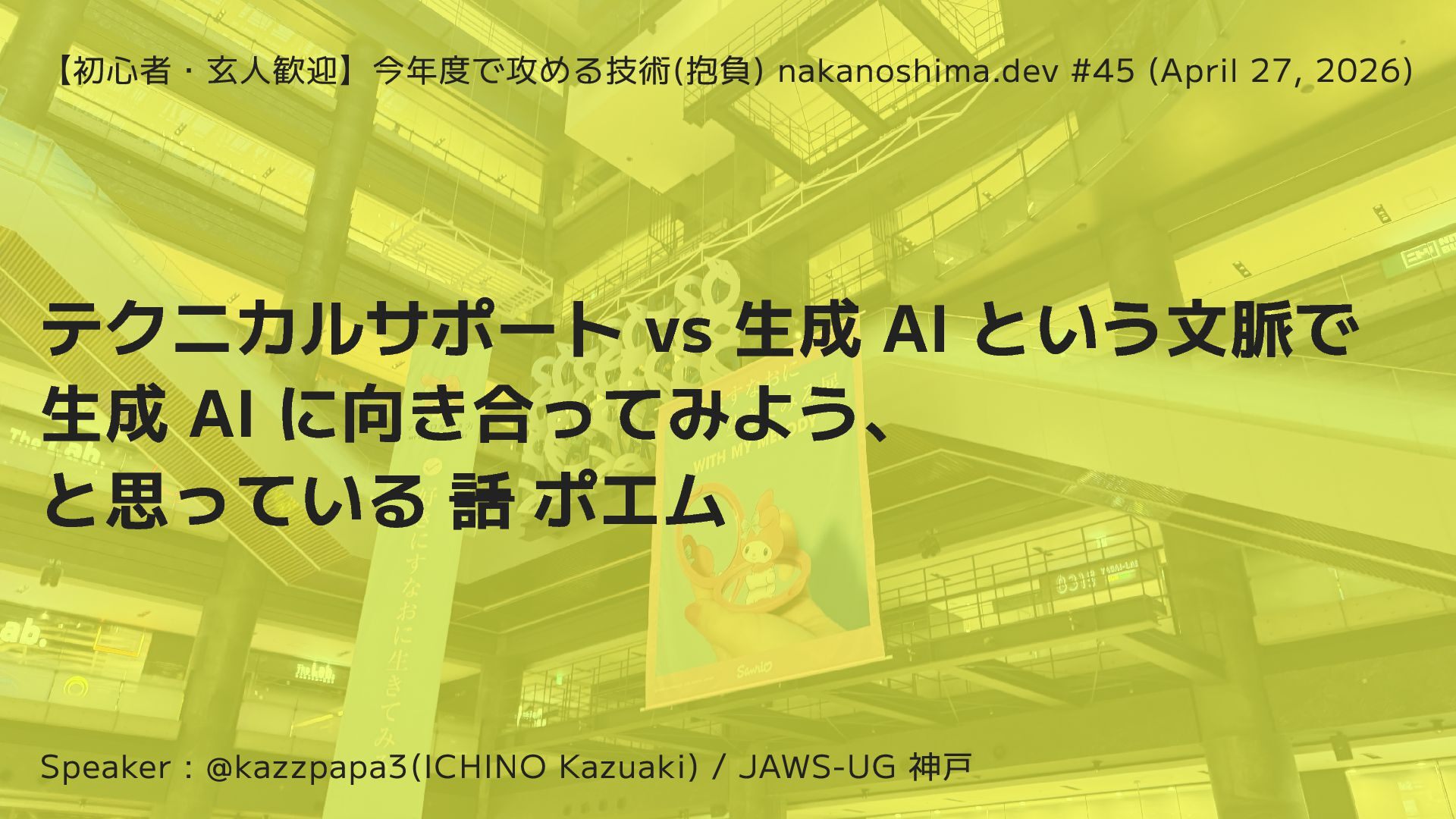 2026年04月27 にアールスリーインスティテュートさんの gusuku Ashibinaa OSAKA で行われた「【初心者・玄人歓迎】今年度で攻める技術(抱負) nakanoshima.dev #45」でお話しした際の資料です。