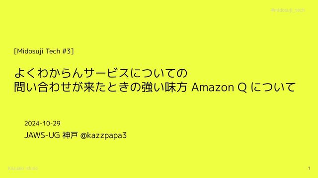 「よくわからんサービスについての問い合わせが来たときの強い味方 Amazon Q について」と題して自分の守備範囲外のサービスなどに問い合わせを受けた場合に、AWS マネージメントコンソールに生えている Amazon Q Developer を利用した公式ドキュメント探しの例をお話ししました。