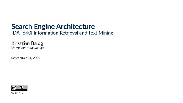 components, the interfaces provided by those components, and the relationships between them ◦ Describes a system at a particular level of abstraction • Architecture of a search engine determined by 2 requirements ◦ Effectiveness (quality of results) ◦ Efficiency (response time and throughput) • Two main processes: ◦ Indexing (offline) ◦ Querying (online) 13 / 32