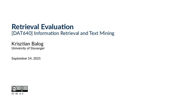 often normalized by comparing the DCG at each rank with the DCG value for the perfect (ideal) ranking ◦ I.e., divide DCG@i value with the ideal DCG value at rank i ◦ Yields value between 0 and 1 43 / 54