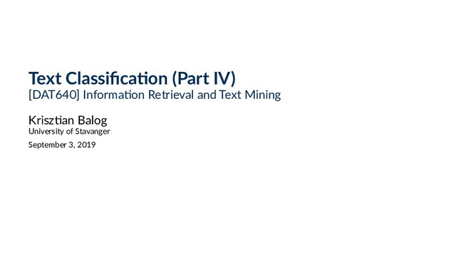 1. Text Classifica on (Part IV) [DAT640] Informa on Retrieval and