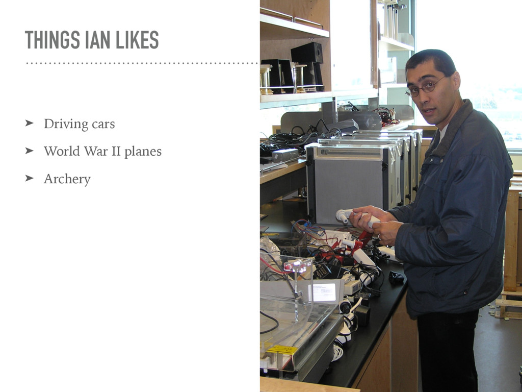 foosball ➤ Writes code faster than is humanly possible* ➤ Shares my sense of humour ➤ Has a unique perspective on the importance of calendars ➤ Gifted communicator ➤ Enthusiastic, kind, and generous supporter to all in his lab * does not include comments!