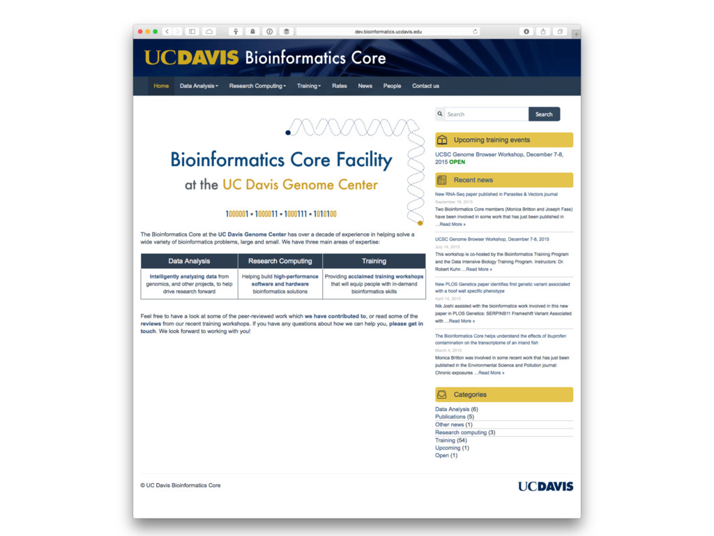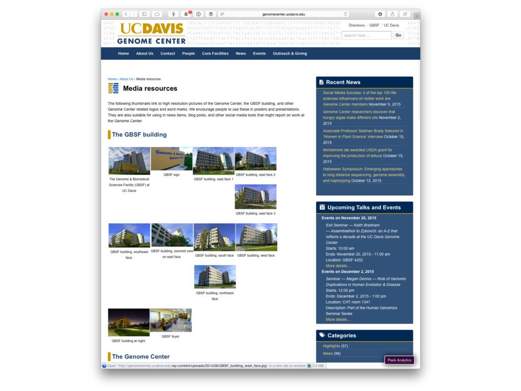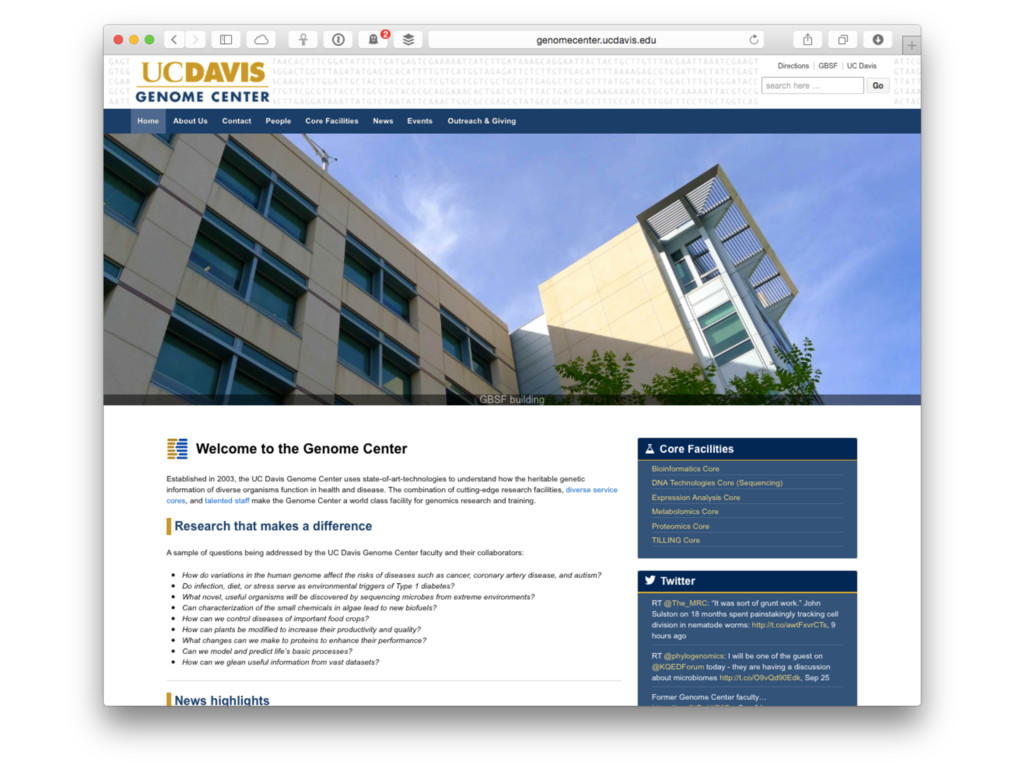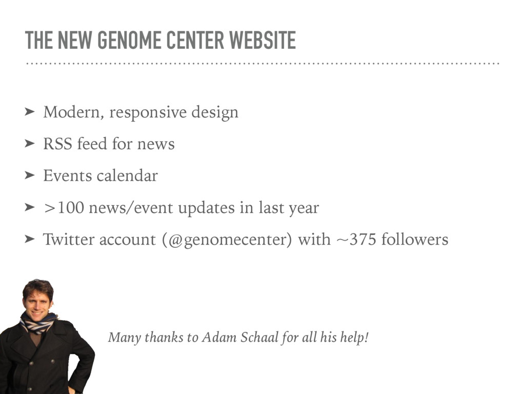 RSS feed for news ➤ Events calendar ➤ >100 news/event updates in last year ➤ Twitter account (@genomecenter) with ~375 followers Many thanks to Adam Schaal for all his help!