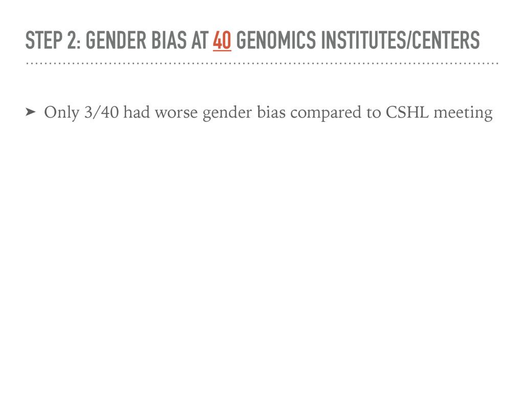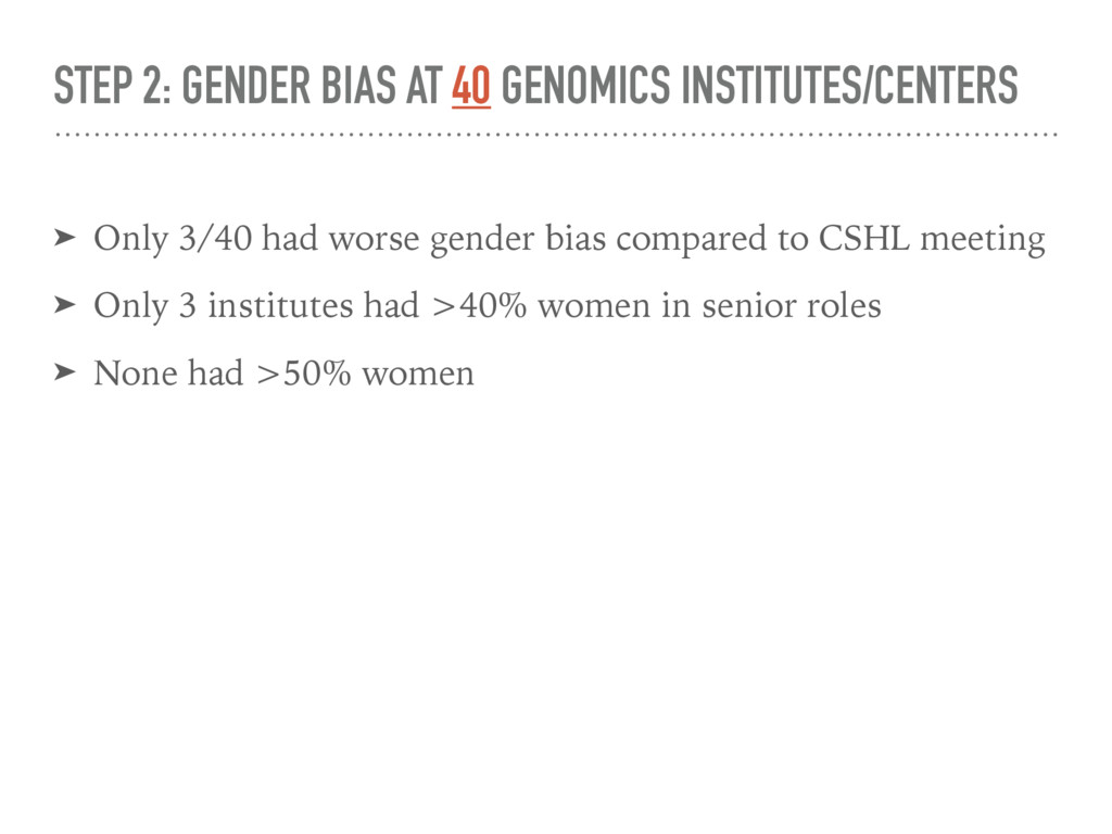 3/40 had worse gender bias compared to CSHL meeting ➤ Only 3 institutes had >40% women in senior roles ➤ None had >50% women ➤ Average proportion of women in senior research roles: