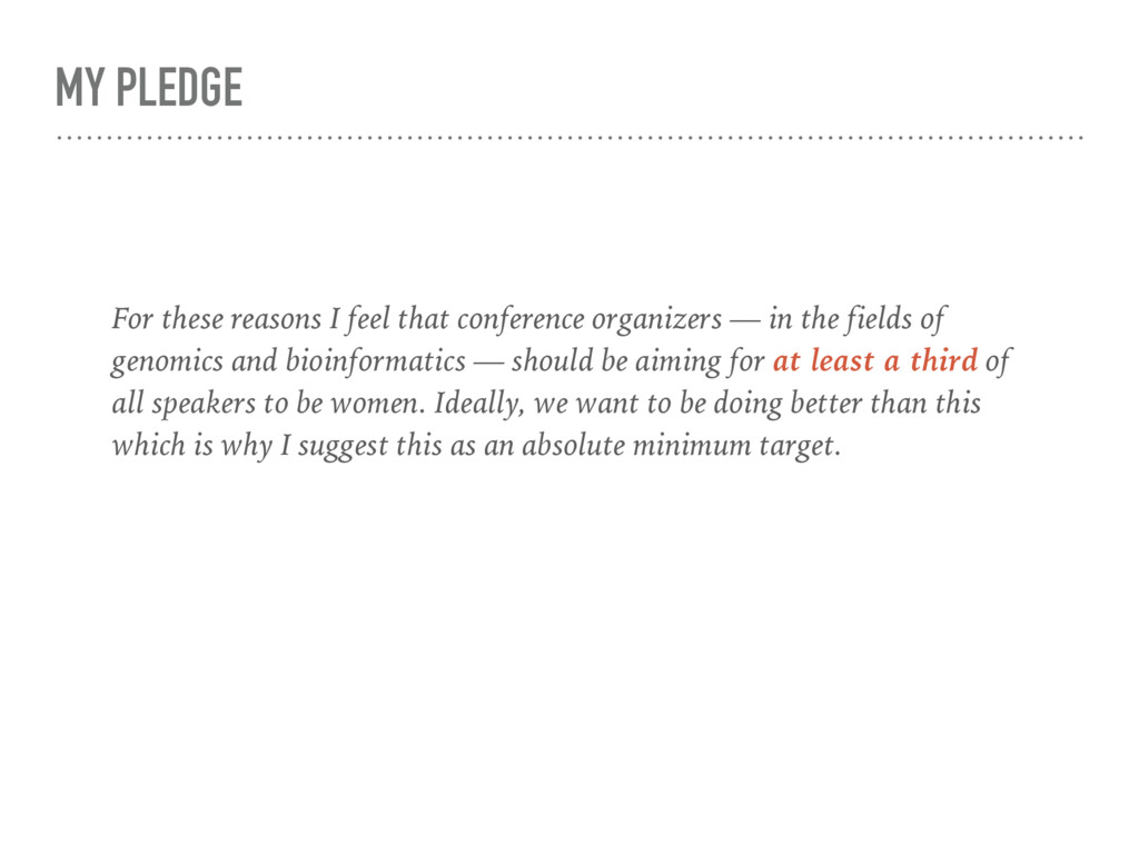— in the fields of genomics and bioinformatics — should be aiming for at least a third of all speakers to be women. Ideally, we want to be doing better than this which is why I suggest this as an absolute minimum target. I don't attend many conferences, but from now on I won't be attending any if at least 33% of the talks are not by women.