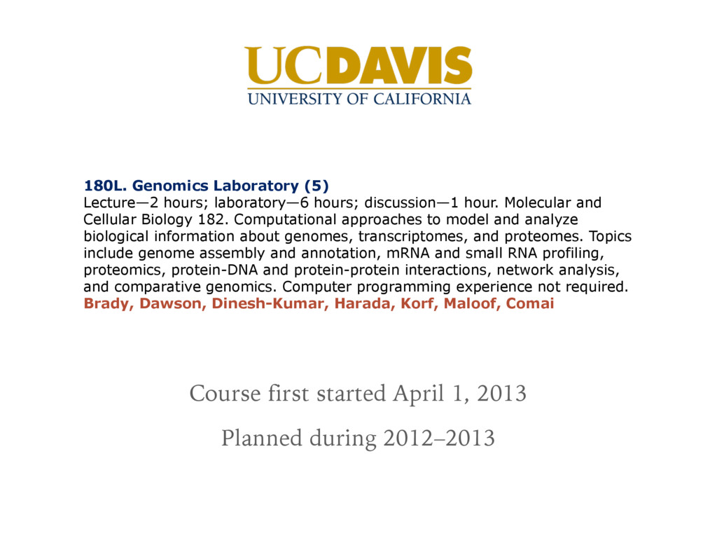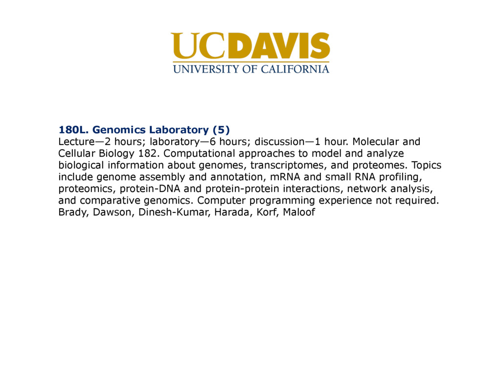 Molecular and Cellular Biology 182. Computational approaches to model and analyze biological information about genomes, transcriptomes, and proteomes. Topics include genome assembly and annotation, mRNA and small RNA profiling, proteomics, protein-DNA and protein-protein interactions, network analysis, and comparative genomics. Computer programming experience not required. Brady, Dawson, Dinesh-Kumar, Harada, Korf, Maloof, Comai Course first started April 1, 2013 Planned during 2012–2013